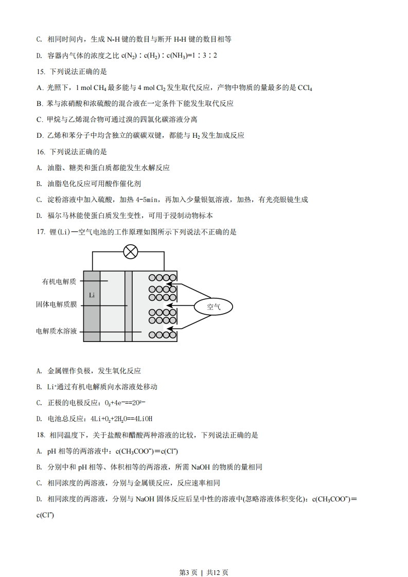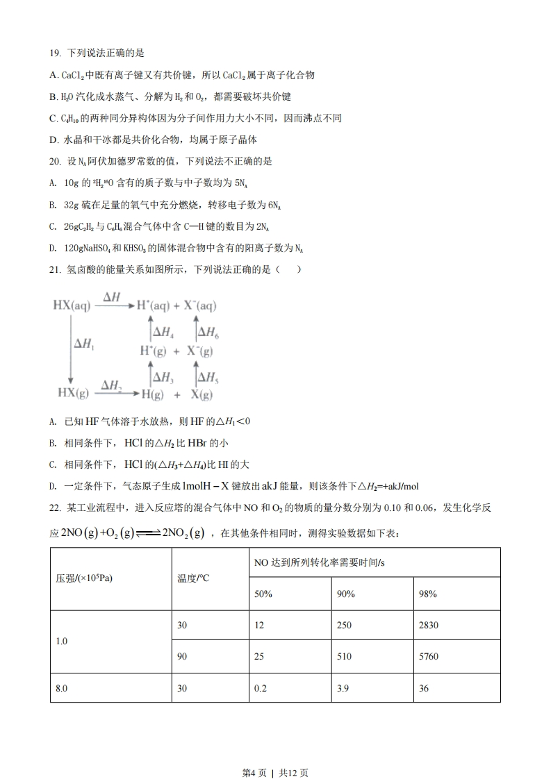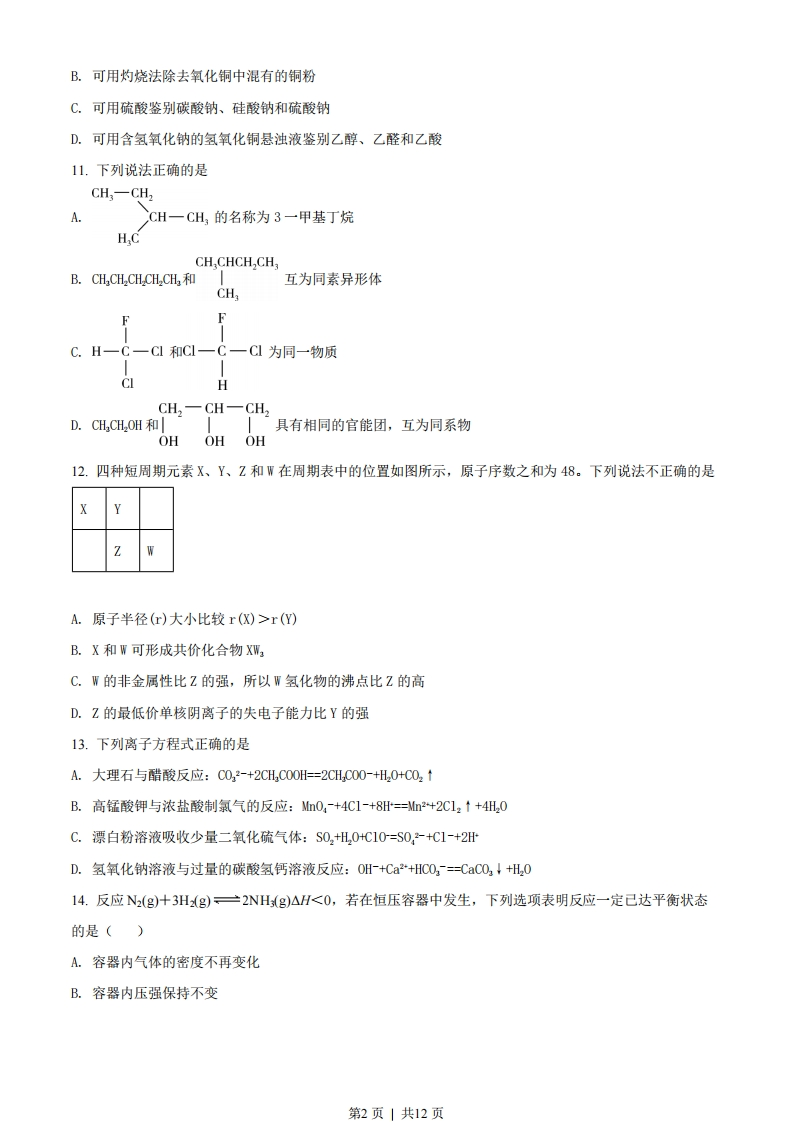 浙江省普通高校招生选考科目2018年4月考试化学试题1.下列属于酸的是A.HNOB.CaCOaC.C02D.NaOH2.下列仪器名称为“漏斗”的是C.3.下列属于电解质的是A.氯化钠B.蔗糖C.氯气D.铁4.下列物质溶于水后溶液显酸性的是A.KCIB.NazOC.NH.CID.CH;COONa5.下列属于物理变化的是A.煤的气化B.天然气的燃烧C.烃的裂解D.石油的分馏6.下列说法不正确的是A.纯碱可用于去除物品表面的油污B.二氧化碳可用作镁燃烧的灭火剂C.植物秸秆可用于制造酒精D.氢氧化铁胶体可用作净水剂7.下列变化过程中,加入氧化剂才能实现的是A.C12→C1B.I→I2C.S02→S02D.CuO→Cu8.下列表示正确的是人黄原子给构示意国@》B.乙炔的结构简式CHCHC.乙烯的球棍模型■0D.NaCl的电子式Na:Cl:o9.下列反应中能产生二氧化硫的是A.氧化铜和稀硫酸反应B.亚硫酸钠和氧气反应C.三氧化硫和水反应D.铜和热的浓硫酸反应10.下列操作或试剂的选择不合理的是A.可用蒸发结晶的方法从碘水中提取碘单质第1页」共12页B.可用灼烧法除去氧化铜中混有的铜粉C.可用硫酸鉴别碳酸钠、硅酸钠和硫酸钠D.可用含氢氧化钠的氢氧化铜悬浊液鉴别乙醇、乙醛和乙酸11.下列说法正确的是CH,一CH2A.CH一CH的名称为3一甲基丁烷H.CCH CHCH,CHB.CHCH2CHCH2CH2和互为同素异形体CHFFC.H一C一Cl和Cl一C一Cl为同一物质CHCH2一CH一CH2D.CH,CH.OH和具有相同的官能团,互为同系物OHOHOH12.四种短周期元素X、Y、Z和W在周期表中的位置如图所示,原子序数之和为48。下列说法不正确的是YA.原子半径(r)大小比较r(X)>r(Y)B.X和W可形成共价化合物XW2C.W的非金属性比Z的强,所以W氢化物的沸点比Z的高D.Z的最低价单核阴离子的失电子能力比Y的强13.下列离子方程式正确的是A.大理石与醋酸反应:C0,2-+2CH,C00H=2CH,C00-+H20+C02↑B.高锰酸钾与浓盐酸制氯气的反应:M0,~+4C1-+8H==n2+2C12↑+4H20C.漂白粉溶液吸收少量二氧化硫气体:S0,+H,0+C10=S0,2-+C1-+2册D.氢氧化钠溶液与过量的碳酸氢钙溶液反应:0H-+Ca2+HC02ˉ=CC02!+H014.反应N2(g)十3H(g)一2NH(g)△H<0,若在恒压容器中发生,下列选项表明反应一定己达平衡状态的是()A.容器内气体的密度不再变化B.容器内压强保持不变第2页」共12页C.相同时间内,生成N-H键的数目与断开HH键的数目相等D.容器内气体的浓度之比c(N):c(H2):cNH)=1:3:215.下列说法正确的是A.光照下,1 mol CH.最多能与4 mol Cl2发生取代反应,产物中物质的量最多的是CCl4B.苯与浓硝酸和浓硫酸的混合液在一定条件下能发生取代反应C.甲烷与乙烯混合物可通过溴的四氯化碳溶液分离D.乙烯和苯分子中均含独立的碳碳双键,都能与H2发生加成反应16.下列说法正确的是A.油脂、糖类和蛋白质都能发生水解反应B.油脂皂化反应可用酸作催化剂C.淀粉溶液中加入硫酸,加热4-5mi,再加入少量银氨溶液,加热,有光亮银镜生成D.福尔马林能使蛋白质发生变性,可用于浸制动物标本17.锂()一空气电池的工作原理如图所示下列说法不正确的是有机电解质Li固体电解质膜888匆空气电解质水溶液000A.金属锂作负极,发生氧化反应B.L通过有机电解质向水溶液处移动C.正极的电极反应:0+4e=202-D.电池总反应:4Li+0,+2H,0=4Li0H18.相同温度下,关于盐酸和醋酸两种溶液的比较,下列说法正确的是A.pH相等的两溶液中:c(CH3COO)=c(C门B.分别中和pH相等、体积相等的两溶液,所需NaOH的物质的量相同C.相同浓度的两溶液,分别与金属镁反应,反应速率相同D.相同浓度的两溶液,分别与NOH固体反应后呈中性的溶液中(忽略溶液体积变化):c(CH,COO)=c(CD第3页」共12页
