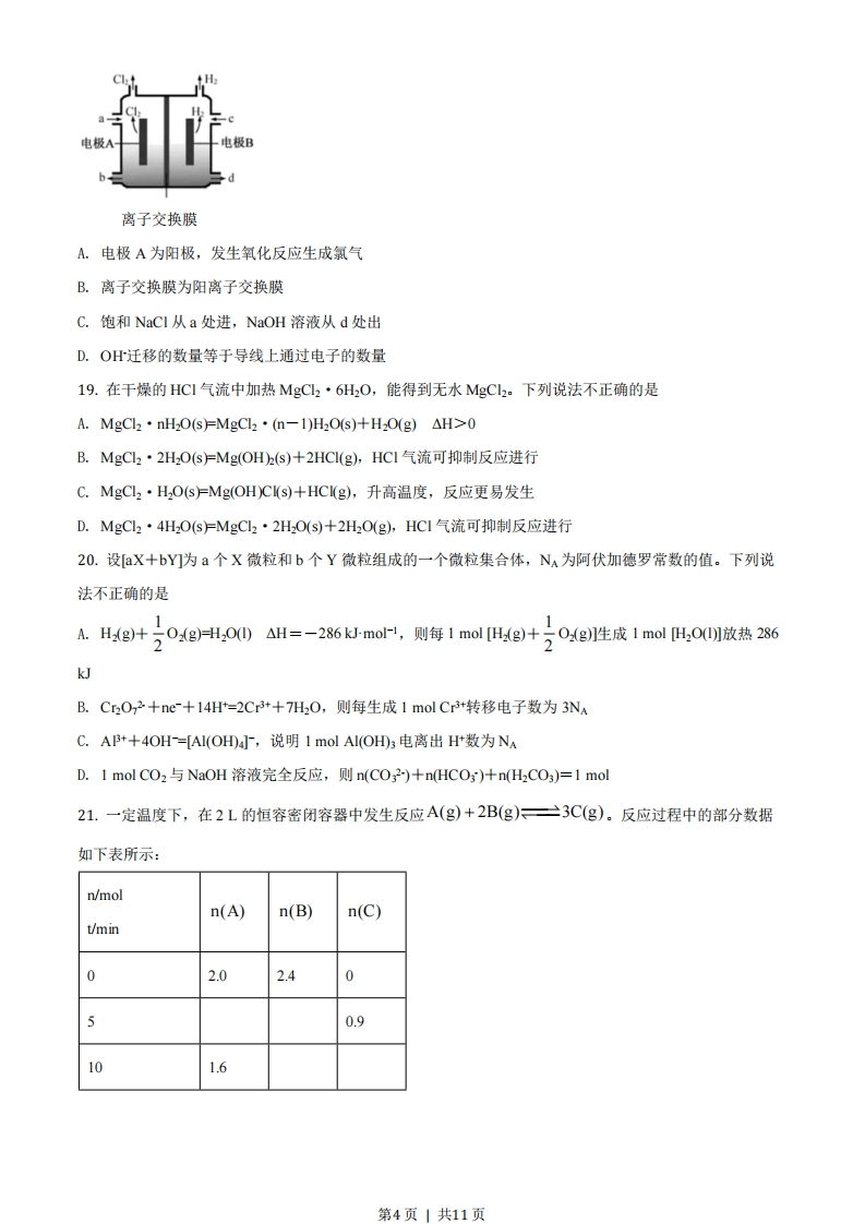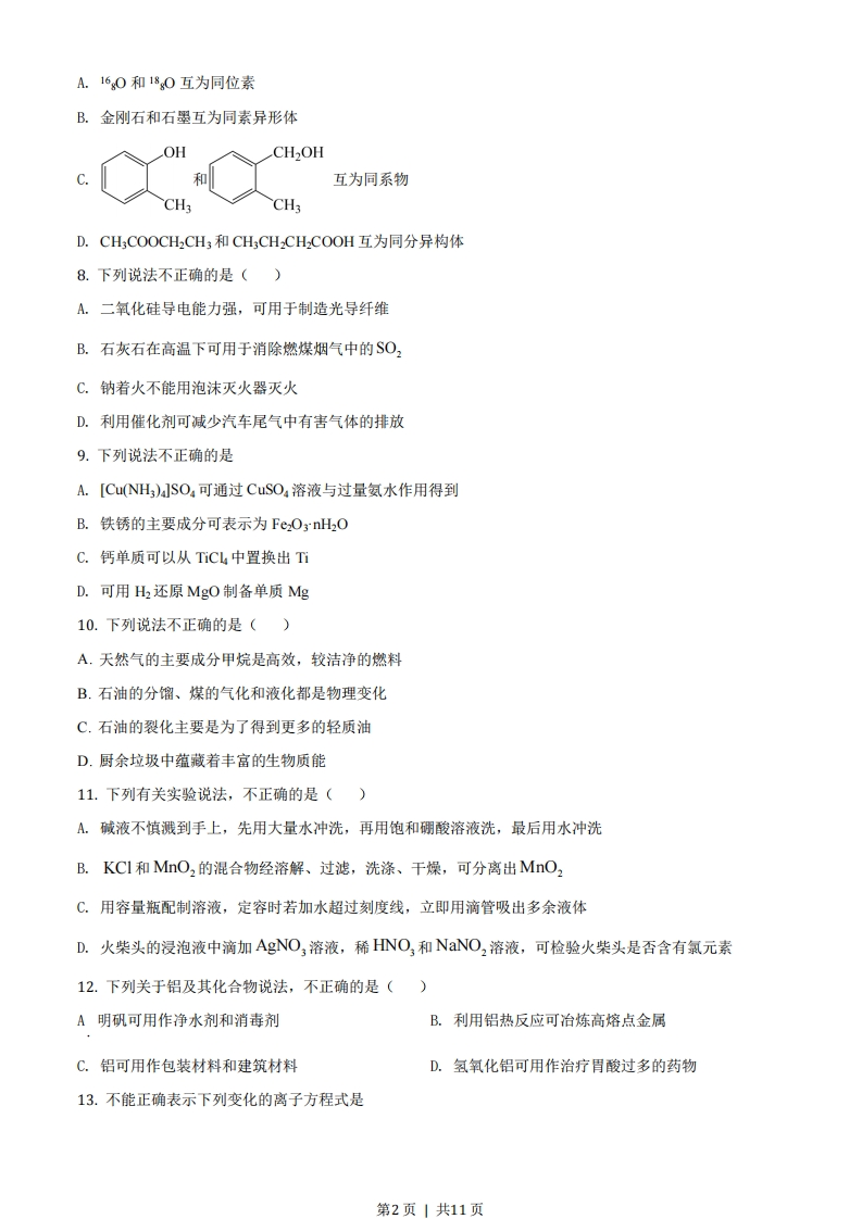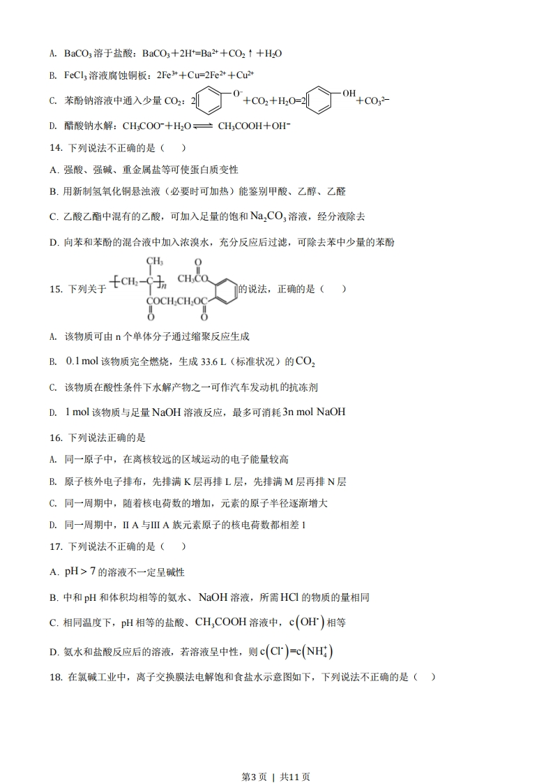 2020年1月浙江省普通高校招生选考科目考试化学试题可能用到的相对原子质量:H1Li7C12N14016Na23Mg24Al27Si28S32C35.5K39Ca40Mn55Fe56Cu64I127Ba137选择题部分一、选择题(本大题共25小题,每小题2分,共50分。每个小题列出的四个备选项中只有一个是符合题目要求的,不选、多选、错选均不得分)1.有共价键的离子化合物是()A.Na2O2B.HSOC.CH,CLD.SiC2.萃取碘水中的碘并分液,需要用到的仪器是()73.下列属于有机物,又是电解质的是()A.己烷B.乙酸C.葡萄糖D.纯碱△4.反应MnO2+4HCl(浓)=MnCl2+Cl2↑+2H20中,氧化产物是A.MnO2B.HCIC.MnCl,D.Cl25.下列物质的名称不正确的是A.NaOH:烧碱B.FeSO4:绿矾CH2OHCH3CH2CHCH2CH2CH3C.CHOH:甘油D.:3-甲基己烷CH3CH2OH6.下列表示不正确的是A.羟基的电子式:0HB.乙烯的结构简式:CH2CH2C.氯原子的结构示意图D.NH3分子的球棍模型:C7.下列说法不正确的是第1页1共11页A.160和180互为同位素B.金刚石和石墨互为同素异形体OHCH2OH和互为同系物CH3CH3D.CH3COOCH2CH3和CHCH2CH2COOH互为同分异构体8.下列说法不正确的是()A.二氧化硅导电能力强,可用于制造光导纤维B.石灰石在高温下可用于消除燃煤烟气中的SO,C.钠着火不能用泡沫灭火器灭火D.利用催化剂可减少汽车尾气中有害气体的排放9.下列说法不正确的是A.[Cu(NH)]SO,可通过CuSO4溶液与过量氨水作用得到B.铁锈的主要成分可表示为FezO3nHOC.钙单质可以从TCL中置换出TD.可用H2还原MgO制备单质Mg10.下列说法不正确的是()A.天然气的主要成分甲烷是高效,较洁净的燃料B.石油的分馏、煤的气化和液化都是物理变化C.石油的裂化主要是为了得到更多的轻质油D.厨余垃圾中蕴藏着丰富的生物质能11.下列有关实验说法,不正确的是()A.碱液不慎溅到手上,先用大量水冲洗,再用饱和硼酸溶液洗,最后用水冲洗B.KCI和MnO2的混合物经溶解、过滤,洗涤、干燥,可分离出MnO2C.用容量瓶配制溶液,定容时若加水超过刻度线,立即用滴管吸出多余液体D.火柴头的浸泡液中滴加AgNO3溶液,稀HNO3和NNO2溶液,可检验火柴头是否含有氯元素12.下列关于铝及其化合物说法,不正确的是()A明矾可用作净水剂和消毒剂B.利用铝热反应可冶炼高熔点金属C.铝可用作包装材料和建筑材料D.氢氧化铝可用作治疗胃酸过多的药物13.不能正确表示下列变化的离子方程式是第2页1共11页A.BaCO3溶于盐酸:BaCO3+2Ht=Ba2++CO2↑+H20B.FeCl3溶液腐蚀铜板:2Fe3t+Cu=2Fe2++Cu2+0C.苯酚钠溶液中通入少量C02:2+C02+H20=20H+C0D.醋酸钠水解:CHCOO+H2O=CH3COOH+OH14.下列说法不正确的是()A.强酸、强碱、重金属盐等可使蛋白质变性B.用新制氢氧化铜悬浊液(必要时可加热)能鉴别甲酸、乙醇、乙醛C.乙酸乙酯中混有的乙酸,可加入足量的饱和Na,CO3溶液,经分液除去D.向苯和苯酚的混合液中加入浓溴水,充分反应后过滤,可除去苯中少量的苯酚CHCH.CO15.下列关于的说法,正确的是()A.该物质可由n个单体分子通过缩聚反应生成B.0.1mol该物质完全燃烧,生成33.6L(标准状况)的C02C.该物质在酸性条件下水解产物之一可作汽车发动机的抗冻剂D.1mol该物质与足量NaOH溶液反应,最多可消耗3 n mol NaOH16.下列说法正确的是A.同一原子中,在离核较远的区域运动的电子能量较高B.原子核外电子排布,先排满K层再排L层,先排满M层再排N层C.同一周期中,随着核电荷数的增加,元素的原子半径逐渐增大D.同一周期中,ⅡA与ⅢA族元素原子的核电荷数都相差117.下列说法不正确的是()A.pH>7的溶液不一定呈碱性B.中和pH和体积均相等的氨水、NaOH溶液,所需HCI的物质的量相同C.相同温度下,pH相等的盐酸、CH,COOH溶液中,C(OH)相等D.氨水和盐酸反应后的溶液,若溶液呈中性,则c(C)=c(NH)18.在氯碱工业中,离子交换膜法电解饱和食盐水示意图如下,下列说法不正确的是()第3页1共11页
