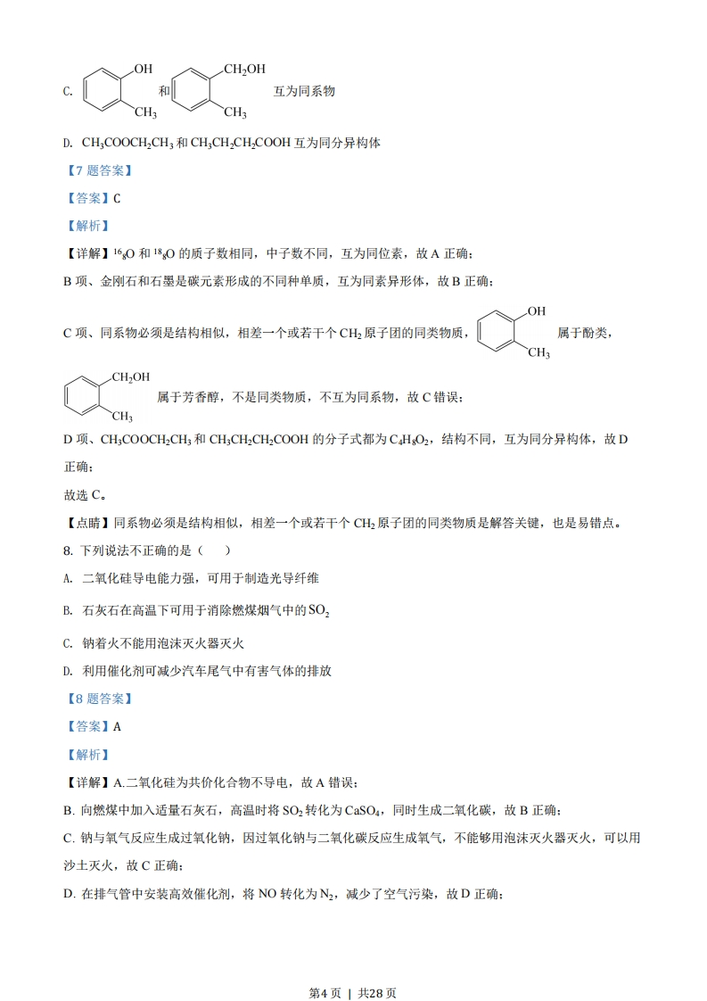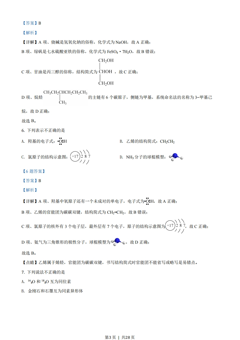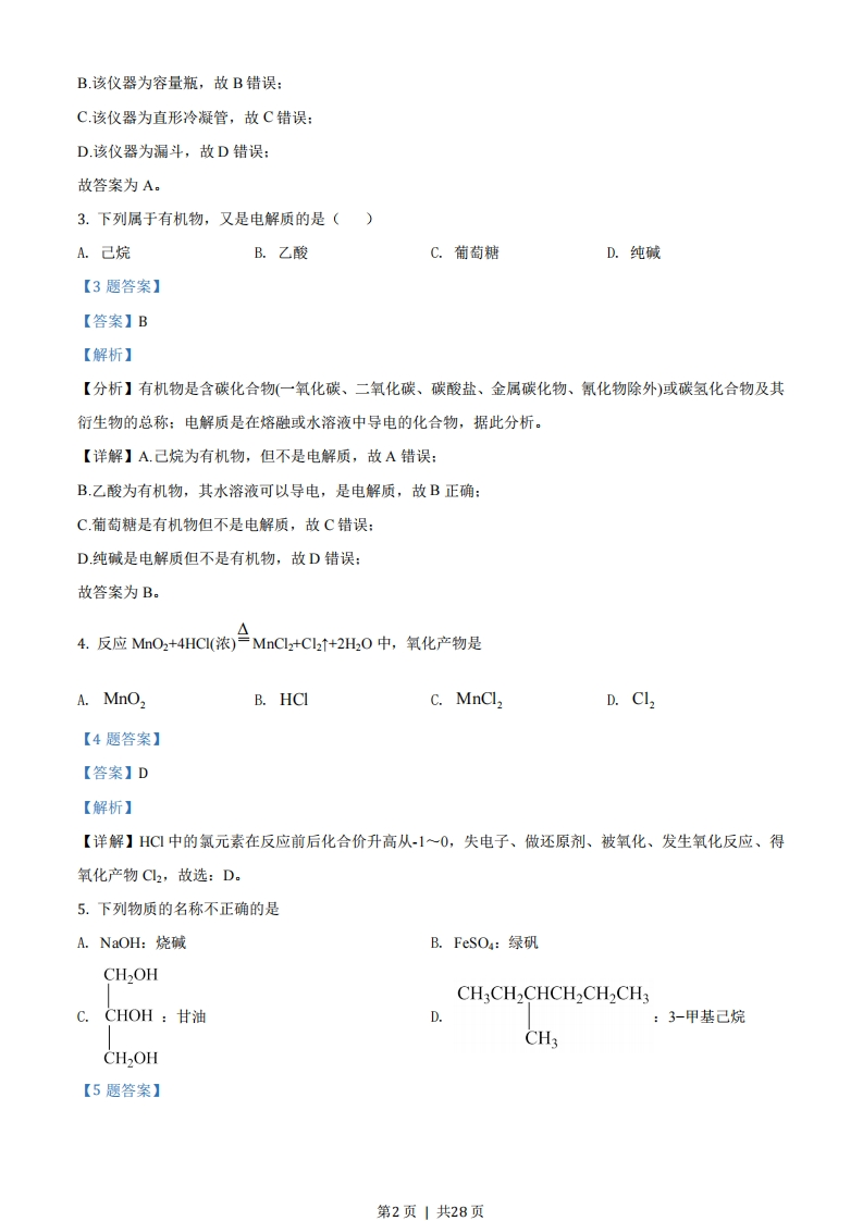 2020年1月浙江省普通高校招生选考科目考试化学试题可能用到的相对原子质量:H1Li7C12N14016Na23Mg24Al27Si28S32C35.5K39Ca40Mn55Fe56Cu64I127Ba137选择题部分一、选择题(本大题共25小题,每小题2分,共50分。每个小题列出的四个备选项中只有一个是符合题目要求的,不选、多选、错选均不得分)1.有共价键的离子化合物是()A.Na2O2B.HSOC.CH,CL,D.SiC【1题答案】【答案】A【解析】【分析】活泼金属和活泼非金属元素之间易形成离子键,非金属元素之间易形成共价键,含有离子键的化合物是离子化合物,离子化合物中可能含有共价键,据此分析解答。【详解】A.N,O2中钠离子与过氧根之间为离子键,故为离子化合物,过氧根中氧原子之间为共价键,故A正确:B.硫酸为只含共价键的共价化合物,故B错误:C.二氯甲烷为只含共价键的共价化合物,故C错误:D.碳化硅为只含共价键的共价化合物,故D错误:故答案为A。2.萃取碘水中的碘并分液,需要用到的仪器是()【2题答案】【答案】A【解析】【详解】萃取碘水中的碘并分液,需要用到的仪器是分液漏斗:A该仪器为分液漏斗,故A正确:第1页1共28页B.该仪器为容量瓶,故B错误:C该仪器为直形冷凝管,故C错误:D.该仪器为漏斗,故D错误:故答案为A。3.下列属于有机物,又是电解质的是()A.己烷B.乙酸C.葡萄糖D.纯碱【3题答案】【答案】B【解析】【分析】有机物是含碳化合物(一氧化碳、二氧化碳、碳酸盐、金属碳化物、氰化物除外)或碳氢化合物及其衍生物的总称:电解质是在熔融或水溶液中导电的化合物,据此分析。【详解】A己烷为有机物,但不是电解质,故A错误:B.乙酸为有机物,其水溶液可以导电,是电解质,故B正确:C葡萄糖是有机物但不是电解质,故C错误:D.纯碱是电解质但不是有机物,故D错误:故答案为B。△4.反应MnO2+4HCl(浓)=MnCl2+Cl2↑+2H20中,氧化产物是A.MnO,B.HCIC.MnCl,D.C12【4题答案】【答案】D【解析】【详解】HC中的氯元素在反应前后化合价升高从-1~0,失电子、做还原剂、被氧化、发生氧化反应、得氧化产物C2,故选:D。5.下列物质的名称不正确的是A.NaOH:烧碱B.FeSO4:绿矾CH2OHCH3CH2CHCH2CH2CH3C.CHOH:甘油D.:3-甲基己烷CH:CH>OH【5题答案】第2页1共28页【答案】B【解析】【详解】A项、烧碱是氢氧化钠的俗称,化学式为NaOH,故A正确:B项、绿矾是七水硫酸亚铁的俗称,化学式为FSO4·7H2O,故B错误:CH2OHC项、甘油是丙三醇的俗称,结构简式为CHOH,故C正确:CH>OHCHCH2CHCH2CH,CHD项、烷烃的主链有6个碳原子,侧链为甲基,系统命名法的名称为3-甲基己CH3烷,故D正确:故选B。6.下列表示不正确的是A.羟基的电子式:OHB.乙烯的结构简式:CH2CH2C.氯原子的结构示意图:D.NH分子的球棍模型:C鲁【6题答案】【答案】B【解析】【详解】A项、羟基中氧原子还有一个未成对的单电子,电子式为OH,故A正确:B项、乙烯的官能团为碳碳双键,结构简式为CH2CH2,故B错误:C项、氯原子的核外有3个电子层,最外层有7个电子,原子的结构示意图为故C正确:D项、氨气为三角锥形的极性分子,球棍模型为急,故D正确:故选B。【点睛】乙烯属于烯烃,官能团为碳碳双键,书写结构简式时官能团不能省写或略写是易错点。7.下列说法不正确的是A.16g0和180互为同位素B.金刚石和石墨互为同素异形体第3页1共28页