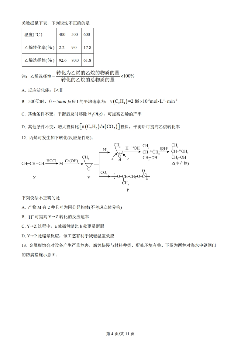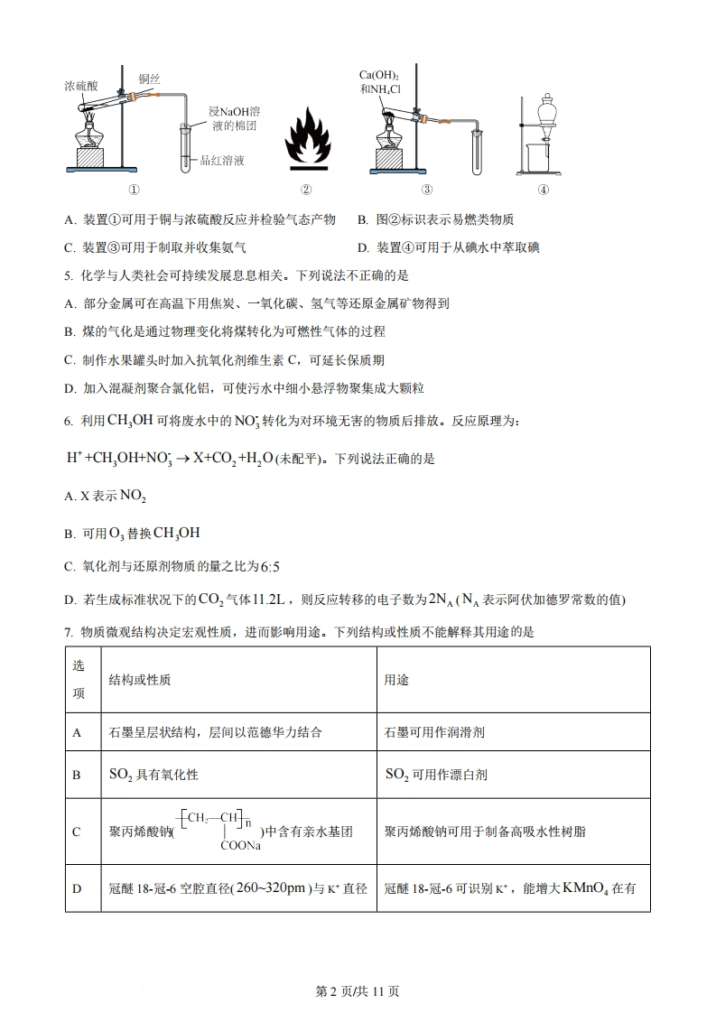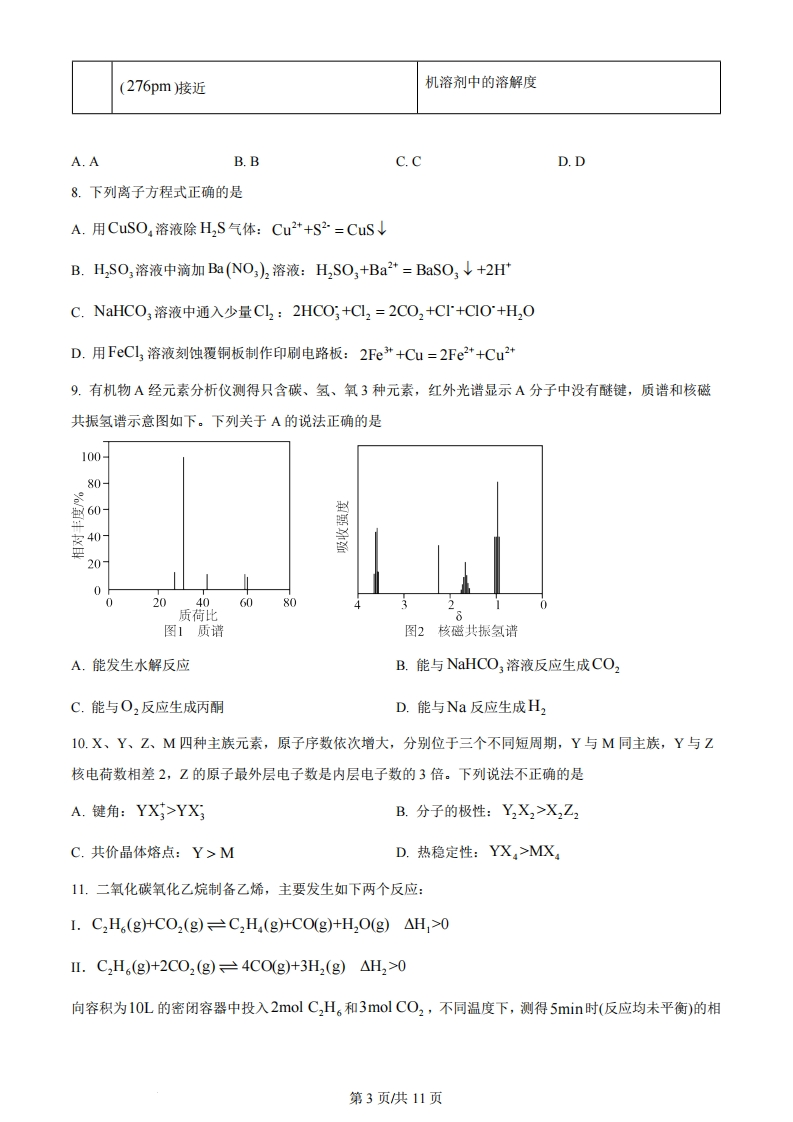 绝密★启用前2024年6月浙江省普通高校招生选考科目考试化学本试题卷分选择题和非选择题两部分,共8页,满分100分,考试时间90分钟。考生注意:1.答题前,请务必将自己的姓名、准考证号用黑色字迹的签字笔或钢笔分别填写在试题卷和答题纸规定的位置上。2.答题时,请按照答题纸上“注意事项”的要求,在答题纸相应的位置上规范作答,在本试题卷上的作答一律无效。3.非选择题的答案必须使用黑色字迹的签字笔或钢笔写在答题纸上相应区域内,作图时可先使用2B铅笔,确定后必须使用黑色字迹的签字笔或钢笔描黑。4.可能用到的相对原子质量:H1B11C12N14016Na23Mg24A127Si28P31S32C135.5K39Ca40Fe56Cu64Br80Ag108I127Ba137选择题部分一、选释题(本大题共16小题,每小题3分,共48分。每小题列出的四个备选项中只有一个是符合题目要求的,不选、多选、错选均不得分)1.按物质组成分类,K9(S02·12H0属于A.酸B.碱C.盐D.混合物2.下列说法不正确的是A.A1(OD3呈两性,不能用于治疗胃酸过多B.Na,O2能与CO2反应产生O2,可作供氧剂C.FeO有还原性,能被氧化成Fe,O,D.HNO3见光易分解,应保存在棕色试剂瓶中3.下列表示不正确的是A.C0,的电子式:O:C:0B.CL2中共价键的电子云图:C.NH3的空间填充模型:D.3,3-二甲基戊烷的键线式:XC4.下列说法不正确的是第1页供11页铜丝Ca(OH)浓硫酸HINH.CI浸NaOH溶液的棉团品红溶液①③A.装置①可用于铜与浓硫酸反应并检验气态产物B.图②标识表示易燃类物质C.装置③可用于制取并收集氨气D.装置④可用于从碘水中萃取碘5.化学与人类社会可持续发展息息相关。下列说法不正确的是A.部分金属可在高温下用焦炭、一氧化碳、氢气等还原金属矿物得到B.煤的气化是通过物理变化将煤转化为可燃性气体的过程C.制作水果罐头时加入抗氧化剂维生素C,可延长保质期D.加入混凝剂聚合氯化铝,可使污水中细小悬浮物聚集成大颗粒6.利用CH,OH可将废水中的NO;转化为对环境无害的物质后排放。反应原理为:H+CH,OH+NO,→X+CO,+H,O(未配平)。下列说法正确的是A.X表示NO2B.可用O3替换CH,OHC.氧化剂与还原剂物质的量之比为6:5D.若生成标准状况下的CO2气体11.2L,则反应转移的电子数为2N(N表示阿伏加德罗常数的值)7.物质微观结构决定宏观性质,进而影响用途。下列结构或性质不能解释其用途的是选结构或性质用途项A石墨呈层状结构,层间以范德华力结合石墨可用作润滑剂BSO2具有氧化性S02可用作漂白剂[CH:CH聚丙烯酸钠)中含有亲水基团聚丙烯酸钠可用于制备高吸水性树脂COONaD冠醚18-冠-6空腔直径(260-320pm)与K直径冠醚18-冠-6可识别K*,能增大KMnO4在有第2页供11页(276pm)接近机溶剂中的溶解度A.AB.BC.CD.D8.下列离子方程式正确的是A.用CuSO,溶液除H2S气体:Cu++S2=CuS↓B.H,SO,溶液中滴加Ba(NO3)2溶液:H,SO,+Ba2+=BaSO,↓+2HC.NaHCO3溶液中通入少量Cl2:2HCO;+Cl2=2CO2+CI'+C1O'+H,OD.用FeCl3溶液刻蚀覆铜板制作印刷电路板:2e*+Cu=2Fe2++Cu29.有机物A经元素分析仪测得只含碳、氢、氧3种元素,红外光谱显示A分子中没有醚键,质谱和核磁共振氢谱示意图如下。下列关于A的说法正确的是10080160200020406080质荷比图1质谱图2核磁共振氢谱A.能发生水解反应B.能与NaHCO3溶液反应生成CO2C.能与O2反应生成丙酮D.能与Na反应生成H10.X、Y、Z、M四种主族元素,原子序数依次增大,分别位于三个不同短周期,Y与M同主族,Y与Z核电荷数相差2,Z的原子最外层电子数是内层电子数的3倍。下列说法不正确的是A.键角:YX>YXB.分子的极性:Y2X2>XZ2C.共价晶体熔点:Y>MD.热稳定性:YX,>MX11.二氧化碳氧化乙烷制备乙烯,主要发生如下两个反应:I.C2H(g)+CO2(g)C2H(g)+CO(g)+H,O(g)AH,>0IⅡ.C2H,(g)+2C02(g)=4CO(g)+3H2(g)△H2>0向容积为10L的密闭容器中投入2molC2H。和3 mol CO2,不同温度下,测得5min时(反应均未平衡)的相第3页供11页