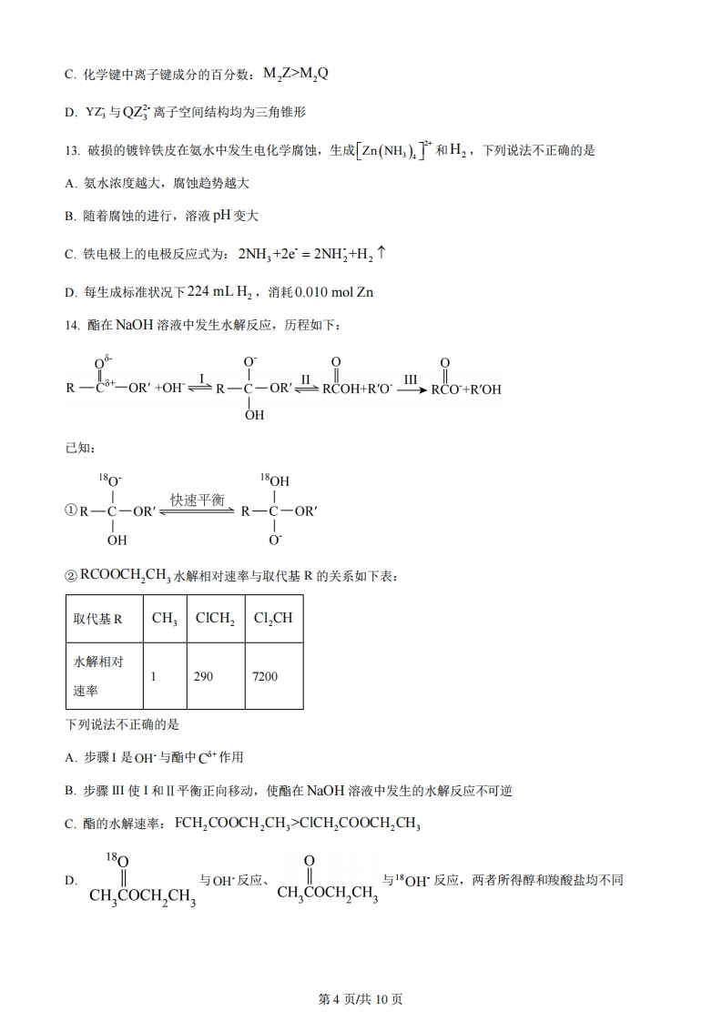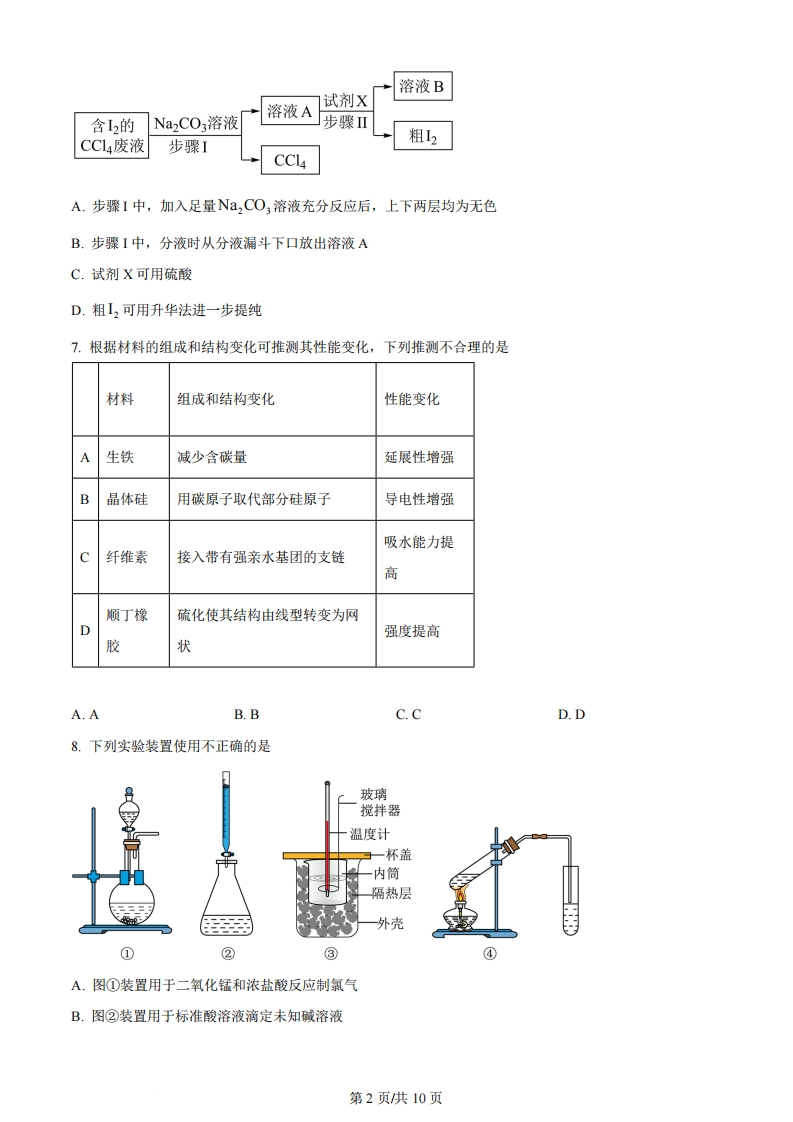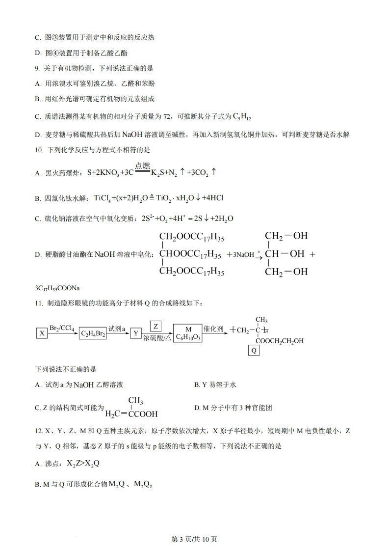 2024年1月浙江省普通高校招生选考科目考试化学试题选择题部分一、选择题(本大题共16小题,每小题3分,共48分,每小题列出的四个备选项中只有一个是符合题目要求的,不选、多选、错选均不得分)1.下列物质不属于电解质的是A.CO,B.HCIC.NaOHD.BaSO2.工业上将C2通入冷的NaOH溶液中制得漂白液,下列说法不正确的是A.漂白液的有效成分是NaCIOB.CIO水解生成HCIO使漂白液呈酸性C.通入CO2后的漂白液消毒能力增强D.NaClO溶液比HClO溶液稳定3.下列表示不正确的是A.中子数为10的氧原子:OB.SO2的价层电子对互斥(VSEPR)模型:C.用电子式表示KC1的形成过程:K中·:→K+日CHCHCH2CHCHD的名称:2-甲基4-乙基戊烷CH CH2CH催化剂。」4.汽车尾气中的NO和CO在催化剂作用下发生反应:2NO+2CO兰2CO2+N2,列说法不正确的是(N为阿伏加德罗常数的值)A.生成1 mol CO2转移电子的数目为2NB.催化剂降低NO与CO反应的活化能C.NO是氧化剂,CO是还原剂D.N2既是氧化产物又是还原产物5.在溶液中能大量共存的离子组是A.Ht、I、Ba2、NOB.Fe、Kt、CN'、CIc.Na、Sio、Br'、Ca2+D.NH、SO、CH,COO'、HCO6.为回收利用含I2的CC,废液,某化学兴趣小组设计方案如下所示,下列说法不正确的是第1页供10页溶液B溶液A试剂X含12的Na2CO3溶液步骤ⅡCCl4废液步骤1粗12CC14A.步骤I中,加入足量N2CO3溶液充分反应后,上下两层均为无色B.步骤I中,分液时从分液漏斗下口放出溶液AC.试剂X可用硫酸D.粗I2可用升华法进一步提纯7.根据材料的组成和结构变化可推测其性能变化,下列推测不合理的是材料组成和结构变化性能变化A生铁减少含碳量延展性增强B晶体硅用碳原子取代部分硅原子导电性增强吸水能力提纤维素接入带有强亲水基团的支链高顺丁橡硫化使其结构由线型转变为网D强度提高胶状A.AB.BC.CD.D8.下列实验装置使用不正确的是玻璃搅拌器温度计一杯盖内简隔热层外壳⊙②⊙A.图①装置用于二氧化锰和浓盐酸反应制氯气B.图②装置用于标准酸溶液滴定未知碱溶液第2页供10页C.图③装置用于测定中和反应的反应热D.图④装置用于制备乙酸乙酯9.关于有机物检测,下列说法正确的是A.用浓溴水可鉴别溴乙烷、乙醛和苯酚B.用红外光谱可确定有机物的元素组成C.质谱法测得某有机物的相对分子质量为72,可推断其分子式为C,H2D.麦芽糖与稀硫酸共热后加NOH溶液调至碱性,再加入新制氢氧化铜并加热,可判断麦芽糖是否水解10.下列化学反应与方程式不相符的是A.黑火药爆炸,S+2KNO,+3C点燃K,5S+N,个+3C0,个B.四氯化钛水解:TiCl,+(x+2)H,O兰TiO,·xH,OV+4HClC.硫化钠溶液在空气中氧化变质:2S2+0,+4H=2S↓+2H,OCH2OOCC17H35CH2-OHD.硬脂酸甘油酯在NaOH溶液中皂化:CHOOCC17H35+3 NaOH CH一OH+CH2OOCC17H35CH2-OH3CnH3sCOONa11.制造隐形眼镜的功能高分子材料Q的合成路线如下:CH3Br2/CCl4MC2H4Br2试剂aY催化剂.十CH2-C方浓硫酸/△C6HoO3COOCH CH2OHQ下列说法不正确的是A.试剂a为NaOH乙醇溶液B.Y易溶于水CH3C.Z的结构简式可能为D.M分子中有3种官能团2C=CCOOH12.X、Y、Z、M和Q五种主族元素,原子序数依次增大,X原子半径最小,短周期中M电负性最小,Z与Y、Q相邻,基态Z原子的s能级与p能级的电子数相等,下列说法不正确的是A.沸点:X2ZDX2QB.M与Q可形成化合物M,Q、MQ2第3页供10页