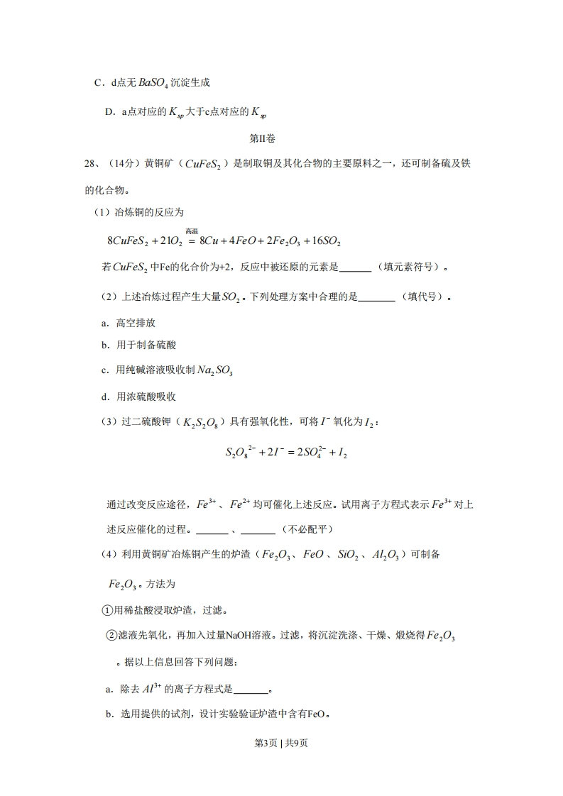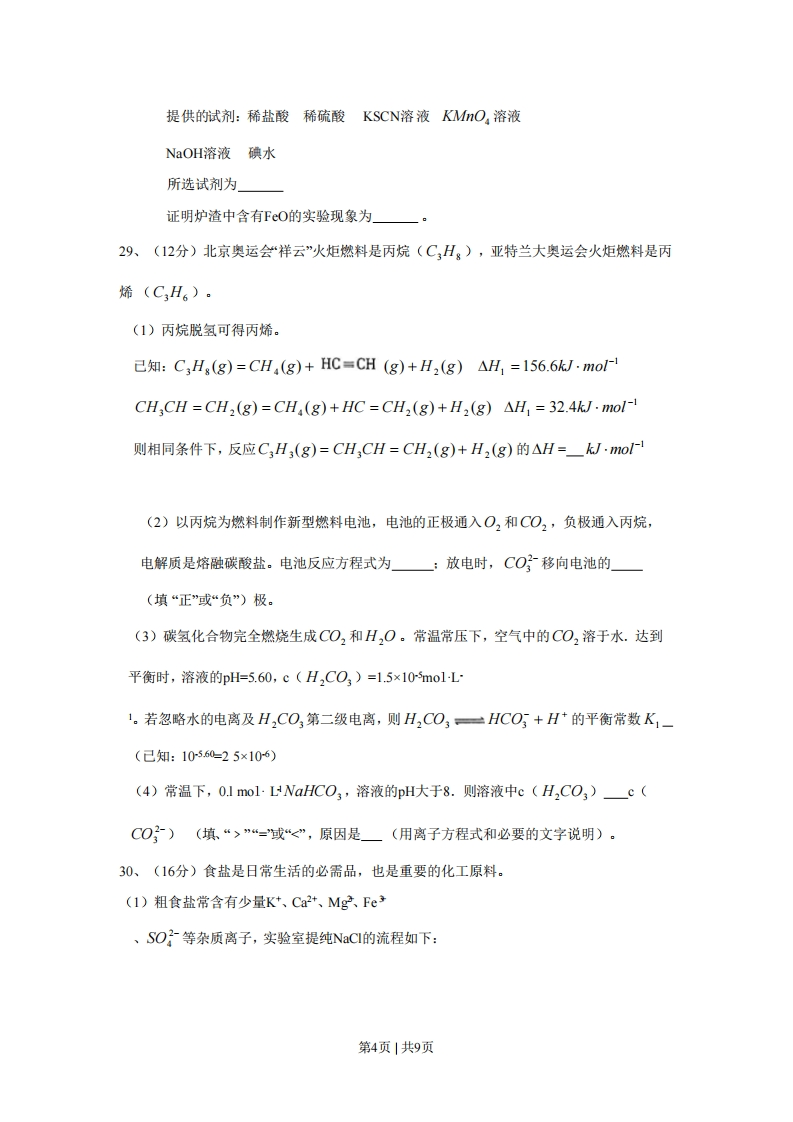 2008年普通高等学校招生全国统一考试(山东卷)理科综合能力测试化学部分第I卷以下数据可供答题时参考:相对原于质量(原子量):H1C2N14016Na23S32C135.5一、选择题9、下列叙述合理的是A.金属材料都是导体,非金属材料都是绝缘体B.棉、麻、丝、毛及合成纤维完全燃烧都只生成CO2和H,OC水电站把机械能转化成电能,而核电站把化学能转化成电能D.我国规定自2008年6月1日起,商家不得无偿提供塑料袋,目的是减少“白色污染”10、下列由事实得出的结论错误的是A.维勒用无机物合成了尿素,突破了无机物与有机物的界限B、门捷列夫在前人工作的基础上发现了元素周期律,表明科学研究既要继承又要创新C、C60是英国和美国化学家共同发现的,体现了国际科技合作的重要性D、科恩和波普尔因理论化学方面的贡献获诺贝尔化学奖,意味着化学己成为以理论研究为主的学科11、下列说法正确的是A.SiH4比CH4·稳定B.O2半径比F-的小C.Na和Cs属于第LIA族元素,Cs失电子能力比Na的强D.P和As属于第VA族元素,H,PO,酸性比H,AsO,的弱12、下列叙述正确的是A.汽油、柴油和植物油都是碳氢化合物B.乙醇可以被氧化为乙酸,二者都能发生酯化反应C.甲烷、乙烯和苯在工业上都可通过石油分馏得到D.含5个碳原子的有机物.每个分子中最多可形成4个C一C单键第1页|共9页13、N代表阿伏加德罗常数,下列叙述错误的是A.10mL质量分数为98%的H2SO4,用水稀释至100mL,H2SO,的质量分数为9.8%B.在H2O2+C12=2HC+O2:反应中,每生成32g氧气,则转移2N4个电子C.标准状况下,分子数为的N的CO、C2H,混合气体体积约为22.4L,质量为28gD.一定温度下,1L0.50mol·LNH,C1溶液与2L0.25mol·L1NH,C1溶液含NH,物质的量不同14、商温下,某反应达平衡,平衡常数K=CCO)cH,O。恒容时,温度升高,H,浓度cCO,).cH,)减小。下列说法正确的是A.该反应的焓变为正值B.恒温恒容下,增大压强,H,浓度一定减小C.升高温度,逆反应速率减小催化剂D.该反应化学方程式为C0+H,O高温CO2+H215、某温度时,BaSO,在水中的沉淀溶解平衡曲线如图所示。下列说法正确的是-21XZd2×10-34×10-8c(s0g)/(mol·L)提示:BaSO,(s)一Ba2+(ag)+SO2(ag)的平衡常数Kp=c(Ba2+)c(SO)称为溶度积常数A.加入Na,SO,可以使溶液由a点变到b点B.通过蒸发可以使溶液由d点变到c点第2页|共9页C.d点无BaSO,沉淀生成D.a点对应的Kp大于c点对应的Kp第卷28、(14分)黄铜矿(CuFS2)是制取铜及其化合物的主要原料之一,还可制备硫及铁的化合物。(1)治炼铜的反应为高温8CuFeS,+2102 8Cu+4FeO+2Fe2O;+16S02若CuFeS,中Fe的化合价为+2,反应中被还原的元素是(填元素符号)。(2)上述冶炼过程产生大量SO,。下列处理方案中合理的是」(填代号)。a.高空排放b.用于制备硫酸c.用纯碱溶液吸收制Na2SO3d.用浓硫酸吸收(3)过二硫酸钾(K,S,Og)具有强氧化性,可将I厂氧化为I2:S,0g2+2I=2S02+12通过改变反应途径,Fe3+、Fe+均可催化上述反应。试用离子方程式表示Fe3+对上述反应催化的过程。一、(不必配平)(4)利用黄铜矿治炼铜产生的炉渣(Fe,O3、FeO、SiO2、Al2O3)可制备Fe,O3。方法为①用稀盐酸浸取炉渣,过滤。②滤液先氧化,再加入过量NaOH溶液。过滤,将沉淀洗涤、干燥、煅烧得Fe2O3。据以上信总回答下列问题:a.除去A1+的离子方程式是」b.选用提供的试剂,设计实验验证炉渣中含有FeO.第3页|共9页