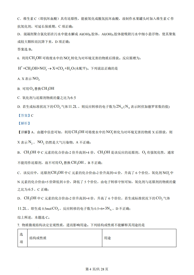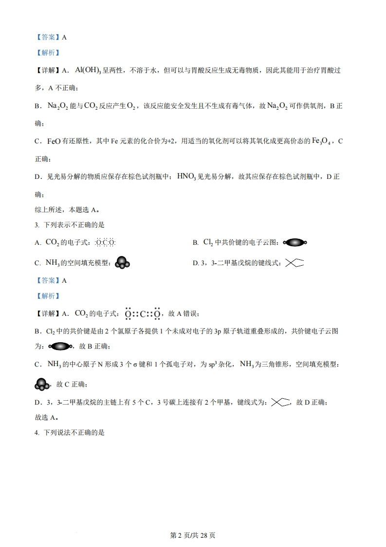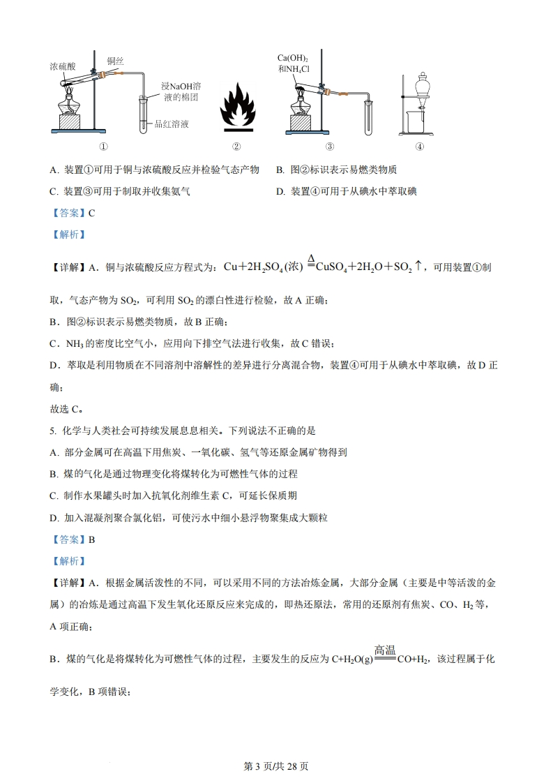 绝密★启用前2024年6月浙江省普通高校招生选考科目考试化学本试题卷分选择题和非选择题两部分,共8页,满分100分,考试时间90分钟。考生注意:1.答题前,请务必将自己的姓名、准考证号用黑色字迹的签字笔或钢笔分别填写在试题卷和答题纸规定的位置上。2.答题时,请按照答题纸上“注意事项”的要求,在答题纸相应的位置上规范作答,在本试题卷上的作答一律无效。3.非选择题的答案必须使用黑色字迹的签字笔或钢笔写在答题纸上相应区域内,作图时可先使用2B铅笔,确定后必须使用黑色字迹的签字笔或钢笔描黑。4.可能用到的相对原子质量:H1B11C12N14016Na23Mg24A127Si28P31S32C135.5K39Ca40Fe56Cu64Br80Ag108I127Ba137选择题部分一、选释题(本大题共16小题,每小题3分,共48分。每小题列出的四个备选项中只有一个是符合题目要求的,不选、多选、错选均不得分)1.按物质组成分类,K网(S02·120属于A.酸B.碱C.盐D.混合物【答案】C【解析】【详解】KA1(SOh12H0是结晶水合物,属于纯净物:是由金属阳离子K+、A+和酸根阴离子SO2组成的复盐:答案选C。2.下列说法不正确的是A.A1(O田3呈两性,不能用于治疗胃酸过多B.Na2O2能与CO2反应产生O2,可作供氧剂C.FeO有还原性,能被氧化成FeO,D.HNO3见光易分解,应保存在棕色试剂瓶中第1页供28页【答案】A【解析】【详解】A.A(OH3呈两性,不溶于水,但可以与胃酸反应生成无毒物质,因此其能用于治疗胃酸过多,A不正确:B.NaO2能与CO2反应产生O2,该反应能安全发生且不生成有毒气体,故N,O2可作供氧剂,B正确:C.FeO有还原性,其中Fe元素的化合价为+2,用适当的氧化剂可以将其氧化成更高价态的FO4,C正确:D.见光易分解的物质应保存在棕色试剂瓶中:HNO3见光易分解,故其应保存在棕色试剂瓶中,D正确:综上所述,本题选A。3.下列表示不正确的是A.C02的电子式:0:C0B.Cl2中共价键的电子云图:cC.NH3的空间填充模型:D.3,3二甲基戊烷的键线式:XC【答案】A【解析】【详解】A.CO2的电子式:Q:C:Q,故A错误:B.C2中的共价键是由2个氯原子各提供1个未成对电子的3p原子轨道重叠形成的,共价键电子云图为:c,故B正确:C.NH的中心原子N形成3个σ键和1个孤电子对,为sp杂化,NH为三角锥形,空间填充模型:8b故C正确:D.3,3二甲基戊烷的主链上有5个C,3号碳上连接有2个甲基,键线式为:XC,故D正确:故选A。4.下列说法不正确的是第2页供28页铜丝Ca(OH浓硫酸HINH.CI浸NaOH溶液的棉团品红溶液①③A.装置①可用于铜与浓硫酸反应并检验气态产物B.图②标识表示易燃类物质C.装置③可用于制取并收集氨气D.装置④可用于从碘水中萃取碘【答案】C【解析】【详解】A.铜与浓硫酸反应方程式为:Cu十2HSO,(浓)=CuSO,十2H,0+SO,个,可用装置①制取,气态产物为SO2,可利用SO2的漂白性进行检验,故A正确:B.图②标识表示易燃类物质,故B正确:C.NH的密度比空气小,应用向下排空气法进行收集,故C错误:D.萃取是利用物质在不同溶剂中溶解性的差异进行分离混合物,装置④可用于从碘水中萃取碘,故D正确:故选C。5.化学与人类社会可持续发展息息相关。下列说法不正确的是A.部分金属可在高温下用焦炭、一氧化碳、氢气等还原金属矿物得到B.煤的气化是通过物理变化将煤转化为可燃性气体的过程C.制作水果罐头时加入抗氧化剂维生素C,可延长保质期D.加入混凝剂聚合氯化铝,可使污水中细小悬浮物聚集成大颗粒【答案】B【解析】【详解】A.根据金属活泼性的不同,可以采用不同的方法治炼金属,大部分金属(主要是中等活泼的金属)的治炼是通过高温下发生氧化还原反应来完成的,即热还原法,常用的还原剂有焦炭、CO、H2等,A项正确:高温B.煤的气化是将煤转化为可燃性气体的过程,主要发生的反应为C+HO(g)三CO+H2,该过程属于化学变化,B项错误:第3页供28页