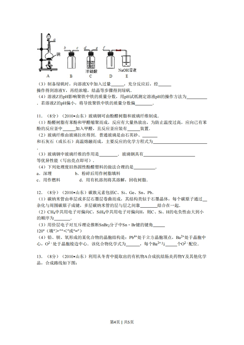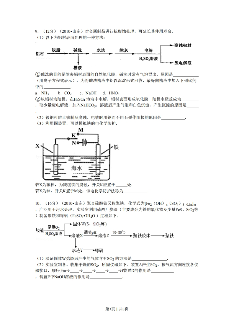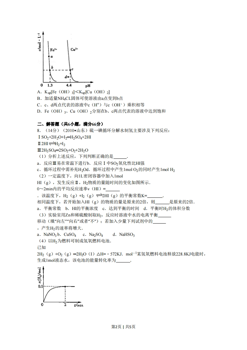 2010年山东省高考化学试卷多考答案与试题解析一、选择题(共7小题,年小题4分,满分28分)1.(4分)(2010山东)160和80是氧元素的两种核素,NA表示阿伏加德罗常数,下列说法正确的是()A.1602与1802互为同分异构体B.1602与1802核外电子排布方式不同C.通过化学变化可以实现160与180间的相互转化D.标准状况下,1.12L16O2和1.12L1802均含0.1NA个氧原子2.(4分)(2010山东)下列与化学反应能量变化相关的叙述正确的是()A.生成物总能量一定低于反应物总能量B.放热反应的反应速率总是大于吸热反应的反应速率C.应用盖斯定律,可计算某些难以直接测量的反应焓变D.同温同压下,H2(g)+C2(g)=2HCI(g)在光照和点燃条件下的△H不同3.(4分)(2010山东)下列说法正确的是()A.形成离子键的阴阳离子间只存在静电吸引力B.HF、HC、HBr、HⅡ的热稳定性和还原性从左到右依次减弱C.第三周期非金属元素含氧酸的酸性从左到右依次增强D.元素周期律是元素原子核外电子排布周期性变化的结果4.(4分)(2010山东)下列叙述错误的是()A.乙烯和苯都能使溴水褪色,褪色的原因相同B.淀粉、油脂、蛋白质都能水解,但水解产物不同C.煤油可由石油分馏获得,可用作燃料和保存少量金属钠D.乙醇、乙酸、乙酸乙酯都能发生取代反应,乙酸乙酯中的少量乙酸可用饱和N2CO,溶液除去5.(4分)(2010山东)下列推断正确的是()A.SiO2是酸性氧化物,能与NaOH溶液反应B.Na2O、Na2O2组成元素相同,与CO2反应产物也相同C.CO、NO、NO,都是大气污染气体,在空气中都能稳定存在D.新制氯水显酸性,向其中滴加少量紫色石蕊试液,充分振荡后溶液呈红色6.(4分)(2010山东)下列与实验相关的叙述正确的是()A.稀释浓硫酸时,应将蒸馏水沿玻璃棒缓慢注入浓硫酸中B.配制溶液时,若加水超过容量瓶刻度,应用胶头滴管将多余溶液吸出C.酸碱滴定时,若加入待测液前用待测液润洗锥形瓶,将导致测定结果偏高D.检验某溶液是否含有SO42~时,应取少量该溶液,依次加入BaCh2溶液和稀盐酸7.(4分)(2010山东)某温度下,Fe(OH)3(s)、Cu(OH)2(s)分别在溶液中达到沉淀溶解平衡后,改变溶液H,金属阳离子浓度的变化如图所示.据图分析,下列判断错误的是()第1页1共5页01.34.4pHA.Ksp[Fe (OH)3]