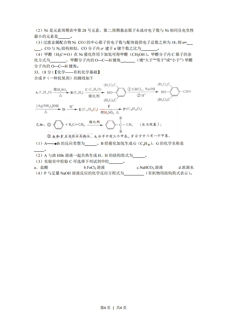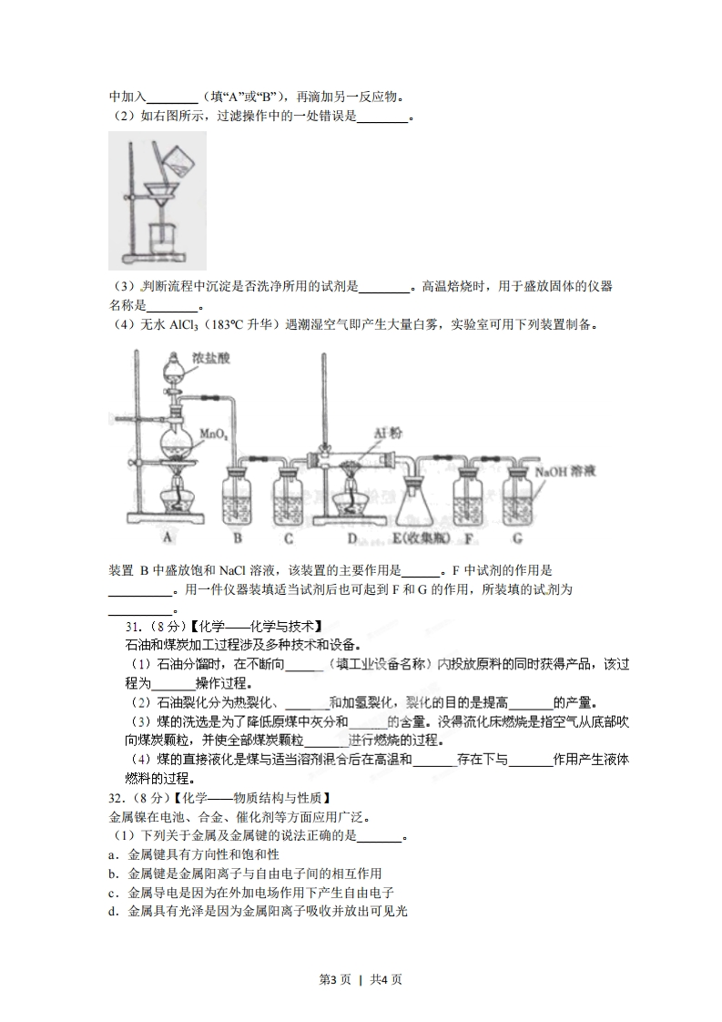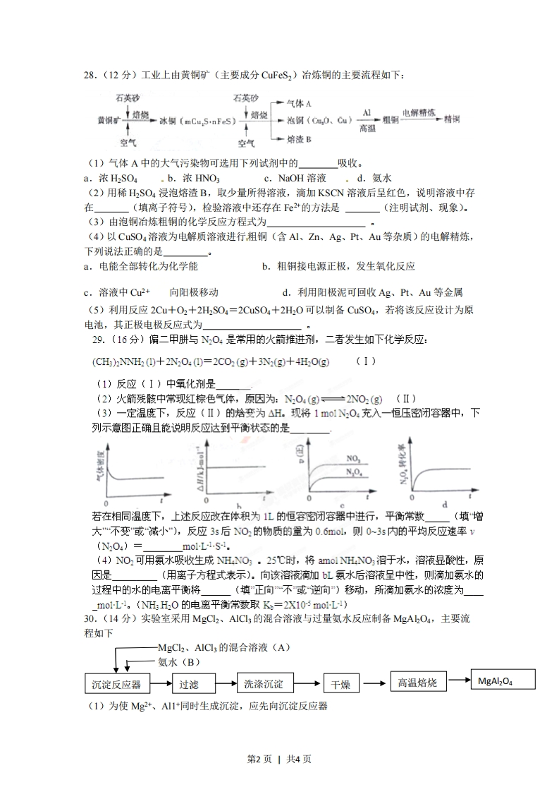 2012年山东高考理综化学学生版7.下列与化学概念有关的说法正确的是A.化合反应均为氧化还原反应B.金属氧化物均为碱性氧化物C.催化剂能改变可逆反应达到平衡的时间D.石油是混合物,其分馏产品汽油为纯净物8.下列与含氯化合物有关的说法正确的是A.HCIO是弱酸,所以NaCIO是弱电解质B.向沸水中逐滴加入少量饱和FeCl3溶液,可制得Fe(OH)方胶体C.HCl溶液和NaCI溶液均通过离子导电,所以HCI和NaCI均是离子化合物D.电解NaCI溶液得到22.4LH2(标准状况),理论上需要转移Na个电子(Na阿伏加德罗常数)9.关于原子结构、元素性质的说法正确的是A.非金属元素组成的化合物中只含共价键B.【A金属元素是同周期中金属性质最强的元素C.同种元素的原子均有相同的质子数和中子数D.仰A族元素的阴离子还原性越强,其最高阶氧化物对应水化物的酸性越强10.下列与有机物的结构、性质有关的叙述正确的是A.苯、油脂均不能使酸性O:溶液褪色B.甲烷和C12的反应与乙烯和B的反应属于同一类型的反应C.葡萄糖、果糖的分子式均为CHO,二者互为同分异构体D.乙醇、乙酸均能与Na反应放出H,二者分子中官能团相同11.下列实验操作正确的是A.中和滴定实验时,用待测液润洗锥形瓶B.盛放NaOH溶液时,使用带玻璃瓶塞的磨口瓶C.用苯萃取溴水中的溴时,将溴的苯溶液从分液漏斗下口放出D.NCI溶液蒸发结晶时,蒸发皿中有品体析出并剩余少量液体即停止加热12.下列由相关实验现象所推出的结论正确的是A.C2、SO2均能使品红溶液褪色,说明二者均有氧化性B.向溶液中滴加酸化的BaNO3)2溶液出现白色沉淀,说明该溶液中一定有SO2-C.Fe与稀HNO,稀HSOu反应均有气泡产生,说明Fe与两种酸均发生置换反应D.分别充满HCI、NH3的烧瓶倒置于水中后液面均迅速上升,说明二者均易溶于水下列与金属腐蚀有关的说法正确的是碳棒NH,C制状物图a图b图c图dA.图a中,插入海水中的铁棒,越靠近底端腐蚀越严重B.图b中,开关由M改置于N时,Cu-Zn合金的腐蚀速率减小C.图c中,接通开关时Zn腐蚀速率增大,Zn上放出气体的速率也增大D.图d中,Zn-MnO2干电池自放电腐蚀主要是由MnO2的氧化作用引起的第1页1共4页28.(12分)工业上由黄铜矿(主要成分CuFS,)治炼铜的主要流程如下:石英秘石英砂=气体A黄铜矿垃烧。冰铜(mCu,5nFeS)1赂悦=泡铜(Cu,0、Cu)、粗翻电解精炼。精锅高空气空气+熔渣B(1)气体A中的大气污染物可选用下列试剂中的吸收。a.浓HSO4.b.浓HNOc.NaOH溶液。d.氨水(2)用稀H2SO4浸泡熔渣B,取少量所得溶液,滴加KSCN溶液后呈红色,说明溶液中存在(填离子符号),检验溶液中还存在F2+的方法是一(注明试剂、现象)。(3)由泡铜治炼粗铜的化学反应方程式为(4)以CuSO4溶液为电解质溶液进行粗铜(含A、Zn、Ag、Pt、Au等杂质)的电解精炼,下列说法正确的是a.电能全部转化为化学能b.粗铜接电源正极,发生氧化反应c.溶液中Cu2+向阳极移动d.利用阳极泥可回收Ag、Pt、Au等金属(5)利用反应2Cu十O2十2H2S04=2CuS04+2H20可以制备CuS04,若将该反应设计为原电池,其正极电极反应式为29.(16分)偏二甲肼与N0:是常用的火箭推进剂,二者发生如下化学反应:(CH)2NH2(0)+2N20:(①=2C02(g)+3N2(g+4H0g(I)(1)反应(I)中氧化剂是(2)火箭残骸中常现红棕色气体,原因为:NO:(g)=2NO2(g)(Ⅱ)(3)一定温度下,反应(Ⅱ)的焓变为△H。现将1mo1N,O:充入一恒压密闭容器中,下列示意图正确且能说明反应达到平衡状态的是NONO.若在相同温度下,上述反应改在体积为1L的恒容密闭容器中进行,平衡常数(填增大不变或减小“),反应3s后N02的物质的量为0.6mo1,则0-3s内的平均反应速率v(N20:)=mol-L-1.S-1.(4)NO,可用氨水吸收生成HNO:·25℃时,将mo1HNO溶于水,溶液显酸性,原因是(用离子方程式表示)。向该溶液滴加bL氨水后溶液呈中性,则滴加氨水的过程中的水的电离平衡将(填正向不或逆向)移动,所滴加氨水的浓度为mo1L1。(NH:H0的电离平衡常数取K=2X10-5mo1L1)30.(14分)实验室采用MgC2、AIC3的混合溶液与过量氨水反应制备MgA2O4,主要流程如下MgC2、AICl3的混合溶液(A)氨水(B)沉淀反应器过滤洗涤沉淀干燥高温焙烧MgAl20a(1)为使Mg2+、AI1+同时生成沉淀,应先向沉淀反应器第2页1共4页中加入(填“A”或“B”),再滴加另一反应物。(2)如右图所示,过滤操作中的一处错误是(3)判断流程中沉淀是否洗净所用的试剂是。高温焙烧时,用于盛放固体的仪器名称是」(4)无水AIC3(183℃升华)遇潮湿空气即产生大量白雾,实验室可用下列装置制备。浓盐酸NaOH溶液DE(收集)F装置B中盛放饱和NaCI溶液,该装置的主要作用是。F中试剂的作用是。用一件仪器装填适当试剂后也可起到F和G的作用,所装填的试剂为31.(8分)【化学一化学与技术】石油和煤炭加工过程涉及多种技术和设备。(1)石油分榴时,在不断向(填工业设备名称)内投放原料的同时获得产品,该过程为操作过程。(2)石油裂化分为热裂化、和加氢裂化,裂化的目的是提高的产量。(3)煤的洗选是为了降低原煤中灰分和的含量。没得流化床燃烧是指空气从底部吹向煤炭颗粒,并使全部煤炭颗粒进行越烧的过程。(4)煤的直接液化是煤与适当溶剂混合后在高温和存在下与作用产生液体燃料的过程。32.(8分)【化学—物质结构与性质】金属镍在电池、合金、催化剂等方面应用广泛。(1)下列关于金属及金属键的说法正确的是a.金属键具有方向性和饱和性.金属键是金属阳离子与自由电子间的相互作用©.金属导电是因为在外加电场作用下产生自由电子d.金属具有光泽是因为