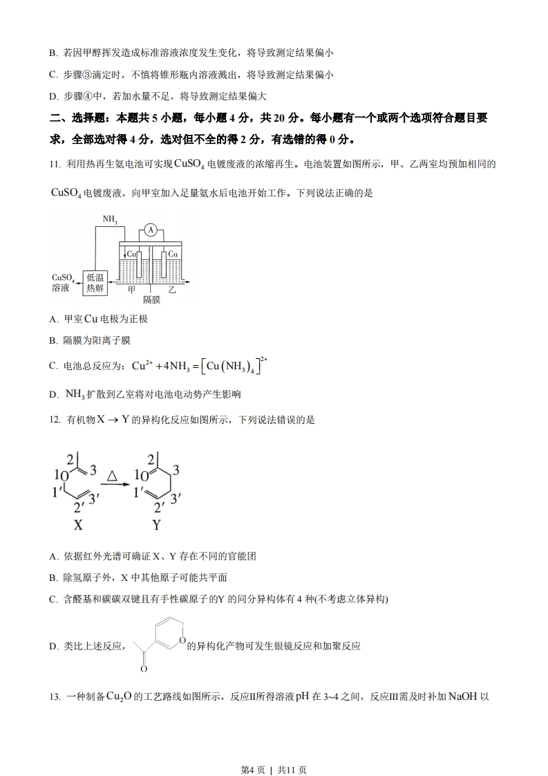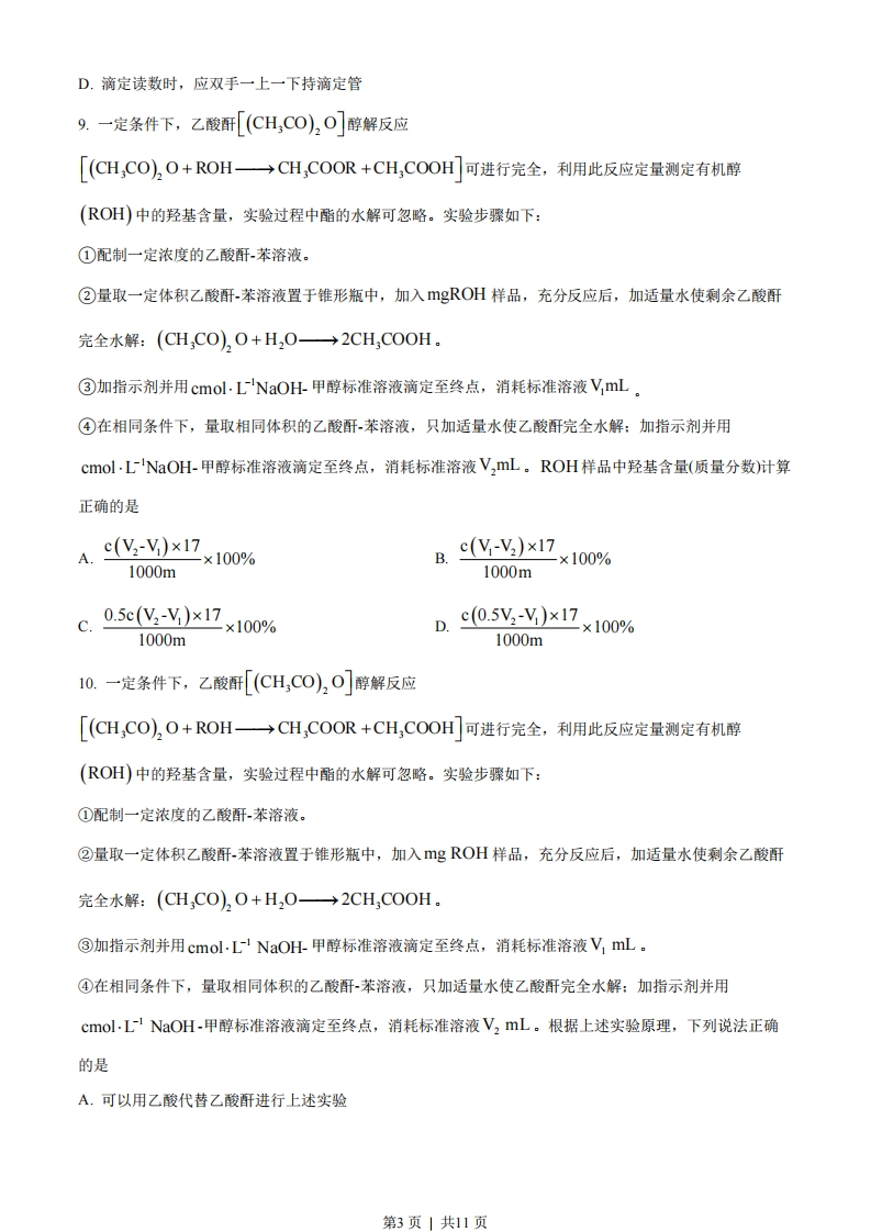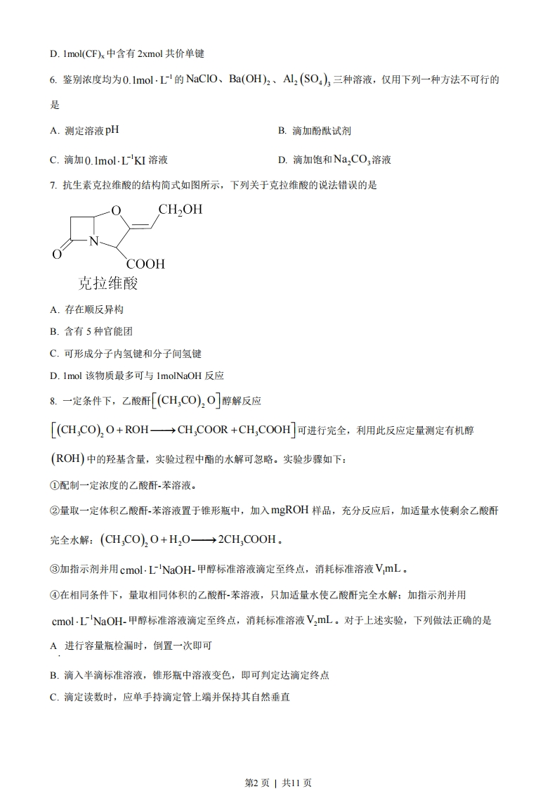 山东省2023年普通高中学业水平等级考试化学可能用到的相对原子质量:H-1C-12N-140-16F-19Si-28S-32C1-35.5K-39Cu-64一、选择题:本题共10小题,每小题2分,共20分。每小题只有一个选项符合题目要求。1.下列之物具有典型的齐鲁文化特色,据其主要化学成分不能与其他三种归为一类的是A.泰山墨玉B.龙山黑陶C.齐国刀币D.淄博琉璃2.实验室中使用盐酸、硫酸和硝酸时,对应关系错误的是A.稀盐酸:配制A1CL3溶液B.稀硫酸:蔗糖和淀粉的水解C.稀硝酸:清洗附有银镜的试管D.浓硫酸和浓硝酸的混合溶液:苯的磺化3.下列分子属于极性分子的是A.CS,B.NFC.S03D.SiF4.实验室安全至关重要,下列实验室事故处理方法错误的是A.眼睛溅进酸液,先用大量水冲洗,再用饱和碳酸钠溶液冲洗B.皮肤溅上碱液,先用大量水冲洗,再用2%的硼酸溶液冲洗C.电器起火,先切断电源,再用二氧化碳灭火器灭火D.活泼金属燃烧起火,用灭火毯(石棉布)灭火5.石墨与F2在450℃反应,石墨层间插入F得到层状结构化合物(C)x,该物质仍具润滑性,其单层局部结构如图所示。下列关于该化合物的说法正确的是o fA.与石墨相比,(CF)导电性增强B.与石墨相比,(CF)x抗氧化性增强C.(CF)k中C-C的键长比C-F短第1页」共11页D.1mol(CF)x中含有2xmol共价单键6.鉴别浓度均为0.1mol.L的NaClO、Ba(OH)2、Al2(SO,)3三种溶液,仅用下列一种方法不可行的是A.测定溶液pHB.滴加酚酞试剂C.滴加0.lmol.LKI溶液D.滴加饱和Na,CO3溶液7.抗生素克拉维酸的结构简式如图所示,下列关于克拉维酸的说法错误的是CH2OHCOOH克拉维酸A.存在顺反异构B.含有5种官能团C.可形成分子内氢键和分子间氢键D.1mol该物质最多可与1molNaOH反应8.一定条件下,乙酸酐(CH,CO)2O醇解反应[(CH,CO),O+ROH→CH,COOR+CH,COOH可进行完全,利用此反应定量测定有机醇(ROH)中的羟基含量,实验过程中酯的水解可忽略。实验步骤如下:①配制一定浓度的乙酸酐-苯溶液。②量取一定体积乙酸酐-苯溶液置于锥形瓶中,加入gROH样品,充分反应后,加适量水使剩余乙酸酐完全水解:(CH,C0),0+H20→2CH,COOH。③加指示剂并用cmol.L'NaOH-甲醇标准溶液滴定至终点,消耗标准溶液VmL。④在相同条件下,量取相同体积的乙酸酐苯溶液,只加适量水使乙酸酐完全水解:加指示剂并用cmol·L'NaOH-甲醇标准溶液滴定至终点,消耗标准溶液V,mL。对于上述实验,下列做法正确的是A进行容量瓶检漏时,倒置一次即可B.滴入半滴标准溶液,锥形瓶中溶液变色,即可判定达滴定终点C.滴定读数时,应单手持滴定管上端并保持其自然垂直第2页」共11页D.滴定读数时,应双手一上一下持滴定管9.一定条件下,乙酸酐(CH,CO),O醇解反应[(CH,CO),O+ROH→CH,COOR+CH,COOH可进行完全,利用此反应定量测定有机醇(ROH中的羟基含量,实验过程中酯的水解可忽略。实验步骤如下:①配制一定浓度的乙酸酐苯溶液。②量取一定体积乙酸酐苯溶液置于锥形瓶中,加入gROH样品,充分反应后,加适量水使剩余乙酸酐完全水解:(CH,CO)20+H,0→2CH,COOH。③加指示剂并用cmol.L'NaOH-甲醇标准溶液滴定至终点,消耗标准溶液V,mL,④在相同条件下,量取相同体积的乙酸酐苯溶液,只加适量水使乙酸酐完全水解:加指示剂并用cmol·L'NaOH-甲醇标准溶液滴定至终点,消耗标准溶液V,mL。ROH样品中羟基含量(质量分数)计算正确的是4.c(V2-V)x17×100%B.(Y-V)x17×100%1000m1000mc.0.5c(V-Y)x17x100%D.c0.5V-Y)x17×100%1000m1000m10.一定条件下,乙酸酐(CH,CO)2O醇解反应[(CH,CO),O+ROH→CH,COOR+CH,COOH可进行完全,利用此反应定量测定有机醇(ROH)中的羟基含量,实验过程中酯的水解可忽略。实验步骤如下:①配制一定浓度的乙酸酐苯溶液。②量取一定体积乙酸酐-苯溶液置于锥形瓶中,加入mg ROH样品,充分反应后,加适量水使剩余乙酸酐完全水解:(CHCO),O+H,O→2CH,COOH。③加指示剂并用cmol.L'NaOH-甲醇标准溶液滴定至终点,消耗标准溶液V,mL。④在相同条件下,量取相同体积的乙酸酐-苯溶液,只加适量水使乙酸酐完全水解:加指示剂并用cmol-L NaOH-甲醇标准溶液滴定至终点,消耗标准溶液V2mL。根据上述实验原理,下列说法正确的是A.可以用乙酸代替乙酸酐进行上述实验第3页」共11页