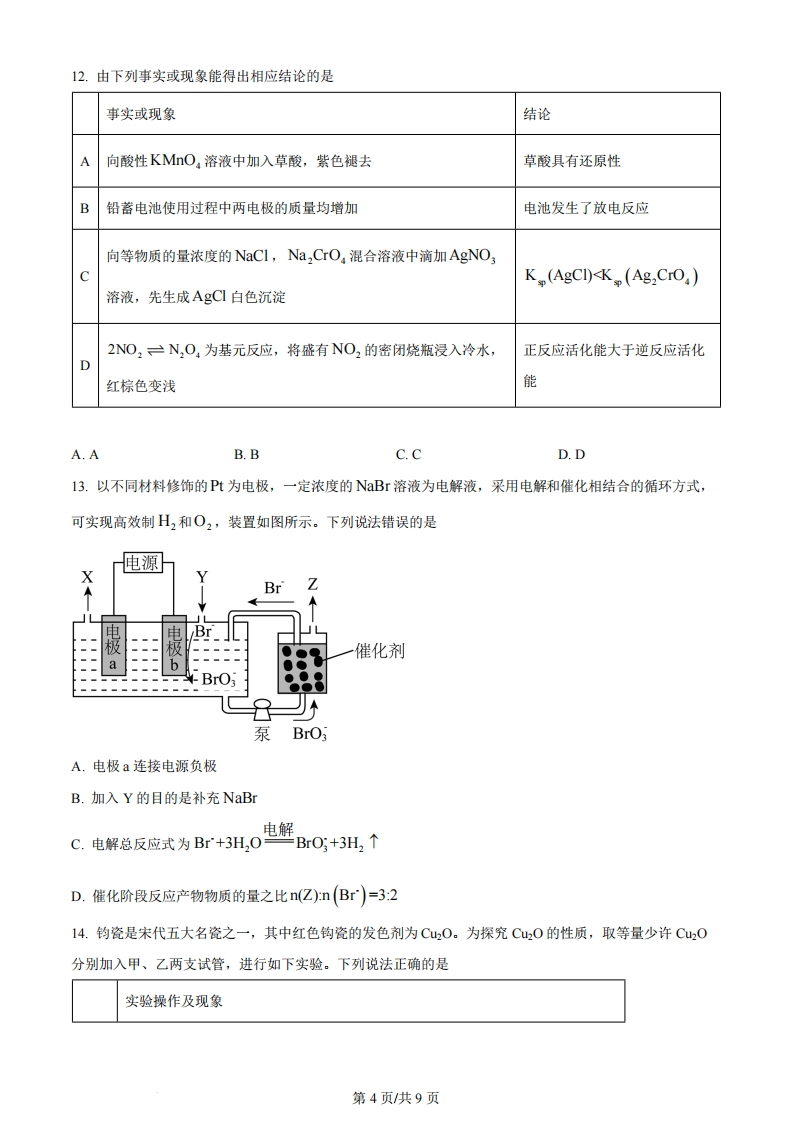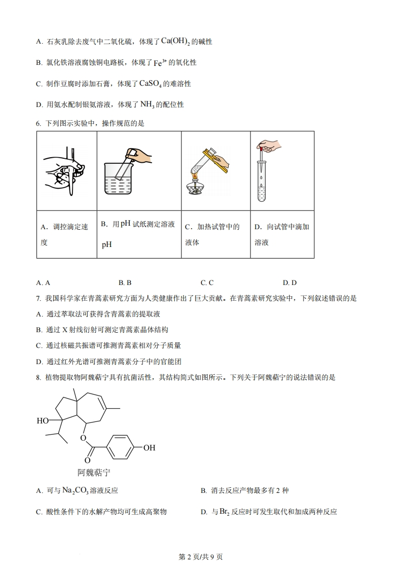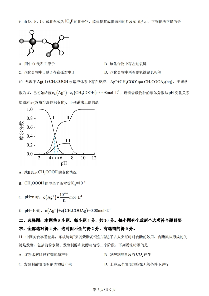 2024年全省普通高中学业水平等级考试化学注意事项:1答卷前,考生务必将自己的姓名、考生号等填写在答题卡和试卷指定位置。2.回答选择题时,选出每小题答案后,用铅笔把答题卡上对应题目的答案标号涂黑。如需改动,用橡皮擦干净后,再选涂其他答案标号。回答非选择题时,将答案写在答题卡上。写在本试卷上无效。3.考试结束后,将本试卷和答题卡并交回。可能用到的相对原子质量:H1C12016S32一、选择题:本题共10小题,每小题2分,共20分。每小题只有一个选项符合题目要求。1.中国书画是世界艺术瑰宝,古人所用文房四宝制作过程中发生氧化还原反应的是A竹管、动物尾毫→湖笔B.松木→油烟→徽墨C.楮树皮→纸浆纤维→宣纸D.端石→端砚2.化学品在食品工业中也有重要应用,下列说法错误的是A.活性炭可用作食品脱色剂B.铁粉可用作食品脱氧剂C.谷氨酸钠可用作食品增味剂D.五氧化二磷可用作食品干燥剂3.下列化学用语或图示正确的是OH的系统命名:2-甲基苯酚CH;B.O3分子的球棍模型:C.激发态H原子的轨道表示式:IDD.P-pT键形成的轨道重叠示意图:4.下列物质均为共价晶体且成键结构相似,其中熔点最低的是A.金刚石(C)B.单晶硅(Si)C.金刚砂(SiC)】D.氮化硼(BN,立方相)5.物质性质决定用途,下列两者对应关系错误的是第1页共9页A.石灰乳除去废气中二氧化硫,体现了C(OH2的碱性B.氯化铁溶液腐蚀铜电路板,体现了F·的氧化性C.制作豆腐时添加石膏,体现了CaSO,的难溶性D.用氨水配制银氨溶液,体现了NH3的配位性6.下列图示实验中,操作规范的是A.调控滴定速B.用pH试纸测定溶液C.加热试管中的D.向试管中滴加度pH液体溶液A.AB.BC.CD.D7.我国科学家在青蒿素研究方面为人类健康作出了巨大贡献。在青蒿素研究实验中,下列叙述错误的是A.通过萃取法可获得含青蒿素的提取液B.通过X射线衍射可测定青蒿素晶体结构C.通过核磁共振谱可推测青蒿素相对分子质量D.通过红外光谱可推测青蒿素分子中的官能团8.植物提取物阿魏萜宁具有抗菌活性,其结构简式如图所示。下列关于阿魏萜宁的说法错误的是阿魏萜宁A.可与Na,CO3溶液反应B.消去反应产物最多有2种C.酸性条件下的水解产物均可生成高聚物D.与Br2反应时可发生取代和加成两种反应第2页共9页9.由O、F、I组成化学式为IO,F的化合物,能体现其成键结构的片段如图所示。下列说法正确的是A.图中O代表F原子B.该化合物中存在过氧键C.该化合物中I原子存在孤对电子D.该化合物中所有碘氧键键长相等10.常温下Ag(I)CH,COOH水溶液体系中存在反应:Ag+CH,COO°≥CH,COOAg(q),平衡常数为K。已初始浓度co(Ag)=c(CH,COOH)=0.08molL,所有含碳物种的摩尔分数与pH变化关系如图所示(忽略溶液体积变化)。下列说法正确的是1.00.80.60.410.20.0424mn681012pHA.线I表示CH,OOOH的变化情况B.CH,OOOH的电离平衡常数K。=10mCpm时,c(Ag')-1k-mol.LD.pH=10时,cAg)+c(CH,COOAg)=0.08molL二、选择题:本题共5小题,每小题4分,共20分。每小题有个或两个选项符合题目要求,全部选对得4分,选对但不全的得2分,有选错的得0分。11.中国美食享誉世界,东坡诗句“芽姜紫醋炙银鱼”描述了古人烹饪时对食醋的妙用。食醋风味形成的关键是发酵,包括淀粉水解、发酵制醇和发酵制酸等三个阶段。下列说法错误的是A.淀粉水解阶段有葡萄糖产生B.发酵制醇阶段有CO2产生C.发酵制酸阶段有酯类物质产生D.上述三个阶段均应在无氧条件下进行第3页共9页