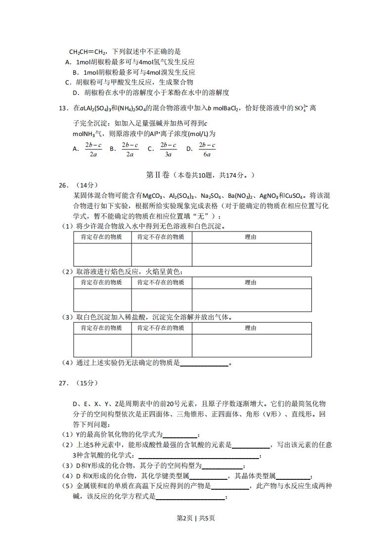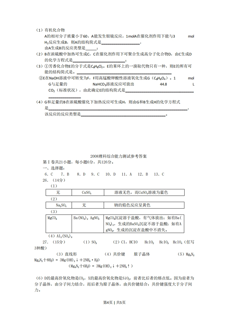 2008年高考四川理综化学试题和参考答案第I卷本卷共21小题,每小题6分,共126分相对原子质量(原子量):H1C12N14016A1127C35.5一,选择题:(本大题共13小题,每小题出的四个选项中,只有一项是符合题目要求的。)6.下列说法不正确的是A.1mol氧气中含有12.04×1023个氧原子,在标准状况下占有体积22.4B.1mol臭氧和1.5mol氧气含有相同的氧原子数C.等体积、浓度均为1mol/L的磷酸和盐酸,电离出的氢离子数之比为3:1D.等物质的量的干冰和葡萄糖中所含碳原子数之比为1:6,氧原子数之比为1:37.下列关于热化学反应的描述中正确的是A.HCl和NaOH反应的中和热△H=一57.3k/mol,则HzS0,和Ca(OH2反应的中和热△H=2×(-57.3)kJ/molB.Co(g)的燃烧热是283.0k/mol,则2C02(g)=2C0(g)+O2(g反应的△H=2X283.0kJ/molC.需要加热才能发生的反应一定是吸热反应D.1mo甲烷燃烧生成气态水和二氧化碳所放出的热量是甲烷燃烧热8.在密闭容器中进行如下反应:H2(g)十2(g)2,在温度T1和T时,产物的量与反应时间的关系如下图所示.符合图示T2的正确判断是A.T1>T2,△H>0B.Ti>T2,△H<0C.T1