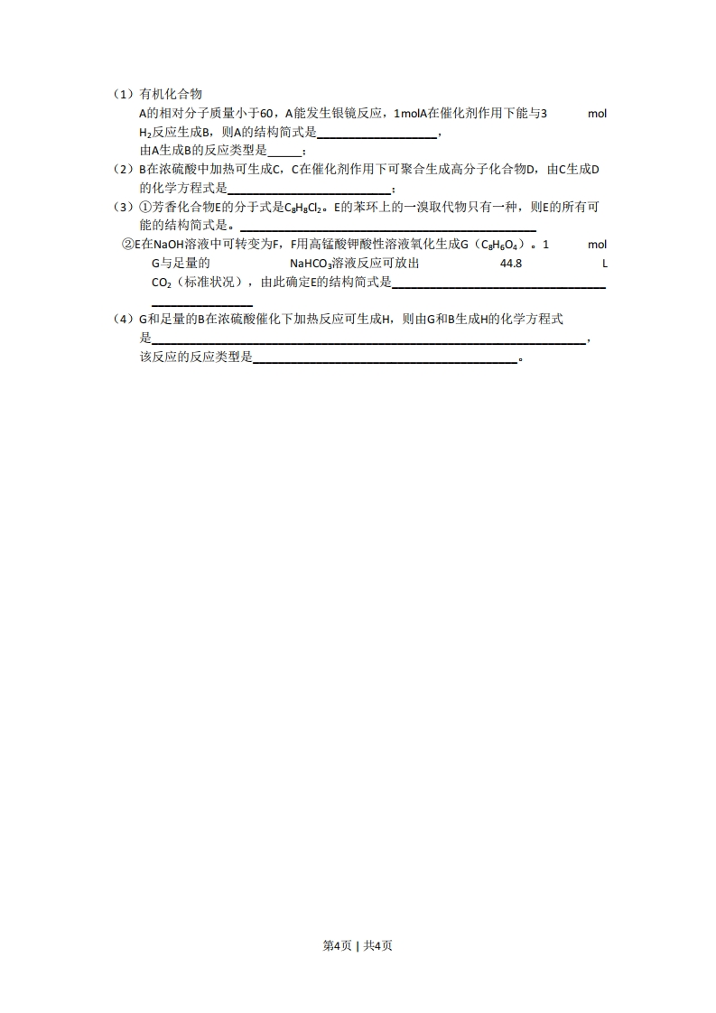 2008年高考四川理综化学试题和参考答案第I卷本卷共21小题,每小题6分,共126分相对原子质量(原子量):H1C12N14016A1127C35.5一,选择题:(本大题共13小题,每小题出的四个选项中,只有一项是符合题目要求的。)6.下列说法不正确的是A.1mol氧气中含有12.04×1023个氧原子,在标准状况下占有体积22.4B.1mol臭氧和1.5mol氧气含有相同的氧原子数C.等体积、浓度均为1mol/L的磷酸和盐酸,电离出的氢离子数之比为3:1D.等物质的量的干冰和葡萄糖中所含碳原子数之比为1:6,氧原子数之比为1:37.下列关于热化学反应的描述中正确的是A.HCl和NaOH反应的中和热△H=一57.3k/mol,则HzS0,和Ca(OH2反应的中和热△H=2×(-57.3)kJ/molB.Co(g)的燃烧热是283.0k/mol,则2C02(g)=2C0(g)+O2(g反应的△H=2X283.0kJ/molC.需要加热才能发生的反应一定是吸热反应D.1mo甲烷燃烧生成气态水和二氧化碳所放出的热量是甲烷燃烧热8.在密闭容器中进行如下反应:H2(g)十2(g)2,在温度T1和T时,产物的量与反应时间的关系如下图所示.符合图示T2的正确判断是A.T1>T2,△H>0B.Ti>T2,△H<0C.T1