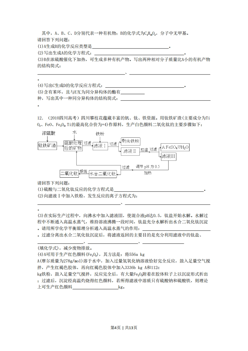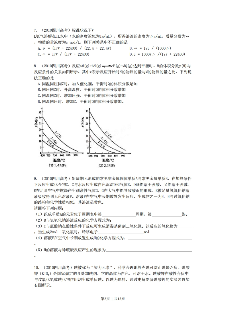 2010年四川省高考理综试题可能用到的相对原子质量:H1C12N14016Na23Mg24Al27S32Cl35.5Ca40Mn55 Fe 56 Co 59 Cu64 Br 80 Ba 1371.(2010四川高考)节能减排对发展经济、保护环境有重要意义。下列措施不能减少二氧化碳排放的是A.利用太阳能制氢B.关停小火电企业C.举行“地球一小时”熄灯活动D.推广使用煤液化技术2.(2010四川高考)N表示阿伏伽德罗常数的值,下列说法正确的是A.标准状况下,22.4L二氯甲烷的分子数约为N,个B.盛有S0z的密闭容器中含有N,个氧原子,则S02的物质的量为0.5mo1C.17.6g丙烷中所含的极性共价键为4W,个D.电解精炼铜时,若阴极得到电子数为2N,个,则阳极质量减少64g3.(2010四川高考)下列说法正确的是A.原子最外层电子数为2的元素一定处于周期表第ⅡA族B.主族元素X、Y能形成XY型化合物,则X与Y的原子序数之差可能为2或5C.氯化氢的沸点比氟化氢的沸点高D.同主族元素形成的氧化物的晶体类型均相同4.(2010四川高考)下列离子方程式书写正确的是A.向明矾溶液中加入过量的氢氧化钡溶液:A1++2S0,2-+2Ba2+40H-=2BaS04↓+A102-+2H20B.向氢氧化亚铁中加入足量的稀硝酸:Fe(OH),+2H=Fe2+2H,0C.向磷酸二氢铵溶液中加入足量的氢氧化钠溶液:H+OH-=NHH0D.向CH,BrCOOH中加入足量的氢氧化钠溶液并加热:,CH,BrCOOH OH-CH,BrC00-+H,O5.(2010四川高考)有关①100mL0.1mol/LNaHCO02、②100ml0.1mol/LNa,C02两种溶液的叙述不正确的是A.溶液中水电离出的H个数:②>①B.溶液中阴离子的物质的量浓度之和:②>①C.①溶液中:c(C02-)>c(H,C0)D.②溶液中:c(HC02-)>c(2C0)6.(2010四川高考)中药狼把草的成分之一M具有消炎杀菌作用,M的结构如图所示:0下列叙述正确的是A.M的相对分子质量是180B.1molM最多能与2 molBrz2发生反应C.M与足量的NaOH溶液发生反应时,所得有机产物的化学式为C,HO,NaD.1molM与足量NaHC0,反应能生成2molC0,第1页|共13页7.(2010四川高考)标准状况下VL氨气溶解在1L水中(水的密度近似为1g/mL),所得溶液的密度为pg/L,质量分数为⊙,物质的量浓度为cmol/几,则下列关系中不正确的是A.p=(17V+22400)/(22.4+22.4V)B.w=17c/(1000p)C.ow=17V/(17V+22400)D.c=1000Vp/(17V+22400)8.(2010四川高考)反应aM(g)+bN(g)cP(g)+dQ(g)达到平衡时。M的体积分数y(M)与反应条件的关系如图所示。其中z表示反应开始时N的物质的量与M的物质的量之比。下列说法正确的是A.同温同压同Z时,加入催化剂,平衡时Q的体积分数增加B.同压同Z时,升高温度,平衡时Q的体积分数增加C.同温同Z时,增加压强,平衡时Q的体积分数增加D.同温同压时,增加Z,平衡时Q的体积分数增加。35i82040220105c6986.09000590659润动线%00温度/度℃(1》1.4①:22.59.(2010四川高考)短周期元形成的常见非金属固体单质A与常见金属单质B,在加热条件下反应生成化合物C,C与水反应生成白色沉淀D和气体E,D既能溶于强酸,又能溶于强碱。E在足量空气中燃烧产生刺激性气体G,G在大气中能导致酸雨的形成。E被足量氢氧化钠溶液吸收得到无色溶液F。溶液F在空气中长期放置发生反应,生成物之一为。H与过氧化钠的结构和化学性质相似,其溶液显黄色。请回答下列问题:(1)组成单质A的元素位于周期表中第周期,第族。(2)B与氢氧化钠溶液反应的化学方程式为:(3)C与氯酸钠在酸性条件下反应可生成消毒杀菌剂二氧化氯。该反应的氧化物为」,当生成2mo1二氧化氯时,转移电子mol(4)溶液F在空气中长期放置生成的化学方程式为:(5)H的溶液与稀硫酸反应产生的现象为10.(2010四川高考)碘被称为“智力元素”,科学合理地补充碘可防止碘缺乏病。碘酸钾(KI02)是国家规定的食盐加碘剂,它的晶体为白色,可溶于水。碘酸钾在酸性介质中与过氧化氢或碘化物作用均生成单质碘。以碘为原料,通过电解制备碘酸钾的实验装置如右图所示。第2页|共13页1惰性电极2直流电池3.离子交换膜4冷却水请回答下列问题:(1)碘是(填颜色)固体物质,实验室常用方法来分离提纯含有少量杂质的固体碘。(2)电解前,先将一定量的精制碘溶于过量氢氧化钾溶液,溶解时发生反应:3I2+6K0H=5KI+KI02+3H0,将该溶液加入阳极区。另将氢氧化钾溶液加入阴极区,电解槽用水冷却。电解时,阳极上发生反应的电极反应式为:阴极上观察到的实验现象是」(3)电解过程中,为确定电解是否完成,需检验电解液中是否有I-。请设计一个检验电解液中是否有I~的实验方案,并按要求填写下表。要求:所需药品只能从下列试剂中选择,实验仪器及相关用品自选。试剂:淀粉溶液、碘化钾淀粉试纸、过氧化氢溶液、稀硫酸。实验方法实验现象及结论(4)电解完毕,从电解液中得到碘酸钾晶体的实验过程如下:阳极①②③④碘化钾电解液蒸发浓缩过滤洗涤晶体步骤②的操作名称步骤⑤的操作名称是步骤④洗涤晶体的目的是11.(2010四川高考)己知:C=CH+-=C-C-HHOHCHO+CHO一定来任H-CHO以乙炔为原料,通过下图所示步骤能合成有机物中间体E(转化过程中的反应条件及部分产物已略去)。第3页1共13页