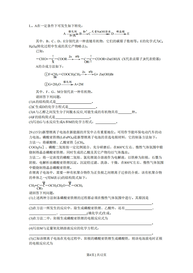 2009年普通高等学校招生全国统一考试(四川卷)理科综合测试试题化学部分6开发新材料是现代科技发展的方向之一。下列有关材料的说法正确的是A.氮化硅陶瓷是新型无机非金属材料B.C60属于原子晶体,用于制造纳米材料C.纤维素乙酸酯属于天然高分子材料D.单晶硅常用于制造光导纤维7.下列有关物质检验的实验结论正确的是选项实验操作及现象实验结论A向某溶液中加入盐酸酸化的氯化钡溶液,有白色沉淀生成该溶液中一定含有$B向某溶液中加入2滴KSCN溶液,溶液不显红色。再向溶液该溶液中一定含有F中加入几滴新制的氯水,溶液变为红色e2+C将某气体通入品红溶液中,品红溶液褪色该气体一定是S02D将少量某物质的溶液滴加到新制的溶银氨溶液中,水浴加该物质一定属于醛热后有银镜生成类8.在下列给定条件的溶液中,一定能大量共存的离子组是A.无色溶液:Ca2+、Ht、C、HSO3B.能使pH试纸呈红色的溶液:Na、NH4、、NOC.FeCL2溶液:K+、Na*、SO、AIO2D.KO.1moL的溶液:Na*、K*、SO5、NOc(H+)9.25℃,101kPa时,强酸与强碱的稀溶液发生中和反应的中和热为57.3kJ/mol,辛烷的燃烧热为5518k/mol。下列热化学方程式书写正确的是A.2H*(aq)+SO'(aq)+Ba2+(aq)+2OH-(aq)=BaSOd(s)+2H2O(1).AH/=-57.3kJ/mol1B.KOH(aq)+H.SO.(aq-K:SO.(aq)+H:O();AH=-57.3kJ/mol25C.CH1+)-8CO+H():AH-5518 kl/molD.2CgH1sg+2502(gF16C02(g+18H0(1),△H=5518kJ/mol10.X、Y、Z、M是元素周期表中前20号元素,其原子序数依次增大,且X、Y、Z相邻。X的核电荷数是Y是核外电子数的一半,Y与M可形成化合物MY。下列说法正确的是A还原性:X的氢化物>Y的氢化物>Z的氢化物B.简单离子的半径:M的离子>Z的离子>Y的离子>X的离子C.YX2.M2Y都是含有极性键的极性分子D.Z元素的最高价氧化物的水化物的化学式为HZO,第1页1共12页11向mg镁和铝的混合物中加入适量的稀硫酸,恰好完全反应生成标准状况下的气体bL。向反应后的溶液中加入e mol/L氢氧化钾溶液VmL,使金属离子刚好沉淀完全,得到的沉淀质量为g。再将得到的沉淀灼烧至质量不再改变为止,得到固体pg。则下列关系不正确的是1000bVe517A.c11.2VB.p=m+25C.n=m+17VcD.mpm12.关于浓度均为0.1mo/L的三种溶液:①氨水、②盐酸、③氯化铵溶液,下列说法不正确的是A.cNH4):③>①B.水电离出的(H):②>①C.①和②等体积混合后的溶液:cH)=c(OH)+cNH3HzO)D.①和③等体积混合后的溶液:cNH4)>c(C)>c(OHr)>c(H)13.在一体积可变的密闭容器中,加入一定量的X、Y,发生反应:mX(g)÷nY(g,△H=QkJ/mol。反应达到平衡时,Y的物质的量浓度与温度、气体体积的关系如下表所示:气体体积机123dYVmol-L1温度℃1001.000.750.532001.200.900.633001.301.000.70下列说法正确的是A.m>nB.Q<0C温度不变,压强增大,Y的质量分数减少D.体积不变,温度升高,平衡向逆反应方向移动26.(16分)过氧化氢是重要的氧化剂、还原剂,它的水溶液又称为双氧水,常用作消毒、杀菌、漂白等。某化学兴趣小组取一定量的过氧化氢溶液,准确测定了过氧化氢的含量,并探究了过氧化氢的性质。I测定过氧化的含量请填写下列空白:(1)移取10.00mL密度为pg/mL的过氧化氢溶液至250mL(填仪器名称)中,加水衡释至刻度,摇匀。移取稀释后的过氧化氢溶液25.00L至锥形瓶中,加入稀硫酸酸化,用蒸馏水稀释,作被测试样。(2)用高锰酸钾标准溶液滴定被测试样,其反应的离子方程式如下,请将相关物质的化学计量数及化学式填写在方框里。MnO+H2O2+H+=Mn2++H2O+(3)滴定时,将高锰酸钾标准溶液注入(填“酸式”或“碱式滴定管中。滴定到达终点的现象是第2页1共12页(4)重复滴定三次,平均耗用cmol/LKMnO标准溶液mL,则原过氧化氢溶液中过氧化氢的质量分数为(⑤)若滴定前滴定管尖嘴中有气泡,滴定后气泡消失,则测定结果(填“偏高”或“偏低”或“不变”)。Ⅱ.探究过氧化氢的性质该化学举小组根据所提供的实验条件设计了两个实验,分别证明了过氧化氢的氧化性和不稳定性。(实验条件:试剂只有过氧化氢溶液、氯水、碘化钾淀粉溶液、饱和硫化氢溶液,实验仪器及用品可自选。)请将他们的实验方法和实验现象填入下表:实验内容实验方法实验现象验证氧化性验证不稳定性27.(15分)已知A-O分别代表一种物质,它们之间的转化关系如下图所示(反应条件略去)。A、B、H分别是由短周期元素组成的单质。B与冷水缓慢反应,与沸水迅速反应,放出氢气。D是一种离子化合物,其阴阳离子的个数比为2:3,且能与水反就应得到两种碱。C为淡黄色固体化合物,O能与G的水溶液反应生成蓝色沉淀。GH一H中M',四F回ADNE请回答下列问题:(1)组成B单质的元素位于周期表第周期,第族。化合物C的电子式为(2的沸点比硒化氢(HSe)的沸点高,其原因是(3)写出I与H在点燃条件下反应生成A和J的化学方程式:(4)写出D与足量的N反应生成E和F的化学方程式:(⑤)上图中,在同一反应里一种物质作氧化剂,又作还原剂,这样的反应共有个28.(14分)四川汶川盛产品质优良的甜樱桃。甜樱桃中含有一种羟基酸(用A表示),A的碳链结构无支链,化学式为CH60s;1.34gA与足量的碳酸氢钠溶液反应,生成标准状况下的气体0.448第3页1共12页