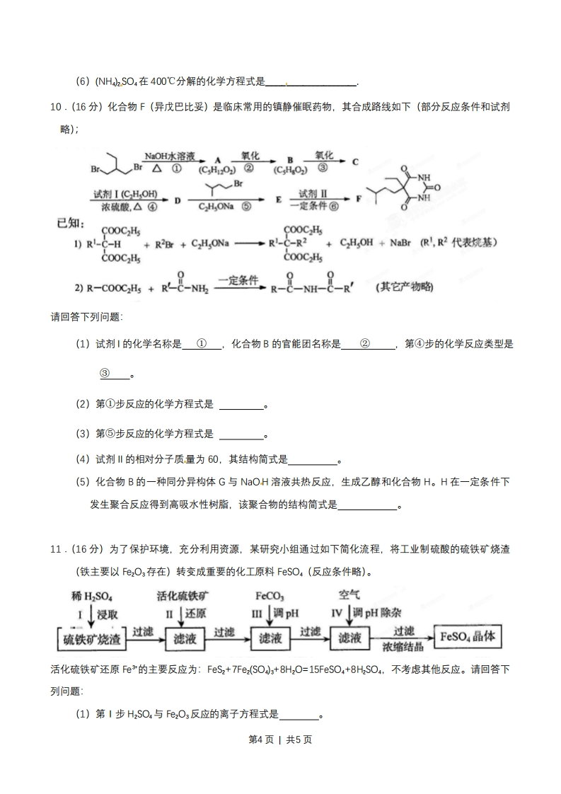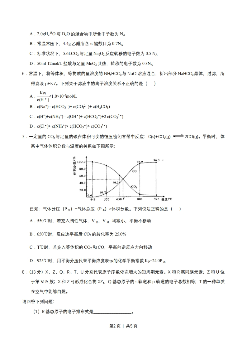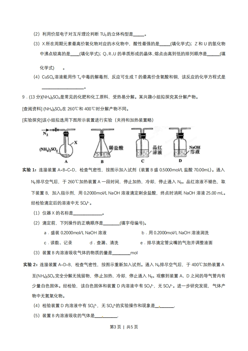 2015年普通高等学校招生全国统一考试(四川卷)理科综合能力测试化学试题1.下列物质在生活中应用时,起还原作用的是()A·明矾作净水剂B.甘油作护肤保湿剂C.漂粉精作消毒剂D.铁粉作食品袋内的脱氧剂2.下列有关CuSO4溶液的叙述正确的是()A.该溶液中Na、NH、NO3、Mg2+可以大量共存B.通入C02气体产生蓝色沉淀C.与HS反应的离子方程式:Cu2+S2=CuSD.与过量浓氨水反应的离子方程式:Cu2+2NH3HO-Cu(OHD2+2NH3.下列操作或装置能达到实验目的的是()饱和食盐水视线NaHCO铁钉红水KMno饱和溶液浸食盐水日电石酸性溶液的榴团配制一定浓度除去氧气中观察铁的检骏乙炔的NaCl溶液的HC气体吸氧病蚀的还原性y⊙cD4.用右图所示装置除去含CN、CI废水中的CN~时,控制溶液PH为9~10,阳极产生的CIO~将CN~氧化为两种无污染的气体,下列说法不正确的是()电湖废水A·.用石墨作阳极,铁作阴极B.阳极的电极反应式为:C-+2OH--2e=CIO-+H2OC.阴极的电极反应式为:2H0+2e=H2↑+2OHD.除去CN-的反应:2CN-+5CIO-+2Ht=N2↑+2C02↑+5CI-+H205.设N为阿伏加德罗常数的值,下列说法正确的是()第1页|共5页A.2.0gH2180与D20的混合物中所含中子数为NAB.常温常压下,4.4g乙醛所含G键数目为0.7NAC.标准状况下,5.6LCO2与足量NazO2反应转移的电子数为0.5NAD.50ml12mol/L盐酸与足量MnO2共热,转移的电子数为0.3NA6.常温下,将等体积,等物质的量浓度的NH4HCO3与NaCl溶液混合,析出部分NaHCO3晶体,过滤,所得滤液pH<7。下列关于滤液中的离子浓度关系不正确的是()A.Kw 1.0x10-7mol/LcH+)B.c(Na+)=c(HCO3-)+c(CO3-)+c(H2CO3)C.c(H+)+c(NH)=c(OH-)+c(HCO3)+2 c(CO32-)D.c(CI->c(NH>c(HCO3-)>c(CO-)7.一定量的CO2与足量的碳在体积可变的恒压密闭容器中反应:C(S)+C0(g)一2C0(g)。平衡时,体系中气体体积分数与温度的关系如下图所示:餐100.093.096.080,060,040.040.0C0,20.010.20.6445550650T800925温度/℃已知:气体分压(P分)=气体总压(P)×体积分数。下列说法正确的是()A.550℃时,若充入惰性气体,V,V逆均减小,平衡不移动B.650℃时,反应达平衡后C02的转化率为25.0%C.T℃时,若充入等体积的CO2和C0,平衡向逆反应方向移动D.925℃时,用平衡分压代替平衡浓度表示的化学平衡常数K24.0P题8.(13分)X、Z、Q、R、T、U分别代表原子序数依次增大的短周期元素。X和R属同族元素;Z和U位于第MA族:X和Z可形成化合物XZ;Q基态原子的s轨道和p轨道的电子总数相等;T的一种单质在空气中能够自燃。请回答下列问题:(1)R基态原子的电子排布式是第2页|共5页(2)利用价层电子对互斥理论判断TU3的立体构型是(3)X所在周期元素最高价氧化物对应的水化物中,酸性最强的是(填化学式):Z和U的氢化物中沸点较高的是(填化学式):Q、R、U的单质形成的晶体,熔点由高到低的排列顺序是(填化学式)(4)CuSO,溶液能用作T4中毒的解毒剂,反应可生成T的最高价含氧酸和铜,该反应的化学方程式是09.(13分NH4)2SO,是常见的化肥和化工原料,受热易分解。某兴趣小组拟探究其分解产物。[查阅资料](NH4)2SO,在260℃和400℃时分解产物不同。[实验探究]该小组拟选用下图所示装置进行实验(夹持和加热装置略)(NH SONaOH手马溶液溶液D实验1:连接装置A-B-C-D,检查气密性,按图示加入试剂(装置B盛0.5000mol/L盐酸70.00mL)。通入N2排尽空气后,于260℃加热装置A一段时间,停止加热,冷却,停止通入N2。品红溶液不褪色,取下装置B.加入指示剂,用0.2000mol/L NaOH溶液滴定剩余盐酸,终点时消耗NaOH溶液25.00mL。经检验滴定后的溶液中无S02。(1)仪器X的名称是(2)滴定前,下列操作的正确顺序是(填字母编号)。a.盛装0.2000mol/L NaOH溶液b.用0.2000mol/L NaOH溶液润洗C.读数、记录d.查漏、清洗e.排尽滴定管尖嘴的气泡并调整液面(3)装置B内溶液吸收气体的物质的量是mol实验2:连接装置A-D-B.检查气密性,按图示重新加入试剂。通入N2排尽空气后,于400C加热装置A至(NH4)2SO,完全分解无残留物,停止加热,冷却,停止通入N2。观察到装置A、D之间的导气管内有少量白色固体。经检验,该白色固体和装置D内溶液中有S02,无S02。进一步研究发现,气体产物中无氮氧化物。(4)检验装置D内溶液中有S0,2,无S0,2的实验操作和现象是_一(5)装置B内溶液吸收的气体是第3页|共5页