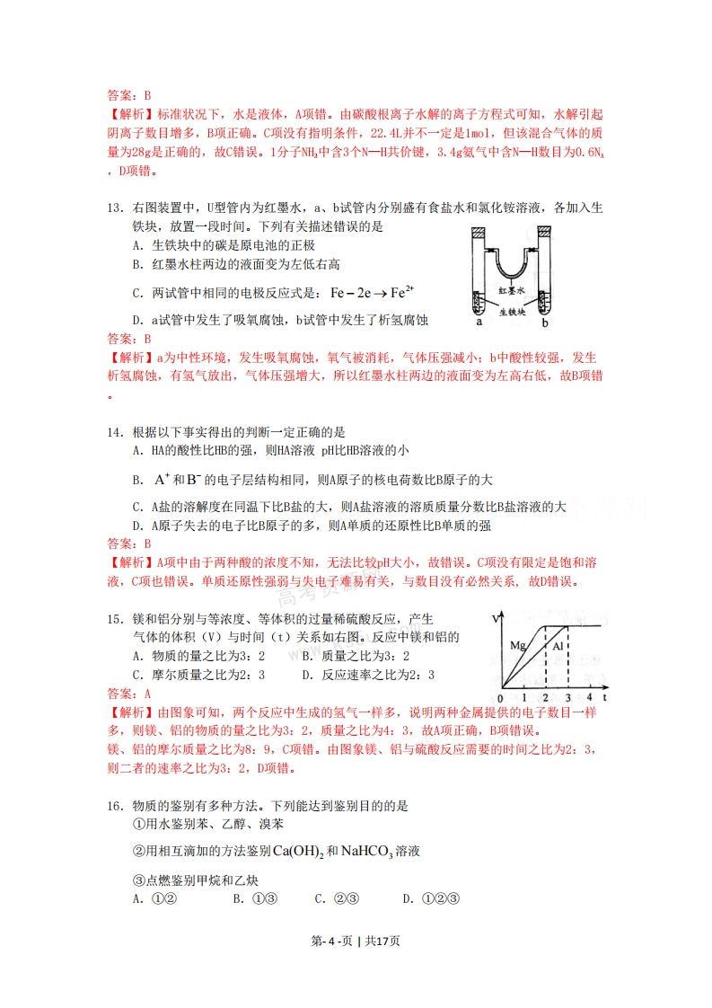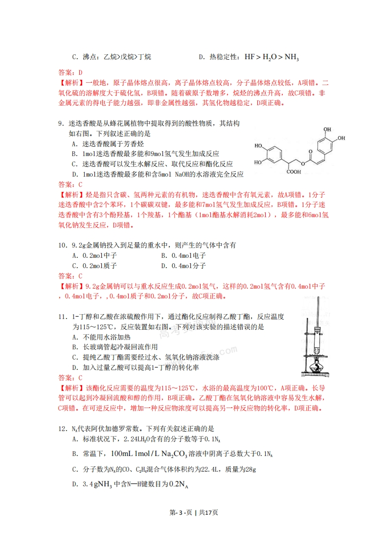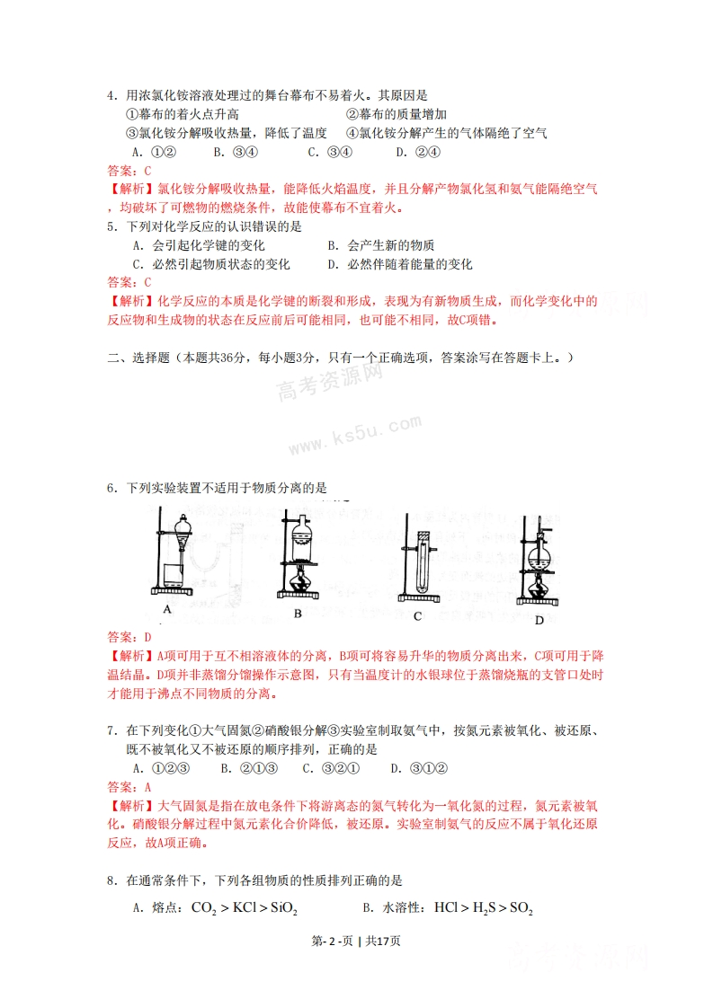 2009年全国普通高等学校招生统一考试上海化学试卷解析考生注煮:1.本试卷满分150分,考试时问120分钟·2.本考试设试卷和答题纸两部分,试卷包括试题与答题要求:所有答题必须涂(选择题)或写(非选择题)在答题纸上:做在试卷上一律不得分。3.答题前,考生务必在答题纸上用钢笔或圆珠笔清楚填写姓名、准考证号,并将核对后的条形码贴在指定位置上。4.答题纸与试卷在试题编号上是一一对应的,答题时应特别注意,不能错位。第I卷(共66分)考生注意:1.答第I卷前,考生务必在答题卡上用钢笔或圆珠笔清楚填写姓名、准考证号、校验码,并用2B铅笔正确涂写准考证号和校验码。2.第I卷(1一22小题),由机器阅卷,答案必须全部涂写在答题卡上。考生应将代表正确答案的小方格用2B铅笔涂黑。注意试题题号和答题纸编号一一对应,不能错位。答案需要更改时,必须将原选项用橡皮擦去,重新选择。答案不能涂写在试卷上,涂写在试卷上一律不给分。相对原子质量:H-1C-12N-140-16Na-23Mg-24A1-27S-32V-51Cr-52Mn-55Fe-56Cu-64一、选择题(本题共10分,每小题2分,只有一正确选项,答案涂写在答题卡上。)1.下列措施不能达到节能减排目的的是A.利用太阳能制氢燃料B.用家用汽车代替公交车C.利用潮汐能发电D.用节能灯代替白炽灯答案:B【解析】用家用汽车代替公交车只能降低交通工具的使用效率,增大化石燃料的用量,从而增大能量的消耗,不能达到节能减排目的,故选B项。2.以下表示氢原子结构的化学用语中,对电子运动状态描述最详尽的是IsA.:HeBC.1s2D.答案:D【解析】A项只能表示最外层电子数,B项只表示核外的电子分层排布情况,C项具体到亚层的电子数,而D项包含了电子层数、亚层数以及轨道内电子的自旋方向,故该项正确。3.有机物的种类繁多,但其命中是有规则的。下列有机物命名正确的是A.CH2CH2CH2CH21,4-二甲基丁烷B.CHCHCH=CH23-甲基丁烯CH3CHCHC.CH,CH2CHCH32-甲基丁烷D.CH2C-CH2C1二氯乙烷CH?答案:C【解析】A项应为正己烷,B项没有指明双键的位置,D项应注明氯原子的位置。第-1-页1共17页4.用浓氯化铵溶液处理过的舞台幕布不易着火。其原因是①幕布的着火点升高②幕布的质量增加③氯化铵分解吸收热量,降低了温度④氯化铵分解产生的气体隔绝了空气A.①②B.③④C.③④D.②④答案:C【解析】氯化铵分解吸收热量,能降低火焰温度,并且分解产物氯化氢和氨气能隔绝空气,均破坏了可燃物的燃烧条件,故能使幕布不宜着火。5.下列对化学反应的认识错误的是A.会引起化学键的变化B.会产生新的物质C.必然引起物质状态的变化D.必然伴随着能量的变化答案:C【解析】化学反应的本质是化学键的断裂和形成,表现为有新物质生成,而化学变化中的反应物和生成物的状态在反应前后可能相同,也可能不相同,故C项错。二、选择题(本题共36分,每小题3分,只有一个正确选项,答案涂写在答题卡上。)高考资源测www.ks5u.com6.下列实验装置不适用于物质分离的是D答案:D【解析】A项可用于互不相溶液体的分离,B项可将容易升华的物质分离出来,C项可用于降温结晶。D项并非蒸馏分馏操作示意图,只有当温度计的水银球位于蒸馏烧瓶的支管口处时才能用于沸点不同物质的分离。7.在下列变化①大气固氮②硝酸银分解③实验室制取氨气中,按氮元素被氧化、被还原、既不被氧化又不被还原的顺序排列,正确的是A.①②③B.②①③C.③②①D.③①②答案:A【解析】大气固氮是指在放电条件下将游离态的氮气转化为一氧化氮的过程,氮元素被氧化。硝酸银分解过程中氮元素化合价降低,被还原。实验室制氨气的反应不属于氧化还原反应,故A项正确。8.在通常条件下,下列各组物质的性质排列正确的是A.熔点:CO2>KC>SiO,B.水溶性:HC>H,S>SO2第-2-页1共17页C.沸点:乙烷>戊烷>丁烷D.热稳定性:HF>H2O>NH3答案:D【解析】一般地,原子晶体熔点很高,离子晶体熔点较高,分子晶体熔点较低,A项错。二氧化硫的溶解度大于硫化氢,B项错。随着碳原子数增多,烷烃的沸点升高,故C项错。非金属元素的得电子能力越强,即非金属性越强,其氢化物越稳定,D项正确。9.迷迭香酸是从蜂花属植物中提取得到的酸性物质,其结构OH如右图。下列叙述正确的是OHA.迷迭香酸属于芳香烃B.1mo1迷迭香酸最多能和9mo1氢气发生加成反应C.迷迭香酸可以发生水解反应、取代反应和酯化反应D.1mo1迷迭香酸最多能和含5 mol Na0H的水溶液完全反应COOH答案:C【解析】烃是指只含碳、氢两种元素的有机物,迷迭香酸中含有氧元素,故A项错。1分子迷迭香酸中含2个苯环,1个碳碳双键,最多能和7mo1氢气发生加成反应,B项错。1分子迷迭香酸中含有3个酚羟基,1个羧基,1个酯基(1mo1酯基水解消耗2mol),最多能和6mo1氢氧化钠发生反应,D项错。10.9.2g金属钠投入到足量的重水中,则产生的气体中含有A.0.2mo1中子B.0.4mo1电子C.0.2mo1质子D.0.4mo1分子答案:C【解析】9.2g金属钠可以与重水反应生成0.2mo1氢气,这样的0.2mol1氢气含有0.4mo1中子,0.4mo1电子,,0.4o1质子和0.2o1分子,故C项正确。11.1-丁醇和乙酸在浓硫酸作用下,通过酯化反应制得乙酸丁酯,反应温度为115~125℃,反应装置如右图。下列对该实验的描述错误的是A.不能用水浴加热B.长玻璃管起冷凝回流作用C.提纯乙酸丁酯需要经过水、氢氧化钠溶液洗涤D.加入过量乙酸可以提高1-丁醇的转化率答案:C【解析】该酯化反应需要的温度为115~125℃,水浴的最高温度为100℃,A项正确。长导管可以