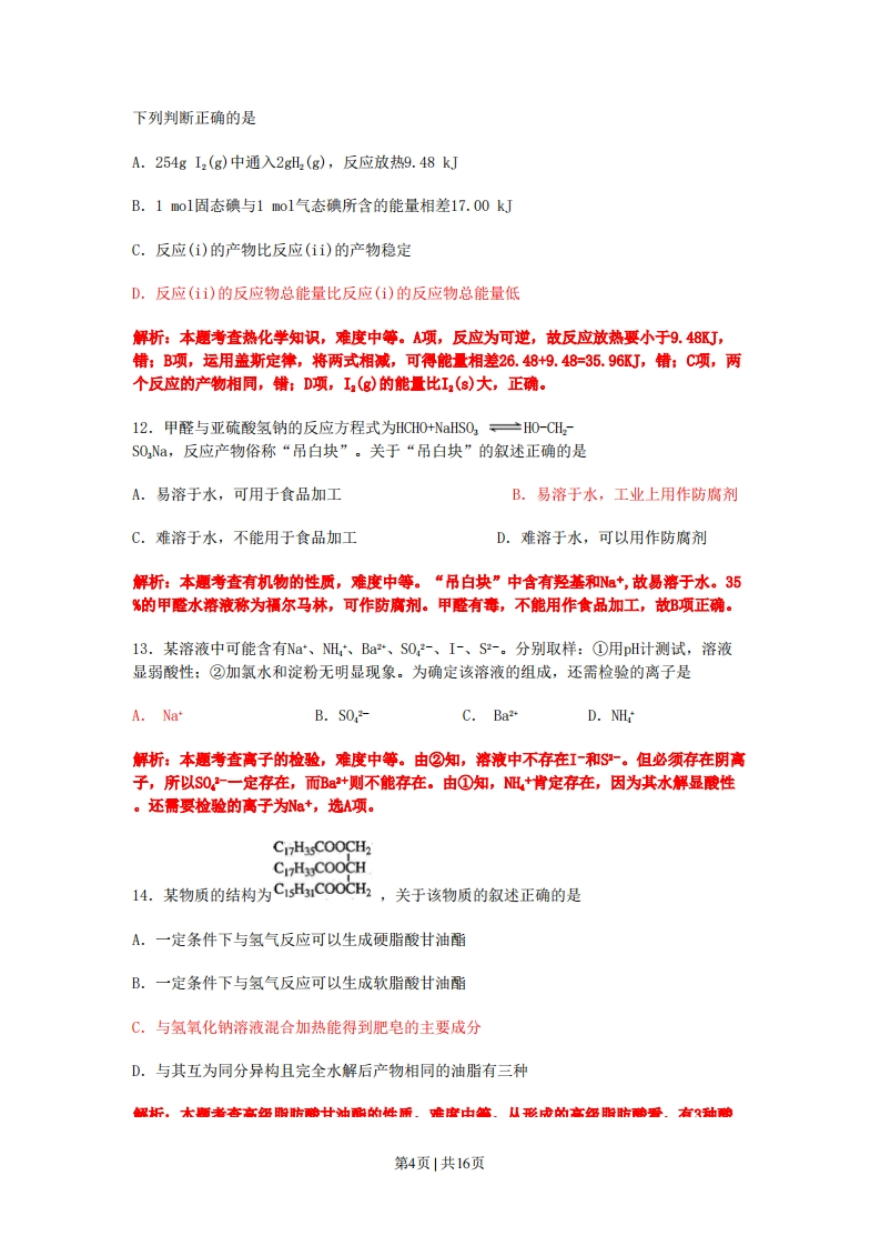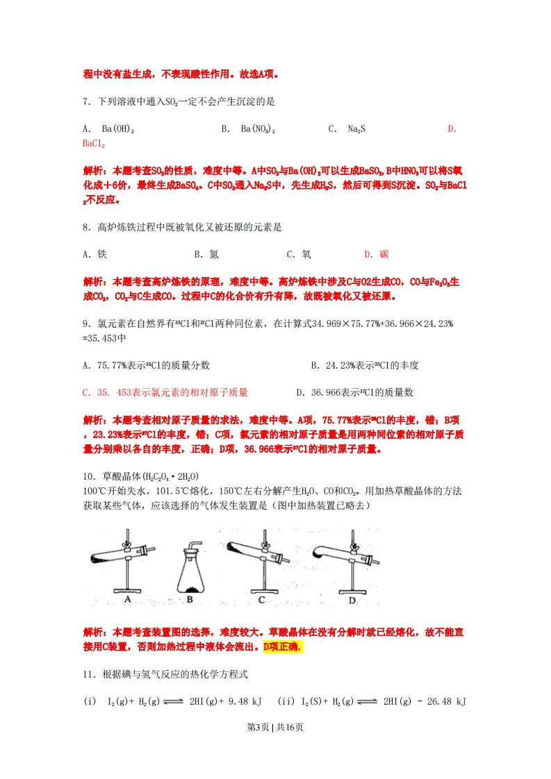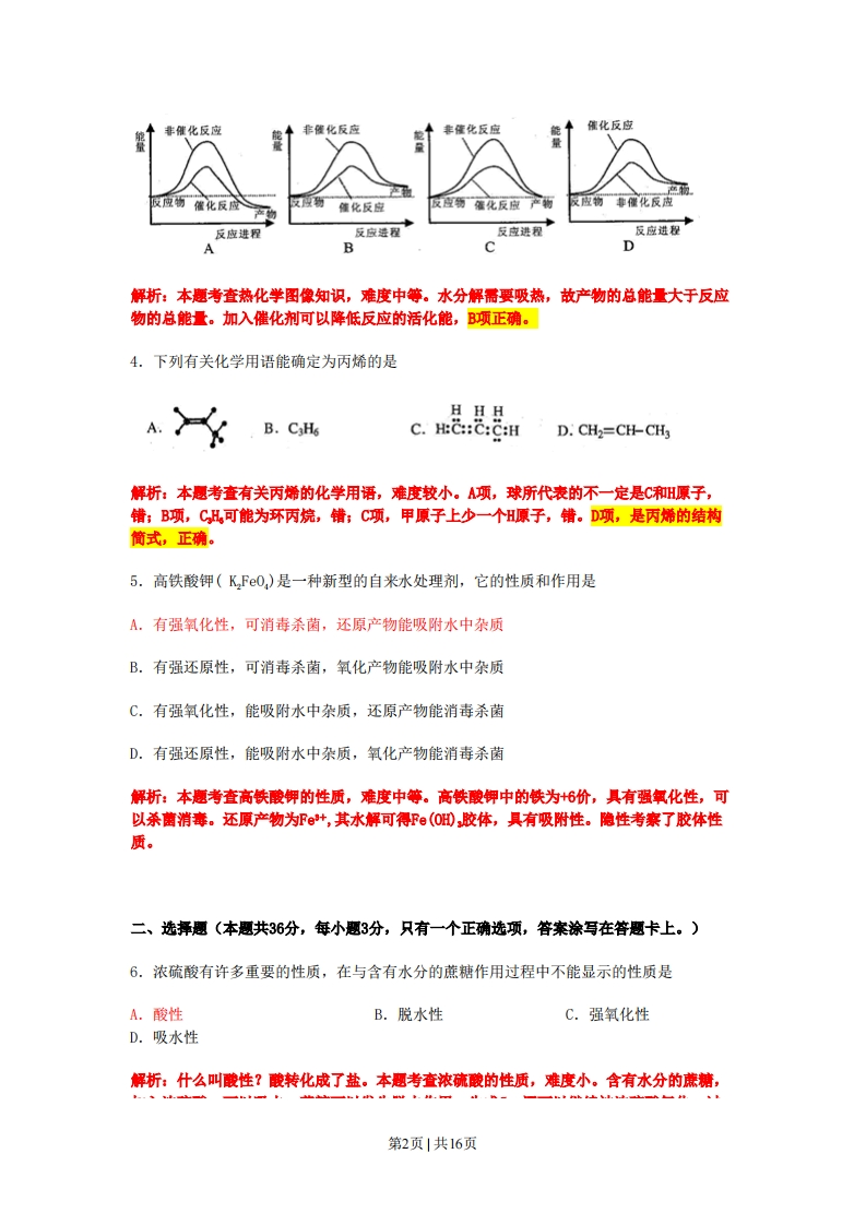 2011年全国普通高等学校招生统一考试上海化学试卷解析考生注煮:1.本试卷满分150分,考试时问120分钟·2.本考试设试卷和答题纸两部分,试卷包括试题与答题要求:所有答题必须涂(选择题)或写(非选择题)在答题纸上:做在试卷上一律不得分。3.答题前,考生务必在答题纸上用钢笔或圆珠笔清楚填写姓名、准考证号,并将核对后的条形码贴在指定位置上。4.答题纸与试卷在试题编号上是一一对应的,答题时应特别注意,不能错位。相对原子质量:H-1C-12N-140-16F-19Na-23Mg-24Si-28S-32Cu-64I-127第I卷(共66分)一、选择题(本题共10分,每小题2分,只有一个正确选项,答案涂写在答题卡上。)1.下列离子在稳定人体血液的中起作用的是A.Na"B.HCO-CFe2D.C1-解析:本愿考查缓冲落液的知识,难度较小。C0,可以结合OH,也可以结合+,故可以起到缓冲人体血液pH的作用。人体血液pH恒定在7.35-7.45之间,超出范围即有可能引起酸中毒或者碱中毒。叶绿素2.从光合作用的反应原理6C02+6H0.光C。H0+602可知碳是农作物生长的必需元素之一。关于用二氧化碳生产肥料的评价正确的是A.缓解地球温室效应,抑制农作物营养平衡B.加剧地球温室效应,促进农作物营养平衡C.缓解地球温室效应,进农作物营养平衡D.加剧地球温室效应,抑制农作物营养平衡解析:本愿考查00,生产肥料的作用,难度较小。使用C0,可以减少温室效应,从光合作用原理看,使用C0可促进农作物营养平衡,所以C正确。3.据报道,科学家开发出了利用太阳能分解水的新型催化剂。下列有关水分解过程的能量变化示意图正确的是第1页|共16页能个非催化反应非假化反应非隆化反应催化反应安应物催化反应度物催化反应文应箭蛋化反应产物应物化反应反应进程反应进程反应进程反应进程ABCD解析:本题考查热化学图像知识,难度中等。水分解需要吸热,故产物的总能量大于反应物的总能量。加入催化剂可以降低反应的活化能,B项正确。4.下列有关化学用语能确定为丙烯的是HHHB.C3HsC.H:C::C:C:HD.CH=CH-CH解析:本愿考查有关丙烯的化学用语,难度较小。项,球所代表的不一定是C和原子,错;B项,C凡可能为环丙烷,错;C项,甲原子上少一个H原子,错。D项,是丙烯的结构简式,正确。5.高铁酸钾(KF0,)是一种新型的自来水处理剂,它的性质和作用是A.有强氧化性,可消毒杀菌,还原产物能吸附水中杂质B.有强还原性,可消毒杀菌,氧化产物能吸附水中杂质C.有强氧化性,能吸附水中杂质,还原产物能消毒杀菌D.有强还原性,能吸附水中杂质,氧化产物能消毒杀菌解析:本题考查高铁酸钾的性质,难度中等。高铁酸钾中的铁为6价,具有强氧化性,可以杀菌消毒。还原产物为Fe+,其水解可得Fe(O川,胶体,具有吸附性。隐性考察了胶体性质。二、选择题(本题共36分,每小题3分,只有一个正确选项,答案涂写在答题卡上。)6.浓硫酸有许多重要的性质,在与含有水分的蔗糖作用过程中不能显示的性质是A.酸性B.脱水性C.强氧化性D.吸水性解析:什么叫酸性?酸转化成了盐。本思考查浓硫酸的性质,难度小。含有水分的蔗糖,=-事k上生4:s-第2页|共16页程中没有盐生成,不表现酸性作用。故选A项。7.下列溶液中通入S02一定不会产生沉淀的是A.Ba (OH)B.Ba(NO)2C.Na2SD.BaCl2解析:本题考查S0,的性质,难度中等。A中S0,与Ba(OD,可以生成BaS0,B中HⅢNO,可以将S氧化成十6价,最终生成BaS04。C中S0通入NaS中,先生成HS,然后可得到S沉淀。S02与BaC1不反应。8.高炉炼铁过程中既被氧化又被还原的元素是A.铁B.氮C.氧D.碳解析:本愿考查高炉炼铁的原理,难度中等。高炉炼铁中涉及C与02生成C0,C0与Fe0,生成00,C0,与C生成C0。过程中C的化合价有升有降,故既被氧化又被还原。9.氯元素在自然界有5C1和C1两种同位素,在计算式34.969×75.77%+36.966×24.23%=35.453中A.75.77%表示35C1的质量分数B.24.23%表示25C1的丰度C.35.453表示氯元素的相对原子质量D.36.966表示3℃1的质量数解析:本题考查相对原子质量的求法,难度中等。A项,75.77%表示C1的丰度,错;B项,23.23%表示℃1的丰度,错:C项,氯元素的相对原子质量是用两种同位素的相对原子质量分别乘以各自的丰度,正确:D项,36.966表示℃1的相对原子质量。10.草酸晶体(H2C20,·2H20)100℃开始失水,101.5℃熔化,150℃左右分解产生H20、C0和C02。用加热草酸晶体的方法获取某些气体,应该选择的气体发生装置是(图中加热装置己略去)解析:本愿考查装量图的选择,难度较大。草酸晶体在没有分解时就已经培化,故不能直接用C装置,否则加热过程中液体会流出。D项正确.11.根据碘与氢气反应的热化学方程式(i)I2(g)+H2(g)=2HI(g)+9.48kJ(ii)I2(S)+H2(g)2HI(g)-26.48kJ第3页|共16页