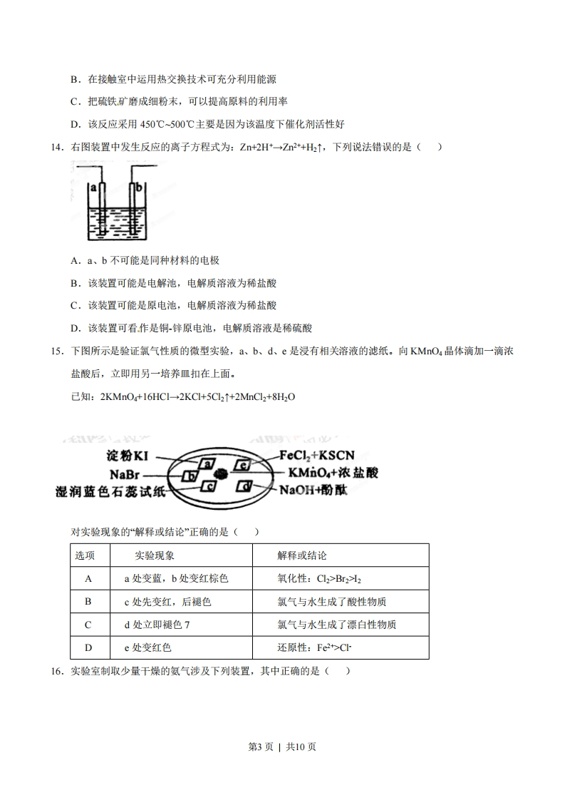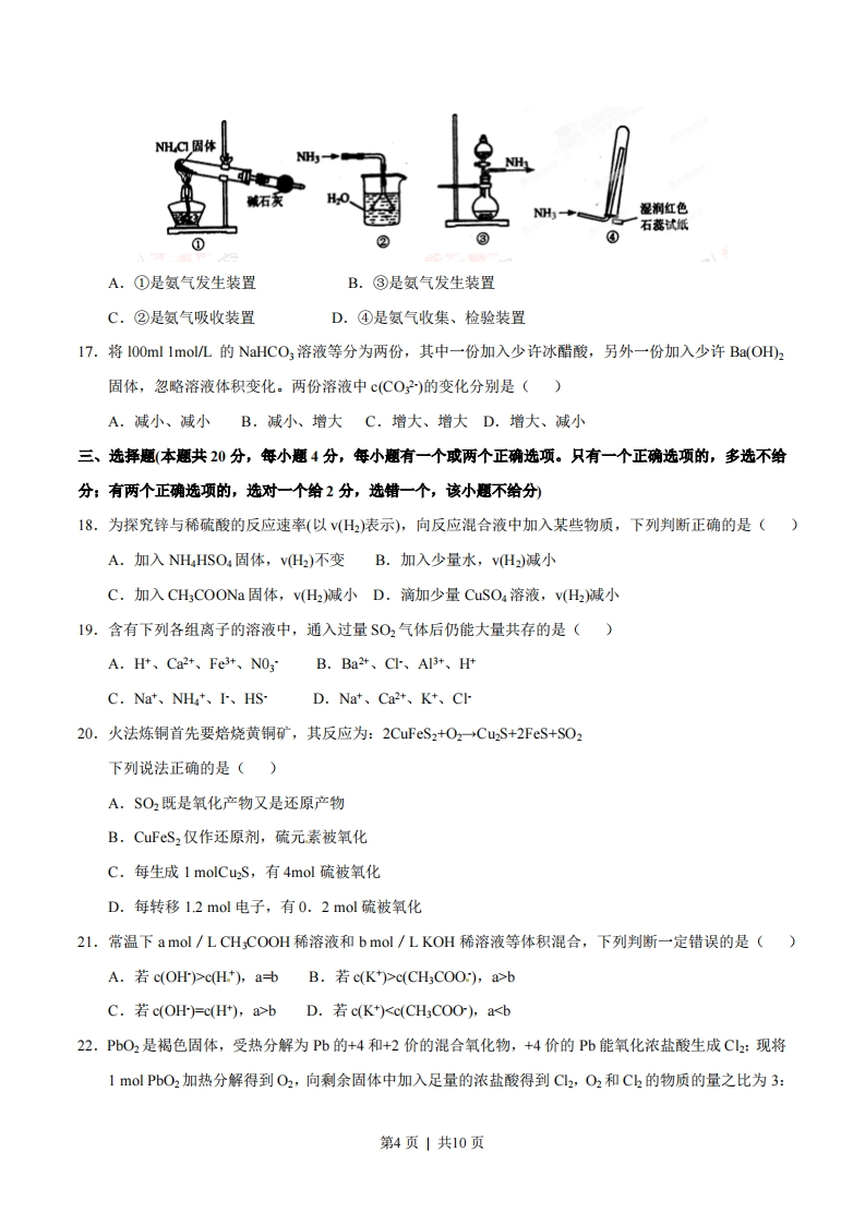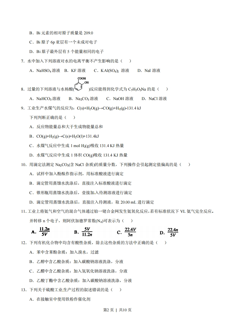 2012年普通高等学校招生全国统一考试(上海卷)化学试题相对原子质量:H-1C-12N-140-16Na-23Si一28C-35.5K-39Cu-64Se79一、选择题(本题共10分,每小题2分,每题只有一个正确选项)1.今年3月修订的《环境空气质量标准》中新纳入的强制监测指标是()A.PM2.5B.NOxC.SO2D.可吸入颗粒物2.下列关于化石燃料的加工说法正确的是()A.石油裂化主要得到乙烯B.石油分馏是化学变化,可得到汽油、煤油C.煤干馏主要得到焦炭、煤焦油、粗氨水和焦炉气D.煤制煤气是物理变化,是高效、清洁地利用煤的重要途径()3.氮氧化铝(AION)属原子晶体,是一种超强透明材料,下列描述错误的是A.AION和石英的化学键类型相同B.AION和石英晶体类型相同C.AION和A12O3的化学键类型不同D.AION和Al2O3晶体类型相同4.PH3一种无色剧毒气体,其分子结构和NH3相似,但P-H键键能比N-H键键能低。下列判断错误的是()A.PH3分子呈三角锥形B.PH3分子是极性分子C.PH3沸点低于NH3沸点,因为P-H键键能低D.PH3分子稳定性低于NH3分子,因为N-H键键能高5.和氢硫酸反应不能产生沉淀的是()A.Pb(NO:)溶液B.NaS洛液C.CuSO溶液D.H2SO4溶液二、选择题(本题共36分,年小题3分,年题只有一个正确选项)6.元素周期表中铋元素的数据见右图,下列说法正确的是()83 Bi铋6s26p3209.0A.Bi元素的质量数是209第1页|共10页B.Bi元素的相对原子质量是209.0C.Bi原子6p亚层有一个未成对电子D.Bi原子最外层有5个能量相同的电子7.水中加入下列溶液对水的电离平衡不产生影响的是()A.NaHSO4溶液B.KF溶液C.KAI(SOh溶液D.Nal溶液COOHOH8.过量的下列溶液与水杨酸)反应能得到化学式为CHsONa的是()A.NaHCO3溶液B.Na2CO3溶液C.NaOH溶液D.NaCl溶液9.工业生产水煤气的反应为:C(s+HO(g)→COg+H2(g)-131.4kJ下列判断正确的是()A.反应物能量总和大于生成物能量总和B.CO(g)+H2(g)C(s)+H2O(I)+131.4kJC.水煤气反应中生成1molH(g)吸收131.4KJ热量D.水煤气反应中生成1体积CO(g)吸收131.4KJ热量10.用滴定法测定Na2CO3(含NaCl杂质)的质量分数,下列操作会引起测定值偏高的是()A.试样中加入酚酞作指示剂,用标准酸液进行滴定B.滴定管用蒸馏水洗涤后,直接注入标准酸液进行滴定C.锥形瓶用蒸馏水洗涤后,壹接加入待测溶液进行滴定D.滴定管用蒸馏水洗涤后,直接注入待测液,取20.00mL进行滴定11.工业上将氨气和空气的混合气体通过铂一铑合金网发生氨氧化反应,若有标准状况下VL氨气完全反应。并转移n个电子,则阿伏加德罗常数N)可表示为()A.125VB.112nC.22.4y22.4n5V5nD.5V12.下列有机化合物中均含有酸性杂质,除去这些杂质的方法中正确的是()A.苯中含苯酚杂质:加入溴水,过滤B.乙醇中含乙酸杂质:加入碳酸钠溶液洗涤,分液C.乙醛中含乙酸杂质:加入氢氧化钠溶液洗涤,分液D.乙酸丁酯中含乙酸杂质:加入碳酸钠溶液洗涤,分液13.下列关于硫酸工业生产过程的叙述错误的是()A.在接触室中使用铁粉作催化剂第2页|共10页B.在接触室中运用热交换技术可充分利用能源C.把硫铁矿磨成细粉末,可以提高原料的利用率D.该反应采用450℃~500℃主要是因为该温度下催化剂活性好14.右图装置中发生反应的离子方程式为:Z+2H+→Zn2+H2↑,下列说法错误的是()A.a、b不可能是同种材料的电极B.该装置可能是电解池,电解质溶液为稀盐酸C.该装置可能是原电池,电解质溶液为稀盐酸D.该装置可看作是铜锌原电池,电解质溶液是稀硫酸15.下图所示是验证氯气性质的微型实验,a、b、d、e是浸有相关溶液的滤纸。向KMnO4晶体滴加一滴浓盐酸后,立即用另一培养皿扣在上面。己知:2KMnO+16HC→2KC+5C2↑+2MnC2+8H20,C1L淀粉KIFeCl,+KSCNNaBr-KMiO+浓盐酸湿润蓝色石蕊试纸NaOH+酚酞对实验现象的“解释或结论”正确的是()选项实验现象解释或结论Aa处变蓝,b处变红棕色氧化性:C2>Br22Bc处先变红,后褪色氯气与水生成了酸性物质Cd处立即褪色7氯气与水生成了漂白性物质De处变红色还原性:Fe2>C16.实验室制取少量干燥的氨气涉及下列装置,其中正确的是()第3页|共10页
