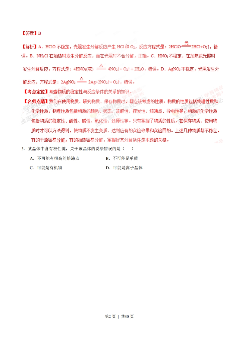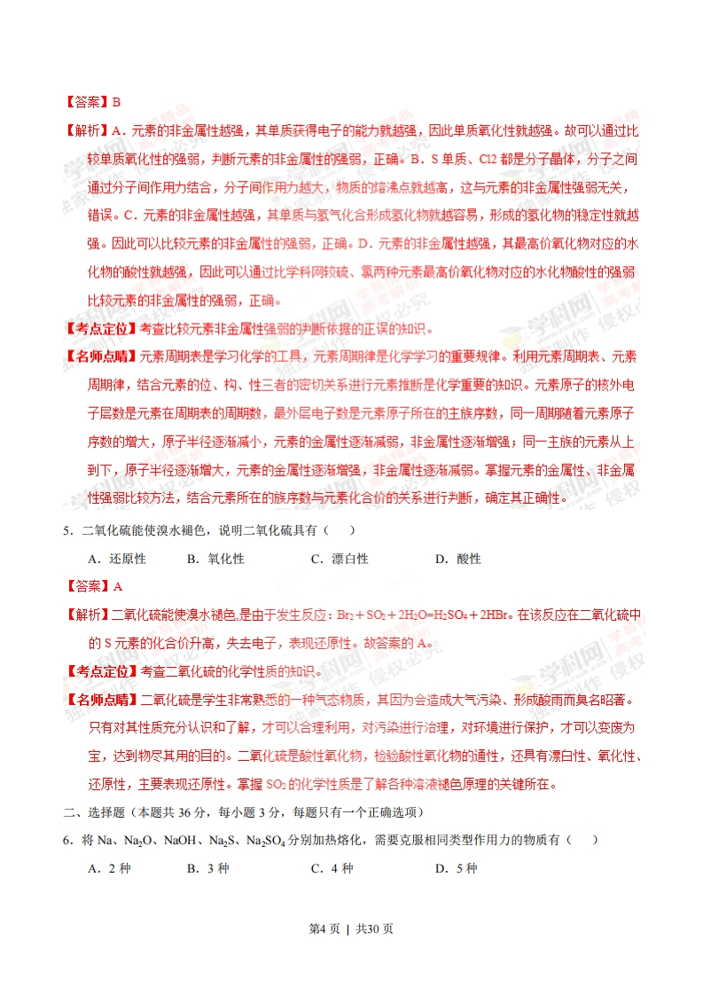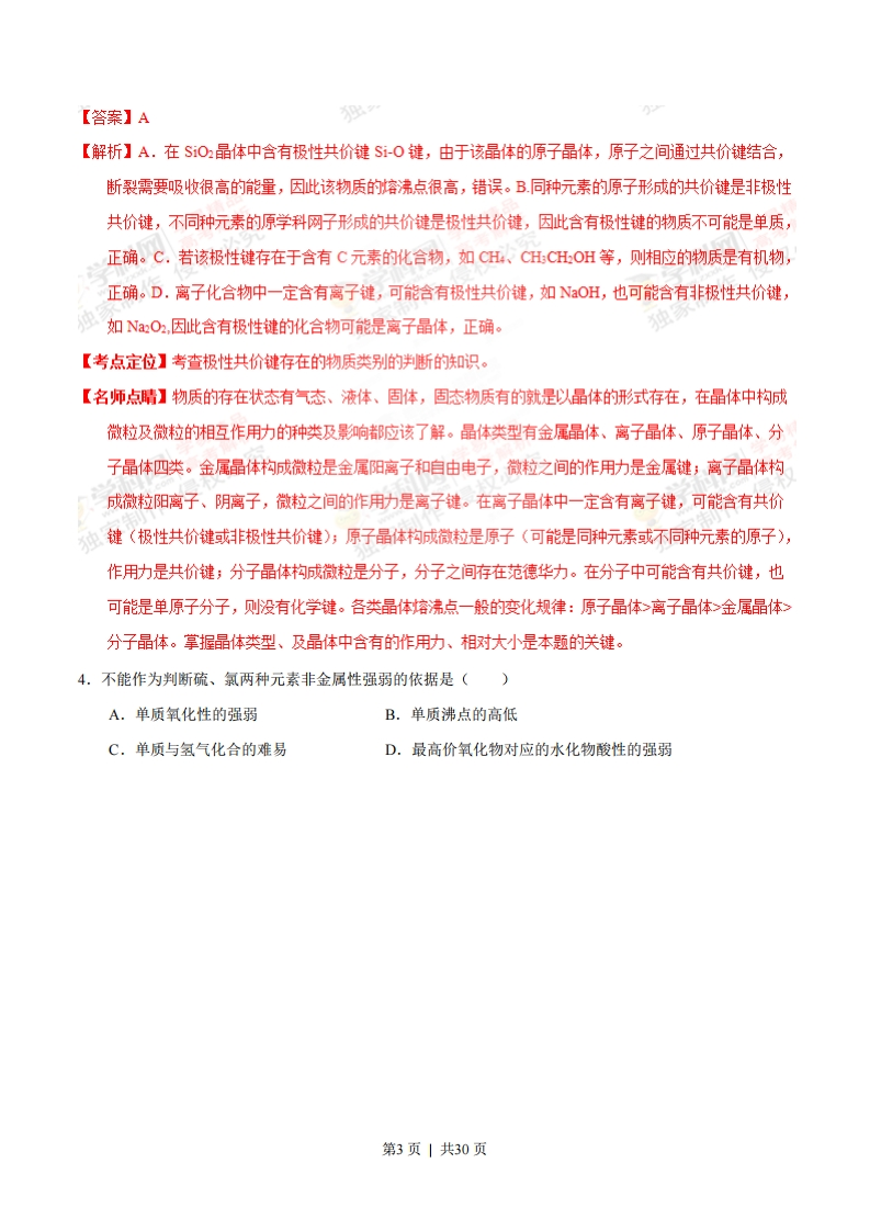 2015年普通高等学校招生全国统一考试(上海卷)化学试卷相对原子质量:H-1C-12N-140-16Na-23C-35.5Ca-40一、选择题(本题共10分,每小题2分,每题只有一个正确选项)1.中国科学技术名词审定委员会已确定第116号元素Lv的名称为敛。关于Lv的叙述错误的是()A.原子序数116B.中子数177C.核外电子数116D.相对原子质量293【答案】D【解析】元素符号左下角表示的是原子核内的质子数,原子核内的质子数等于该元素的原子序数,所以该元素的原子序数是116,正确。B.在原子符号的左上角表示的该元素原子的质量数,质量数就是质子数与中子数的和,所以该原子的中子数是293-116-177,正确。C.对于元素的原子来说,原子核内的质子数等于原子核外的电子数,等于元素的原子序数,所以该原子的原子核外电子数116,正确。D.293只表示该同位素原子的质量数,由于不知道该元素有学科网几种同位素原子,各种同位素原子的含量是多少,因此不能确定该元素的相对原子质量,错误。【考点定位】本题考查了元素原子的符号的表示及相互关系的知识。【名师点晴】物质的性质决定物质的用途,而物质的性质贝侧由物质的结构决定。原子结构是物质结构的基础。要掌握原子的结构及反应变化时是原子的那一构成部分发生变化。原子是由原子核和核外电子构成,原子核是由质子、质子构成。不同元素的原子质子数不同,同一元素的原子质子数相同,而中子数可能不同,原子核外电子数与原子核内质子数相等,等于元素的原子序数。在发生反应事是元素原子的最外层电子发生变化,而原子核不变,在表示元素的原子时,元素符合左上角表示质量数,即质子与中子数的和,左下角表示质子数,由于元素符号已经可以道元素的种类和质子数,因此有时左下角的质子数也可以不写。掌握原子表示的各个角标的含义是本题的关键。2.下列物质见光不会分解的是()A.HCIOB.NHCIC.HNO3D.AgNO;第1页1共30页【答案】B光【解析】A.HC10不稳定,光照发生分解反应产生HC和O,反应方程式是:2HC0二2HC1+O2↑,错误。B.H4C在加热时发生分解反应,而在光照时不会分解,正确。C.O:不稳定,在加热或光照时发生分解反应,方程式是:40,浓△401+01+2H0,错误。D.Ag0不稳定,光照发生分解反应,方程式是:2AgN0,△2Ag+2NO+01,错误。【考点定位】考查物质的稳定性与反应条件的关系的知识。【名师点晴】我们在使用物质、研究物质、保存物质时,都应该考虑的性质。物质的性质包括物理性质和化学性质,物理性质包括物质的颜色、状态、濬解性、挥发性、熔沸点、导电性等。物质的化学性质望包括物质的稳定性、酸性、碱性、氧化性、还原性等。只有拿握了物质的性质,在保存物质、使用物质时才可以方法得到,使物质不发生变质、达到应有的实验效果和实验目的。上述几种物质都不稳定,有的干燥容易分解,有的加热容易分解,掌握好其分解条件是本题的关键。3.某晶体中含有极性键,关于该晶体的说法错误的是()A.不可能有很高的熔沸点B.不可能是单质C.可能是有机物D.可能是离子晶体第2页|共30页【答案】A我0【解析】A.在SO晶体中含有极性共价键Si-0键,由于该晶体的原子晶体,原子之间通过共价键结合,断裂需要吸收很高的能量,因此该物质的容沸点很高,错误。B.同种元素的原子形成的共价键是非极性共价键,不同种元素的原学科网子形成的共价键是极性共价键,因此含有极性键的物质不可能是单质,正确。C,若该极性键存在于含有C元素的化合物,如CH4、CH:CH:OH等,则相应的物质是有机物,正确。D.离子化合物中一定含有离子键,可能合有极性共价键,如NOH,也可能含有非极性共价键,如NO2,因此含有极性键的化合物可能是离子晶体,正确。【考点定位】考查极性共价键存在的物质类别的荆断的知识。【名师点晴】物质的存在状态有气态、液体、固体,固态物质有的就是以晶体的形式存在,在晶体中构成微粒及微粒的相互作用力的种类及影响都应该了解。晶体类型有金属晶体、离子晶体、原子晶体、分子晶体四类。金属晶体构成微粒是金属阳离子和自由电子,微粒之间的作用力是金属键;离子晶体构成微粒阳离子、阴离子,微粒之间的作用功是离子键。在离子晶体中一定含有离子键,可能含有共价键(极性共价键或非极性共价键);原子晶体构成微粒是原子(可能是同种元素或不同种元素的原子),作用力是共价键;分子晶体构成微粒是分子,分子之间存在范德华力。在分子中可能含有共价键,也可能是单原子分子,则没有化学键。各类晶体熔沸点一般的变化规律:原子晶体>离子晶体>金属晶体>分子晶体。掌握晶体类型、及晶体中含有的作用力、相对大小是本题的关键。4.不能作为判断硫、氯两种元素非金属性强弱的依据是()A.单质氧化性的强弱B.单质沸点的高低C.单质与氢气化合的难易D.最高价氧化物对应的水化物酸性的强弱第3页|共30页