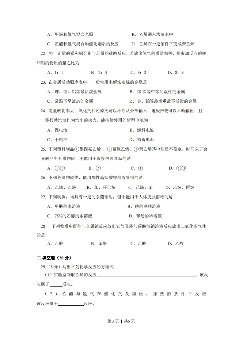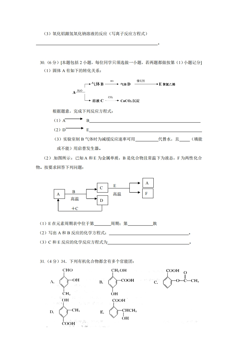 2017年上海市普通高中学业水平等级性考试化学试卷可能用到的原子量:H:10:16C:12C1:35.5A1:27S:32Fe:56Na:23Ba:137卷I一选择思(本题共28小题,每小题2分,共56分。请选出各题中1个符合题意的选项,不选、多选、错选均不给分)1.石油是一种重要能源,人类正面临着石油短缺、油价上涨的难题。下列解决能源问题的方法不当的是A.鼓励个体企业加快煤炭的开采B.研究和开发利用太阳能C.建造水电站开发水利资源D.开发种植可再生能源2.下列分子的空间构型属于直线形的是:A.氨气B.甲烷C.乙烯D.乙炔3.将NH3通过灼热的CO,发现生成一种红色的单质和一种气体单质,这种气体单质是A.02B.H2C.N2D.NO4.铝和氧化铁在高温下的反应中,铝是A.氧化剂B.还原剂C.既不是氧化剂又不是还原剂D.既是氧化剂又是还原剂5.下列有机物命名正确的是A.3,3一二甲基丁烷B.3一乙基丁烷C.2,2一二甲基丁烷D.2,3,3一三甲基丁烷6.在标准状况下,相同体积的下列气体所含物质的质量最小的是A.CH4B.N2C.02D.C2H27.“绿色化学”要求在化工合成过程中,目标产物对反应物的原子利用率达到100%,下列反应类型最符合这一要求的是()A.取代反应B.加聚反应C.氧化反应D.消去反应8.下列性质的比较,正确的是A.酸性:HSiO3>H2CO3B.碱性Mg(OHh>AI(OH3C.稳定性SiH4>PH3D.原子半径N>C9.关于合金的叙述,不正确的是第1页|共6页A.合金的熔沸点一般比组成它们的各成分金属要高B.合金的硬度可以比原金属更高,化学性质也可能和原成分金属不同C.非金属和金属之间也可以形成合金D.合金的用途比纯金属的用途更广。10.某元素负一价阴离子的核外有10个电子,该元素在周期表中的位置是A.二周期IA族B.三周期VIA族C.二周期VIA族D.三周期IA族11.2克氧气含有x个氧分子,则阿伏加德罗常数为A.16xB.32xC.x/16D.x12.下列物质的水溶液呈酸性,并且使水的电离平衡向正方向移动的是:A.NazCO3B.NH CIC.H2SOD.NaHCO13.在N2+3H2≥2NH3(正反应为放热反应)的反应中,为了提高H2的利用率,可以采取的措施为A.升温B.增大压强C.使用催化剂D.增大H2的浓度14.在浓硝酸和浓氢氧化钠溶液中均不能溶解的单质是:A.铁B.铝C.银D.硅15.下列各组离子在强碱性溶液中可以大量共存的是A.Fe3+、Na+、SCN-、SOu2-B.AIO2-、Na、K+、SO42-C.Ba2+、Na*、SO2-、CD.C6HO-、NO-、Ht、Na16.下列物质中与CH互为同系物的是A.C6H6B.C2H4C.C3HsD.C2H217.分别将下列烃完全燃烧,生成的水蒸气与二氧化碳物质的量之比为1:1的是A.CHaB.CsH16C.C6H6D.CsH1218.下列各组中属于同素异形体的是A.12C与14℃B.金刚石与石墨C.CH4与CH6D.H20与D2019.下列各组不属于同分异构体的是A.丙三醇与乙醇B.2一甲基丙烷与正丁烷C.葡萄糖和果糖D.乙酸与甲酸甲酯20.下列物质中不能发生银镜反应的是A.乙醛B.乙醇C.甲酸D.葡萄糖21.下列物质间在一定条件下发生反应,主要为取代反应类型的是第2页|共6页A.甲烷和氯气混合光照B.乙烯通入浓溴水中C.乙醛和氢气混合加催化剂后的反应D.乙烯在一定条件下变成聚乙烯22.将一定量的镁和铝分别与足量的盐酸反应,若放出氢气的质量相等,则参加反应的镁和铝的物质的量之比为A.1:1B.2:3C.3:2D.8:923.在金属活动顺序表中,一般常用电解法治炼的金属是A.钾、钠、铝等最活泼金属B.锌,铁等中等活泼性的金属C.常温下呈液态的金属D.金、铂等最贵重最不活泼的金属24.能量转化率大:氧化剂和还原剂可以不断从外部输入:电极产物可以不断输出:且能代替汽油作为汽车的动力,能持续使用的新型电池为A.锂电池B.燃料电池C.干电池D.铅蓄电池25.下列塑料制品①聚四氟乙烯,②聚氯乙烯,③聚乙烯其中性质不稳定,时间久了会分解产生有毒物质,不能用于直接包装食品的是A.①②B.②C.①D.①③26.下列各组物质中,能用酸性高锰酸钾溶液鉴别的是A.乙烯、乙炔B.苯、环己烷C.己烯、苯D.乙烷、丙烷27.下列物质,均具有一定的杀菌作用,但不能用于人体皮肤消毒的是A.甲醛的水溶液B.碘的酒精溶液C.75%的乙醇的水溶液D.苯酚的稀溶液28.下列物质中既能与金属钠反应放出氢气又能与碳酸氢钠溶液反应放出二氧化碳气体的是A.乙醇B.苯酚C.乙醛D.乙酸二填空题(20分)29.(8分)写出下列化学反应的方程式(1)实验室制取乙烯的反应该反应属于反应。(2)乙醛与氢气在催化剂及加压、加热的条件下反应该反应属于」反应。第3页|共6页