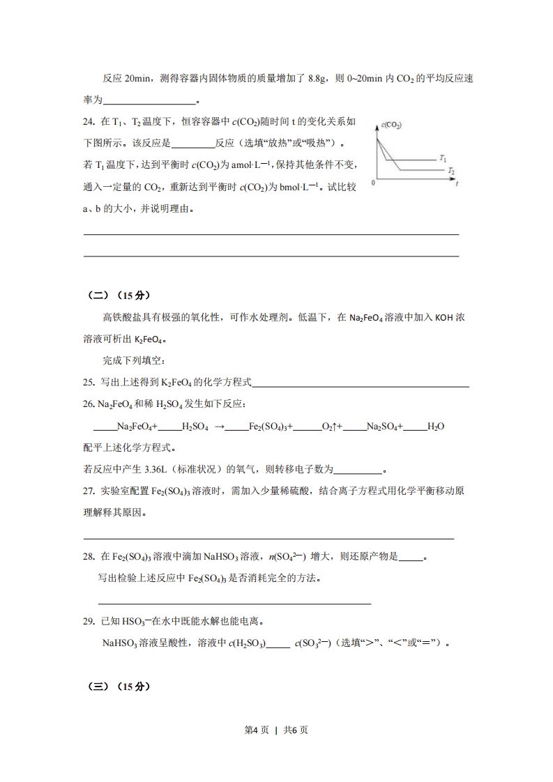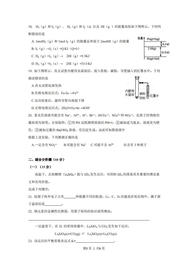 2018年上海市普通高中学业水平等级性考试化学试卷相对原子质量:C-120-16一、选择题(每题只有一个正确答案,每题2分,共计40分)1.2018年3月《Nature》杂志上刊登了通过测量行星物质中48Ca/44Ca的比值,揭示了行星演变的关系。48Ca和4“℃a具有A.相同的质量数B.不同的质子数B.C相同的中子数D.相同的电子数2.我国自主研制的大型客机C919的机身大量使用铝锂合金材料。这是利用了铝锂合金性质中的A.高强度、低密度B.高强度、导热性C低密度、导电性D.导电性、导热性3.下列过程中,仅克服分子间作用力的是A.氯化钾熔融B.碳酸钠溶于水C.碘升华D.晶体硅熔融4.下列物质溶于水,溶液温度降低的是A.浓硫酸B.NaOHC.NaClD.NH CI5.有机反应一般不具有的特点是A.反应比较复杂B.产率较高C.副产物较多D.反应速率较慢6.下列固体中经充分加热分解,无固体残留的是A.NH4HCO3B.NaHCO3C.Al(OH)3D.CaCO:7.下列有关二氧化碳的描述正确的是A.含有非极性键B.是直线形分子C.属于极性分子D.结构式为C=O=08.下列变化说明浓硫酸具有脱水性的是A.铁遇浓硫酸发生变化B.蔗糖遇浓硫酸变黑C.加热时碳与浓硫酸反应D.加热时铜与浓硫酸反应9.海水提溴的过程不包括A.浓缩B.氧化C.提取D.灼烧第1页1共6页10.下列转化不能通过一步反应实现的是AHS+0,+S02B.S02H,0→HS03C.S+02+S03D.S0,+H0→HS011.侯氏制碱法中,使NHCI从母液中析出的措施不包括A通入二氧化碳B.冷却C通入氨气D.加入研细的食盐12.与互为同分异构体的是A.OHCCHCHCHOB.CH CHOCH,CHOHC.CH;CH=CHCOOHD.HOCH2 CH=CHCH2OH13.醇脱水得到烯烃所需的试剂和条件是A.浓氢溴酸酸,加热B.NaOH/H2O,加热C.浓硫酸,加热D.NaOH/C2H OH,加热14.关于硫酸工业中的催化氧化反应,叙述正确的是A.是吸热反应B.在常压下进行C.在沸腾炉中进行D.使用铁触媒作催化剂15.下列关于含氮微粒的表述正确的是A.N2的电子式为NNB.N3-的最外层电子数为6C.N一的质子数是20D.氮原子未成对电子的电子云形状相同16.重量法测定硫酸铜晶体结晶水含量时,会引起测定值偏高的是A.未作恒重操作B.硫酸铜部分分解C.硫酸铜晶体未完全失水D.坩埚放在空气中冷却17.铝元素之间的相互转化如下图所示,下列叙述正确的是③①A1(OH田:A13+⊙+A102②A.实现①的转化,可通入过量CO2B.实现②的转化,可加入过量NaOH溶液C.实现③的转化,可加入过量NaOH溶液D.实现④的转化,可通入过量NH第2页1共6页18.H2(g)和2(g)、H2(g)和2(S)以及HⅢ(g)的能量高低如下图所示,下列判断错误的是能量HgHg)A.1molH2(g)和1mol2(g)的能量总和高于2 molHI(g)的能量9.3kB.2(g)→2(s)+QKJ(Q0)2H)53.0kJC.H2(g)+H2(g)→2HΠ(g)+9.3KJH®rD.H2 (g)+I2 (s)2HI (g)+53.0 KJ19.如下图所示,具支试管内壁用水湿润后,放入铁粉、碳粉,导管插入到红墨水中。下列描述错误的是A.具支试管底部发热B.负极电极反应式:Fe2e→Fe2+内壁用水湿润碳粉©铁粉红墨水C反应结束后,最终导管内液面下降D.正极电极反应式:2H2O+O2+4e→40H20.某无色溶液可能含有Na*、AIt、H、B一、HCO3一、SO2-和NO3一,且离子的物质的量浓度均相等。分别取样:①用PH试纸测得溶液的PH=1:②滴加适当氯水,溶液变为橙色:③滴加过量的B(OH2溶液,有沉淀生成。由此可知原溶液中根据上述实验,下列推测正确的是A一定含有NO一B.可能含有NaC.可能不含AItD.含有3种离子二、综合分析题(60分)(一)(15分)高温下,正硅酸锂(Li4Si04)能与CO2发生反应,对控制C02的排放具有重要的理论意义和实用价值。完成下列填空:21.硅原子核外电子占有种能量不同的轨道:L、C、Si的最高价氧化物中,属于原子晶体的是22.钠元素的金属性比锂强,用原子结构的知识说明理由。一定温度下,在2L的密闭容器中,LiSO4与CO2发生如下反应:LiSiOa(s)+CO2(g)Li2SiO3(s)+Li2CO3(s)23.该反应的平衡常数表达式K=第3页1共6页