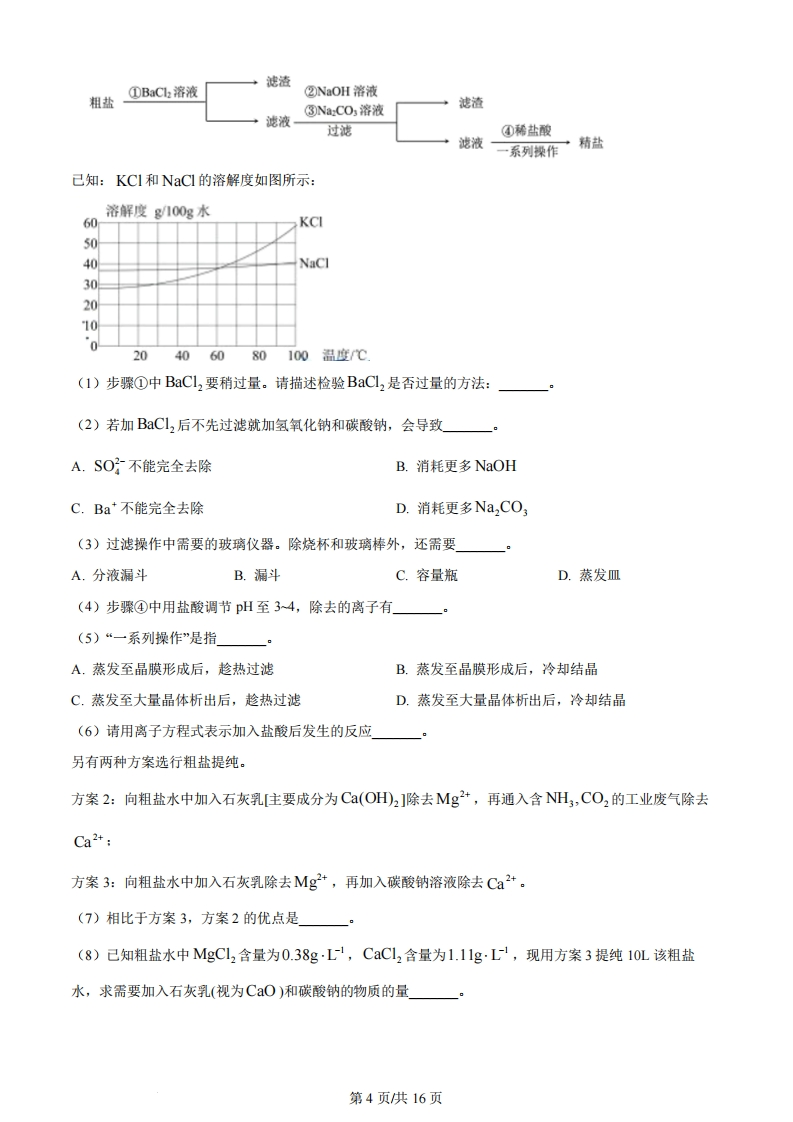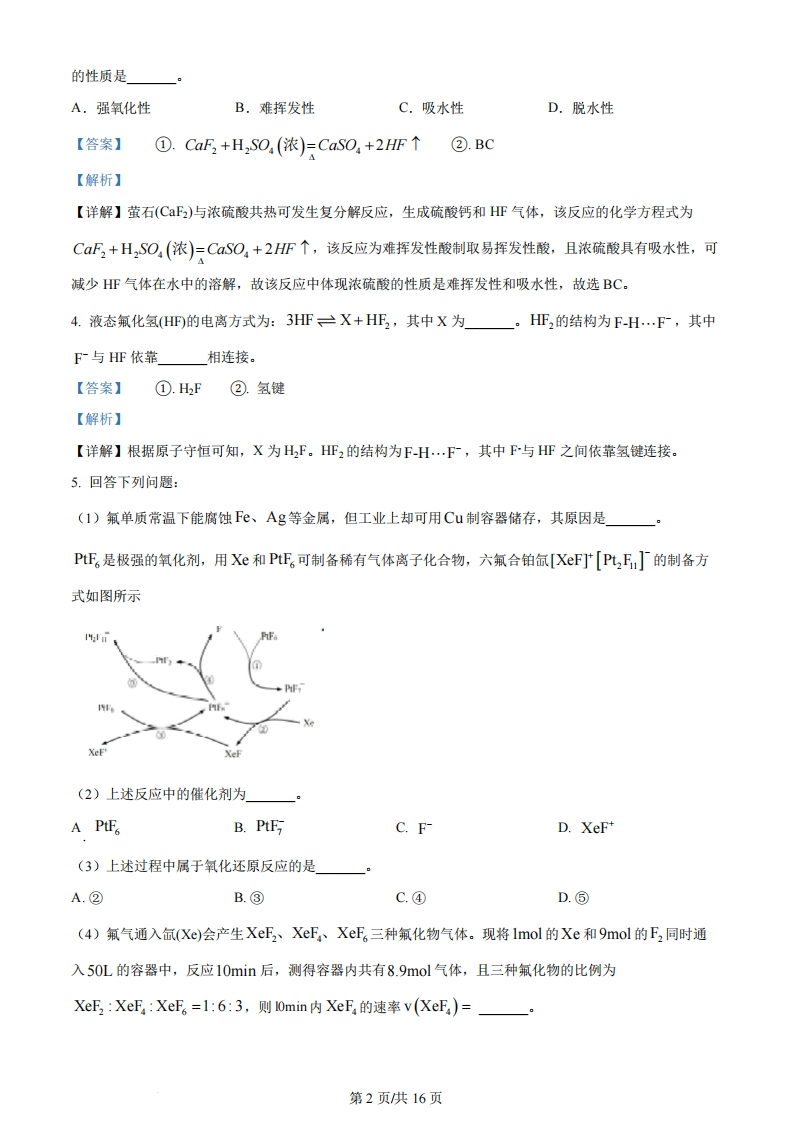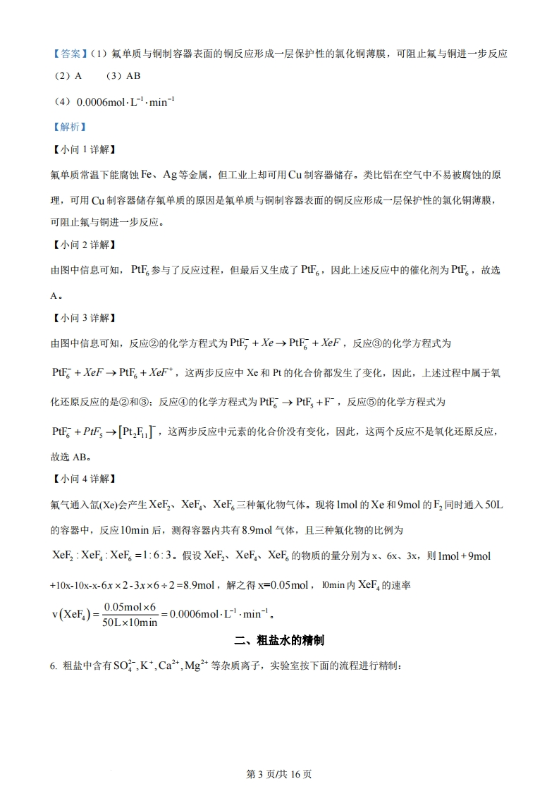 2024年上海市普通高中学业水平等级性考试化学试卷(考试时间60分钟,满分100分)注意:试卷为回忆版。试题来自网络,非官方渠道,学科网不对真实性负责,请自行鉴别。一、氟及其化合物氟元素及其化合物具有广泛用途。1.下列关于氟元素的性质说法正确的是A.原子半径最小B.原子第一电离能最大C.元素的电负性最强D.最高正化合价为+7【答案】C【解析】【详解】A.同一周期主族元素从左至右,原子序数递增、原子半径递减,氟原子在本周期主族元素中半径最小,但氢原子半径小于氟原子半径,故A错误:B.同一周期主族元素从左至右,第一电离能有增大的趋势,氟原子在本周期主族元素中第一电离能最大,但氨原子的第一电离能大于氟原子,故B错误:C.据同一周期主族元素从左至右电负性增强、同一主族从上至下电负性减弱可知,氟元素的电负性最强,故C正确:D.氟元素无正化合价,故D错误:故答案为:C。2.下列关于18F与9F说法正确的是A.是同种核素B.是同素异形体C.9F比18F多一个电子D.19F比18F多一个中子【答案】D【解析】【详解】A.18F与19F质子数相同、中子数不同,因此两者是不同种核素,A错误:B.同素异形体指的是同种元素的不同单质:18℉与19℉是两种不同的原子,不是单质,因此两者不是同素异形体,B错误:C.同位素之间质子数和电子数均相同,19F比18F多一个中子,C错误:D.19F的中子数是10,18F只有9个中子,19F比18F多一个中子,D正确。本题选D。3.萤石(CF2)与浓硫酸共热可制备HF气体,写出该反应的化学方程式:该反应中体现浓硫酸第1页供16页的性质是」A.强氧化性B.难挥发性C.吸水性D.脱水性【答案】①.CaE+H,SO,(浓)=CaS0,+2HF个②.BC【解析】【详解】萤石(CF2)与浓硫酸共热可发生复分解反应,生成硫酸钙和HF气体,该反应的化学方程式为Ca5,+HzSO,(浓)=CaSO,+2HF个,该反应为难挥发性酸制取易挥发性酸,且浓硫酸具有吸水性,可减少HF气体在水中的溶解,故该反应中体现浓硫酸的性质是难挥发性和吸水性,故选BC。4.液态氟化氢(HF)的电离方式为:3HFX+HF2,其中X为。HF2的结构为FH.F,其中F与HF依靠相连接。【答案】①.H2F②.氢键【解析】【详解】根据原子守恒可知,X为HF。HF2的结构为F-H,F,其中F与HF之间依靠氢键连接。5.回答下列问题:(1)氟单质常温下能腐蚀F、Ag等金属,但工业上却可用Cu制容器储存,其原因是PtF是极强的氧化剂,用Xe和PtF,可制备稀有气体离子化合物,六氟合铂氙[XF][PtE厂的制备方式如图所示(2)上述反应中的催化剂为A PtFB.PtFC.F-D.XeF+(3)上述过程中属于氧化还原反应的是A.②B.③C.④D.⑤(4)氟气通入氙(Xe)会产生XeF2、XeF、XeF,三种氟化物气体。现将lmol的Xe和9mol的F2同时通入50L的容器中,反应10min后,测得容器内共有8.9mol气体,且三种氟化物的比例为XeE,:XeF:XeF。=l:6:3,则10min内XeF的速率v(XeF)=_第2页供16页【答案】(1)氟单质与铜制容器表面的铜反应形成一层保护性的氯化铜薄膜,可阻止氟与铜进一步反应(2)A(3)AB(4)0.0006mol-L.min-【解析】【小问1详解】氟单质常温下能腐蚀F、Ag等金属,但工业上却可用Cu制容器储存。类比铝在空气中不易被腐蚀的原理,可用C制容器储存氟单质的原因是氟单质与铜制容器表面的铜反应形成一层保护性的氯化铜薄膜,可阻止氟与铜进一步反应。【小问2详解】由图中信息可知,PtF。参与了反应过程,但最后又生成了PF。,因此上述反应中的催化剂为PF。,故选【小问3详解】由图中信息可知,反应②的化学方程式为PtF,+X→PtF+XF,反应③的化学方程式为PtF+XF→PtF,+XeF+,这两步反应中Xe和Pt的化合价都发生了变化,因此,上述过程中属于氧化还原反应的是②和③:反应④的化学方程式为PF→PtF,+F,反应⑤的化学方程式为PF。+PF→[Pt,,J,这两步反应中元素的化合价没有变化,因此,这两个反应不是氧化还原反应,故选AB。【小问4详解】氟气通入氙(Xe)会产生XeF2、XeF、XeF,三种氟化物气体。现将lmol的Xe和9mol的F,同时通入50L的容器中,反应10min后,测得容器内共有8.9mol气体,且三种氟化物的比例为XeF2:XeF,:XeF,=l:6:3。假设XeF2、XeF、XeF.的物质的量分别为x、6x、3x,则lmol+9mol+10x-10x-x-6x×2-3x×6÷2=8.9mol,,解之得x=0.05mol,10min内XeF4的速率0.05mol×6=0.0006mol.L1.min.v(XeF,)=50Lx10min二、粗盐水的精制6.粗盐中含有S02,K+,Ca2+,Mg2+等杂质离子,实验室按下面的流程进行精制:第3页供16页