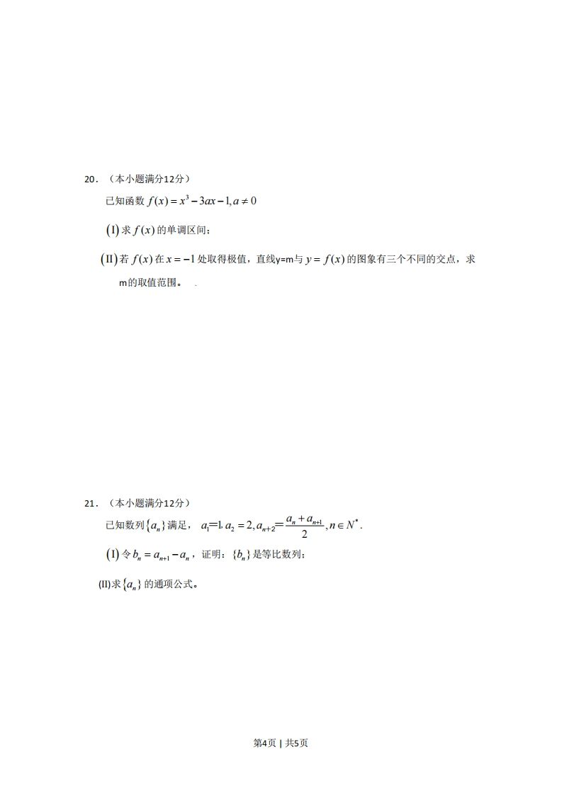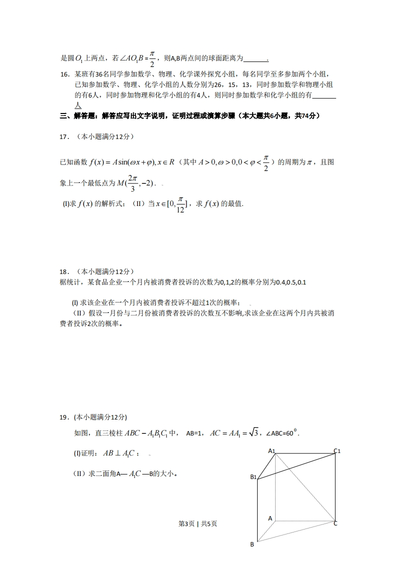 2009年普通高等学校招生全国统一考试文科数学(必修+选修)(陕西卷)第卷一、选择题:在每小题给出的四个选项中,只有一项是符合题目要求的(本大题共12小题,每小题5分,共60分)1.设不等式x2-x≤0的解集为M,函数f(x)=ln(1-|xD的定义域为N,则M⌒N为()(A)[0,1)(B)(0,1)(c)[0,1](D)(-1,0]2.若tana=2,则2sina-cosc的值为0sina +2cosa(A)0®)3(C)1(D)543.函数f(x)=√2x-4(x≥4)的反函数为0(A)产(9=2x2+4x≥0)B)(x)=x2+4x≥2)(0)产(3=5x+2x20)0fm)=5r2+20x≥2)4.过原点且倾斜角为60°的直线被圆x2+y2-4y=0所截得的弦长为(A)V5(B)2(C)V6(D)2V55.某单位共有老、中、青职工430人,其中青年职工160人,中年职工人数是老年职工人数的2倍。为了解职工身体状况,现采用分层抽样方法进行调查,在抽取的样本中有青年职工32人,则该样本中的老年职工人数为()(A)9(B)18(C)27(D)366.若(1-2)09=a,+a,x++a0wx20(x∈R),则号+是++的值为22300g(C)2(A)2(B)0(c)-1(D)-27.”m>n>0"是"方程mx2+y2=1表示焦点在y轴上的椭圆"的()(A)充分而不必要条件(B)必要而不充分条件(C)充要条件(D)既不充分也不必要条件8.在△ABC中,M是BC的中点,AM=1,点P在AM上且满足学A证=2P,则FA·(+P元)等于()()第1页1共5页(A)4(B)(c)-40-4399.从1,2,3,4,5,6,7这七个数字中任取两个奇数和两个偶数,组成没有重复数字的四位数,其中奇数的个数为0(A)432(B)288(C)216(D)10810.定义在R上的偶函数f(x)满足:对任意的x,x2∈[0,+o)(3,≠x2),有fx)-fs)<0.则02一为(A)f(3)0,o>0,0<0<交)的周期为元,且图象上一个最低点为M子-2).⑩求f(x)的解析式:()当x∈[0,元],求fx)的最值,1218.(本小题满分12分)椐统计,某食品企业一个月内被消费者投诉的次数为0,1,2的概率分别为0.4,0.5,0.1(四求该企业在一个月内被消费者投诉不超过1次的概率:(Ⅱ)假设一月份与二月份被消费者投诉的次数互不影响,求该企业在这两个月内共被消费者投诉2次的概率。19.(本小题满分12分)如图,直三棱柱ABC-A,B,C中,AB=1,AC=A4=√5,∠ABC=60°.(0证明:AB⊥AC:A1(I)求二面角A一A,C一B的大小。B1第3页1共5页