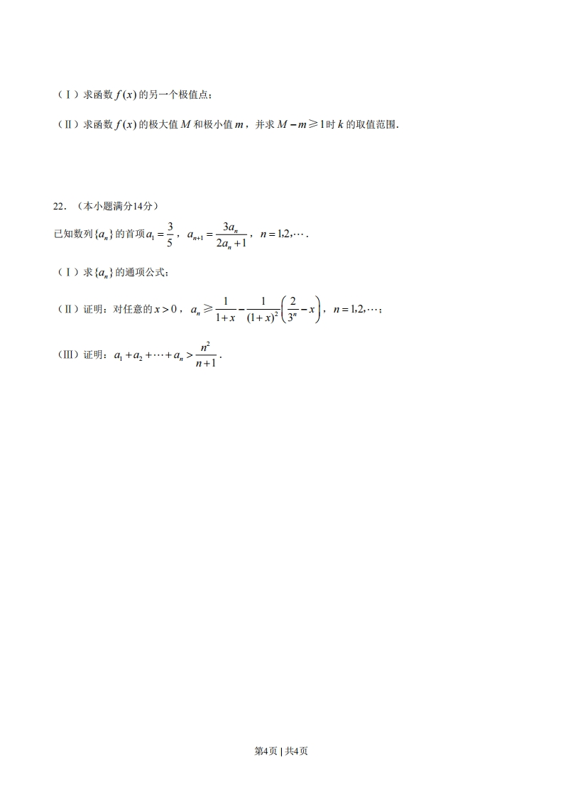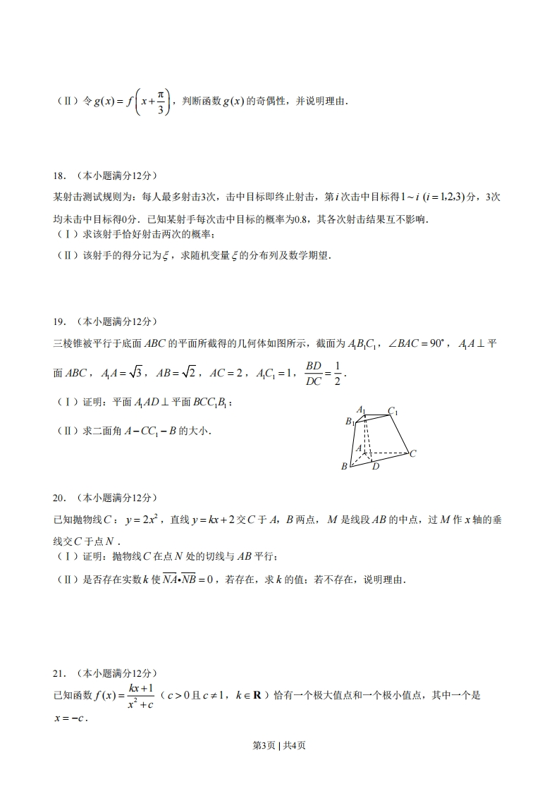 2008年普通高等学校招生全国统一考试(陕西卷)理科数学(必修+选修川)一、选择题:在年小题给出的四个选项中,只有一项是符合题目要求的(本大题共12小题,年小题5分,共60分).1.复数(2+0等于()1-2iA.iB.-iC.1D.-12.已知全集U={1,2,3,4,5},集合A={x|x2-3x+2=0},B={x|x=2a,a∈A,则集合à(AUB)中元素的个数为()A.1B.2C.3D.43.△ABC的内角4,B,C的对边分别为a,b,c,若c=V2,b=V6,B=120°,则a等于()A.6B.2c.5D.24.己知{an}是等差数列,41+a2=4,a,+ag=28,则该数列前10项和So等于()A.64B.100C.110D.1205.直线√3x-y+m=0与圆x2+y2-2x-2=0相切,则实数m等于()A.5或-5B.-5或3V5C.-35或V5D.-3W5或3W56.“a=”是“对任意的正数x,2x+≥1”的()8A.充分不必要条件B.必要不充分条件C.充要条件D.既不充分也不必要条件7.己知函数f(x)=2x+3,f-(x)是f(x)的反函数,若mn=16(m,neR*),则f-(m)+(m)的值为()A.-2B.1C.4D.108.双曲线”=1(a>0,b>0)的左、右焦点分别是F,F2,过F作倾斜角为30°的直线交双曲线右支于M点,若MF,垂直于x轴,则双曲线的离心率为()A.6B.5C.迈D.39.如图,a⊥B,a∩B=1,A∈a,B∈B,A,B到1的距离分别是a和b,AB与a,B所成的角第1页|共4页分别是0和p,AB在,B内的射影分别是m和n,若a>b,则()A.0>,m>nB.0>o,mnBy≥l,10.已知实数x,y满足{y≤2x-1,如果目标函数z=x-y的最小值为-1,则实数m等于()x+y≤mA.7B.5C.4D.311.定义在R上的函数f(x)满足f(x+y)=f(x)+fy)+2y(x,y∈R),f(I)=2,则f(-3)等于()A.2B.3C.6D.912.为提高信息在传输中的抗干扰能力,通常在原信息中按一定规则加入相关数据组成传输信息.设定原信息为a442,a,∈{0,1}(i=0,l,2),传输信息为h4a,42h,其中h=a⊕a,h1=h⊕a2,田运算规则为:0⊕0=0,0⊕1=1,1⊕0=1,1⊕1=0,例如原信息为111,则传输信总为01111.传输信息在传输过程中受到干扰可能导致接收信息出错,则下列接收信息一定有误的是()A.11010B.01100C.10111D.00011二、填空题:把答案填在答题卡相应题号后的横线上(本大题共4小题,每小题4分,共16分),1.lim+an+l-2,则a=n+a14.长方体ABCD-A,B,CD的各顶点都在球O的球面上,其中AB:AD:A4=1:1:√2.A,B两点的球面距离记为m,4,D,两点的球面距离记为n,则心的值为n15.关于平面向量a,b,c,有下列三个命题:①若ab=ac,则b=c.②若a=(1,k),b=(-2,6),a∥b,则k=-3.③非零向量a和b满足|a日b曰a-b|,则a与a+b的夹角为60°.其中真命题的序号为」(写出所有真命题的序号)16.某地奥运火炬接力传递路线共分6段,传递活动分别由6名火炬手完成.如果第一棒火炬手只能从甲、乙、丙三人中产生,最后一棒火炬手只能从甲、乙两人中产生,则不同的传递方案共有种.(用数字作答).三、解答题:解答应写出文字说明,证明过程或演算步骤(本大题共6小题,共74分)17.(本小题满分12分)已知函数f)=2 sin cos-2W5sin2+5.(I)求函数f(x)的最小正周期及最值:第2页|共4页(Ⅱ)令g(x)=判断函数g(x)的奇偶性,并说明理由.18.(本小题满分12分)某射击测试规则为:每人最多射击3次,击中目标即终止射击,第i次击中目标得1~i(i=1,2,3)分,3次均未击中目标得0分.己知某射手每次击中目标的概率为0.8,其各次射击结果互不影响.(I)求该射手恰好射击两次的概率:(Ⅱ)该射手的得分记为5,求随机变量5的分布列及数学期望.19.(本小题满分12分)三棱锥被平行于底面ABC的平面所截得的几何体如图所示,截面为AB,C1,∠B4C=90°,AA⊥平面BC,AA=5,AB=V反,AC=2,4C,=1,B2-DC-21(I)证明:平面AAD⊥平面BCCB:B(Ⅱ)求二面角A-CC,-B的大小.20.(本小题满分12分)己知抛物线C:y=2xr2,直线y=G+2交C于A,B两点,M是线段AB的中点,过M作x轴的垂线交C于点N,(I)证明:抛物线C在点N处的切线与AB平行:(Ⅱ)是否存在实数k使NANB=0,若存在,求k的值:若不存在,说明理由.21.(本小题满分12分)已知函数fx)=+!(c>0且c≠,kR)恰有一个极大值点和一个极小值点,其中一个是x+cX=-C.第3页|共4页
