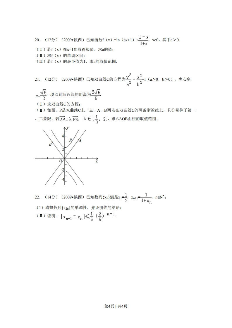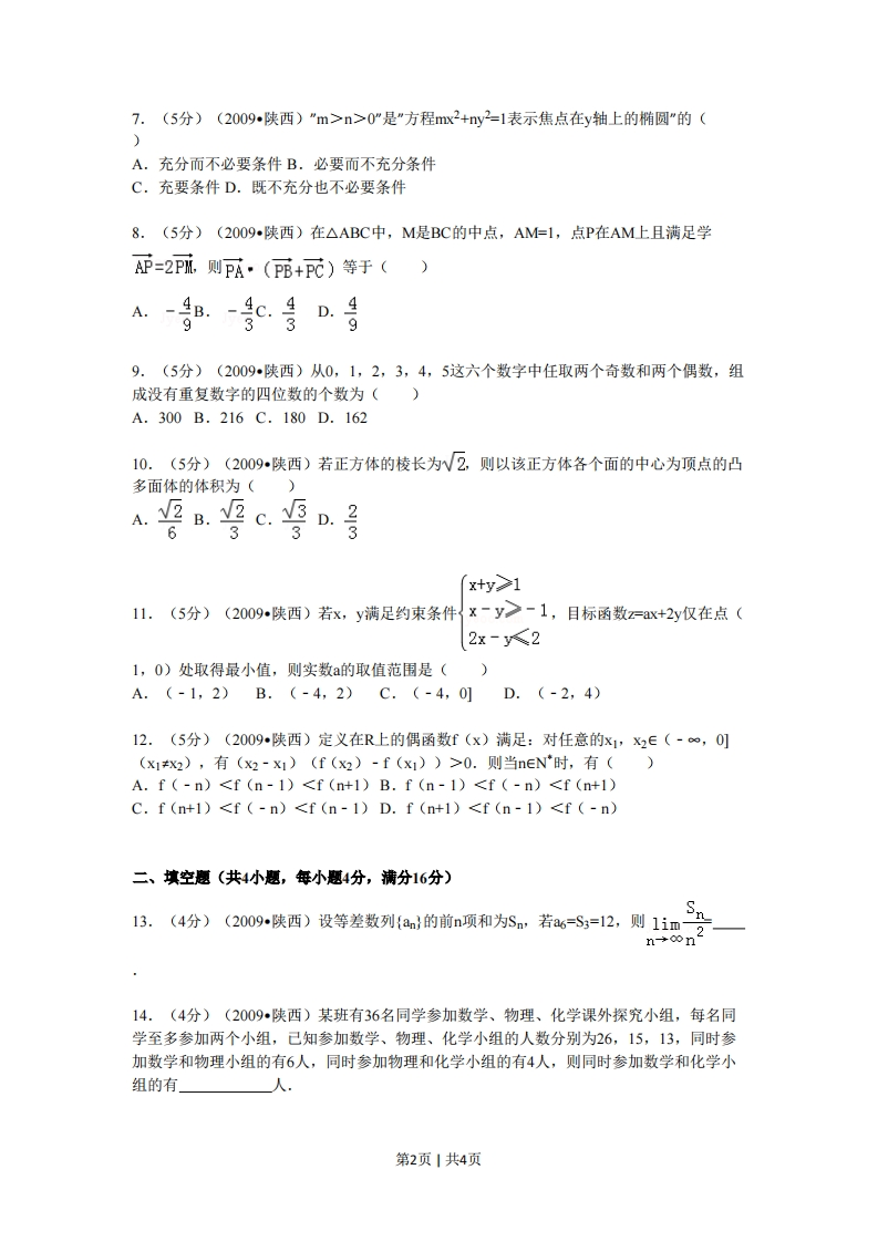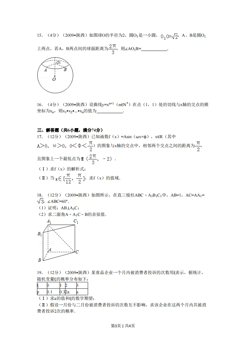 2009年陕西省高考数学试卷(理科)一、选择题(共12小题,每小题5分,满分60分)1.(5分)(2009陕西)设不等式x2-x≤0的解集为M,函数f(x)=n(1-风)的定义域为N,则MnN为()A.[0,1)B.(0,1)C.0,1]D.(-1,0]2.(5分)(209~陕西)已知2是纯虚数,Z+2是实数,那么2等于()1-iA.2i B.iC.-i D.-2i3.(5分)(2009陕西)函数F(x)=√2x-4(x>4)的反函数为()Af1(x)=号x242(x>0)B.f1(x)=x242(x>2)C.f1(x)=x244(x>0)D.f1(x)=x244(x>2)4.(5分)(2009:陕西)过原点且倾斜角为60°的直线被圆x2+y2-4y=0所截得的弦长为(BA.3 B.2 C.6 D.235.(5分)(2009.陕西)若3sina+cosa=0,则1—的值为()cos-a+sin2aA9.号c号33D.-26.(5分)(2009陕西)若(1-2x)2009=a0+a1x++a2009x2009(x∈R),则a1a2+…+a200的值为()2+22…2200gA.2B.0C.-1D.-2第1页1共4页7.(5分)(2009.陕西)"m>n>0是"方程mx2+ny2=1表示焦点在y轴上的椭圆"的(A.充分而不必要条件B.必要而不充分条件C.充要条件D.既不充分也不必要条件8.(5分)(2009陕西)在△ABC中,M是BC的中点,AM=1,点P在AM上且满足学AP=2Pi,则FA·(+P元)等于()A-号B.含c.号D号939.(5分)(2009陕西)从0,1,2,3,4,5这六个数字中任取两个奇数和两个偶数,组成没有重复数字的四位数的个数为()A.300B.216C.180D.16210.(5分)(2009,陕西)若正方体的棱长为√2,则以该正方体各个面的中心为顶点的凸多面体的体积为()AB.9c号D号633xty 111.(5分)(2009陕西)若x,y满足约束条件{X-y≥-1,目标函数=ax+2y仅在点(2x-y≤21,0)处取得最小值,则实数a的取值范围是()A.(-1,2)B.(-4,2)C.(-4,0]D.(-2,4)12.(5分)(2009·陕西)定义在R上的偶函数f(x)满足:对任意的x1,2∈(-∞,0](x12),有(X2-X1)(f(x2)-f(x1))>0.则当neN时,有()A.f(-n)0,0>0,0<中<凸)的图象与x轴的交点中,相邻两个交点之间的距离为兀且图象上一个最低点为M(,-2)(I)求f(x)的解析式:(I)当xE受,受求)的值战18.(12分)(2009陕西)如图所示,在直三棱柱ABC-AB1C1中,AB=1,AC=AA1=√3LABC=60°.(1)证明:AB⊥AC:(2)求二面角A-A1C-B的余弦值.ACB19.(12分)(2009·陕西)某食品企业一个月内被消费者投诉的次数用表示,据统计,随机变量的概率分布如下:pp.1 0.32a a(I)求a的值和的数学期望:(Ⅱ)假设一月份与二月份被消费者投诉的次数互不影响,求该企业在这两个月内共被消费者投诉2次的概率.第3页1共4页