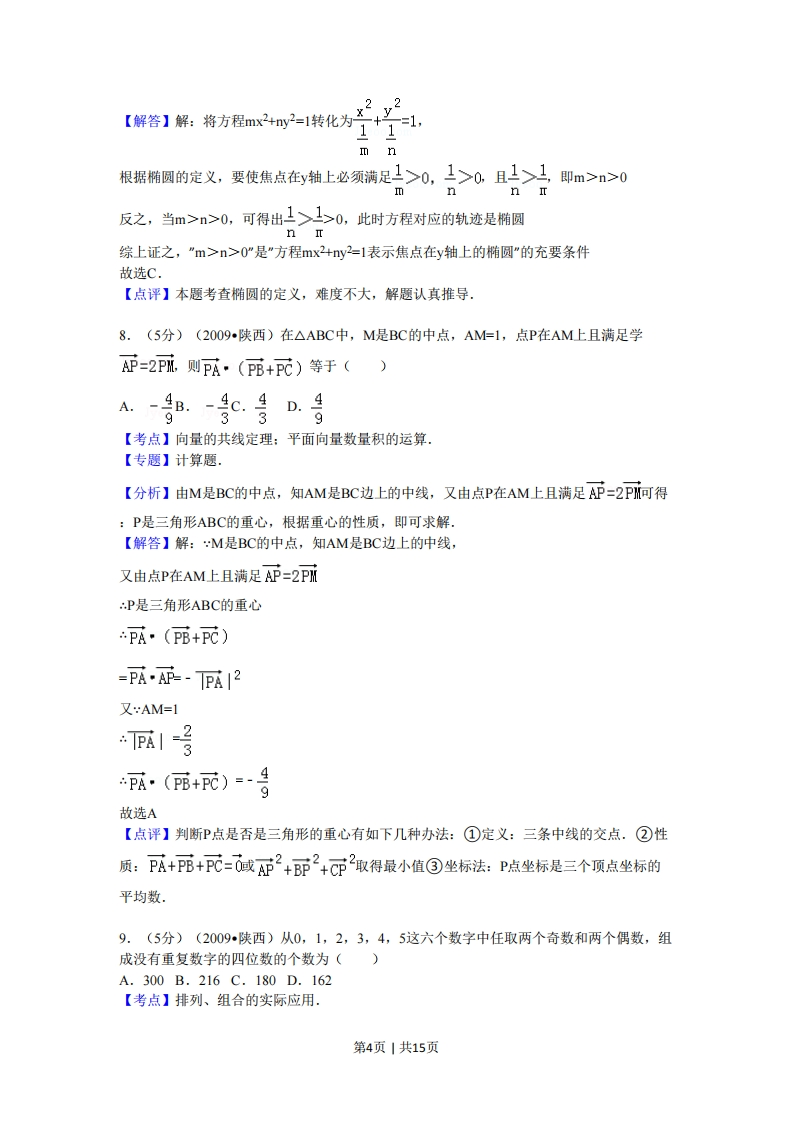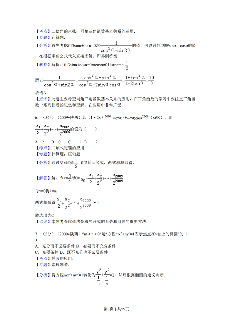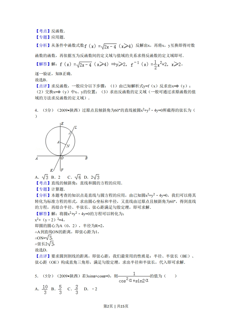 2009年陕西省高考数学试卷(理科)一、选择题(共12小题,每小题5分,满分60分)1.(5分)(2009陕西)设不等式x2-x≤0的解集为M,函数f(x)=n(1-x)的定义域为N,则MnN为()A.[0,1)B.(0,1)C.0,1]D.(-1,0]【考点】函数的定义域及其求法:元素与集合关系的判断。【专题】计算题.【分析】先求出不等式的解集和函数的定义域,然后再求两个集合的交集,【解答】解:不等式x2-x≤0转化为x(x-1)≤0解得其解集是{x0sX≤1},而函数f(x)=n(1-)有意义则需:1-风>0解得:-14)的反函数为()Af1()=号242(x>0)B.f1()=x242(x>2)c.f1()=号x24(x>0)D.f1(x)=x244(x>2)第1页1共15页【考点】反函数【专题】应用题【分析】从条件中函数式数F(x)=√2x-4(x>4)反解出x,再将x,y互换即得对数函数的函数,再依据互为反函数间的定义域与值域的关系求得反函数的定义域即可.【解答】解:f(x)=2x-4(x>4)y>2,f1()=242,x>2,逐一验证,知B正确.故选B.【点评】求反函数,一般应分以下步骤:(1)由己知解析式y=f(x)反求出x中(y):(2)交换x=中(y)中x、y的位置:(3)求出反函数的定义域(一般可通过求原函数的值域的方法求反函数的定义域).4.(5分)(2009陕西)过原点且倾斜角为60°的直线被圆x2+y2-4y=0所截得的弦长为(0BA.3 B.2 C.6 D.23【考点】直线的倾斜角:直线和圆的方程的应用.【专题】计算题【分析】本题考查的知识点是直线与圆方程的应用,由己知圆x2+y2-4y0,我们可以将其转化为标准方程的形式,求出圆心坐标和半径,又直线由过原点且倾斜角为60°,得到直线的方程,再结合半径、半弦长、弦心距满足勾股定理,即可求解.【解答】解:将圆x2+y2-4y=0的方程可以转化为:x2+(y-2)2=4,即圆的圆心为A(0,2),半径为R=2,∴A到直线ON的距离,即弦心距为1,0N=V3弦长2√3,故选D.【点评】要求圆到割线的距离,即弦心距,我们最常用的性质是:半径、半弦长(BE)、弦心距(OE)构成直角三角形,满足勾股定理,求出半径和半弦长,代入即可求解.5.(5分)(2009-陕西)若3sina+cosa=0,则的值为()cos-a+sin2aA9B号c号D.-2第2页|共15页【考点】二倍角的余弦:同角三角函数基本关系的运用.【专题】计算题.【分析】首先考虑由3sina+cosa=0求—的值,可以联想到解sina,cosa的值cos2a+sin2a,在根据半角公式代入直接求解,即得到答案.【解答】解析:由3sina+cosa=0→cosa≠0且ana=-】所以1cos2a+sin2a 1+tan2a 10cos2a+sin2a cos2a+2sina cosa1+2tana3故选A.【点评】此题主要考查同角三角函数基本关系的应用,在三角函数的学习中要注重三角函数一系列性质的记忆和理解,在应用中非常广泛。6.(5分)(2009陕西)若(1-2x)2009=a0+a1x++a2009x2009(x∈R),则a1,a2a2009的值为()222…t209A.2B.0C.-1D.-2【考点】二项式定理的应用【专题】计算题:压轴题.【分析】通过给x赋值0得到两等式,两式相减即得.2【解答】解:令受0-a0+分2十2器a1 a2a2009令x=0得1=a0两式相减得21,a2222…a2009--122009故选项为C【点评】本题考查赋值法是求展开式的系数和问题的重要方法.7.(5分)(2009.陕西)"m>n>0是”方程mx2+ny2=1表示焦点在y轴上的椭圆"的()A.充分而不必要条件B.必要而不充分条件C.充要条件D.既不充分也不必要条件【考点】椭圆的应用,【专题】常规题型.【分析】将方程mx2+nv2=1转化为x<,工+上1,然后根据椭圆的定义判断。m n第3页|共15页