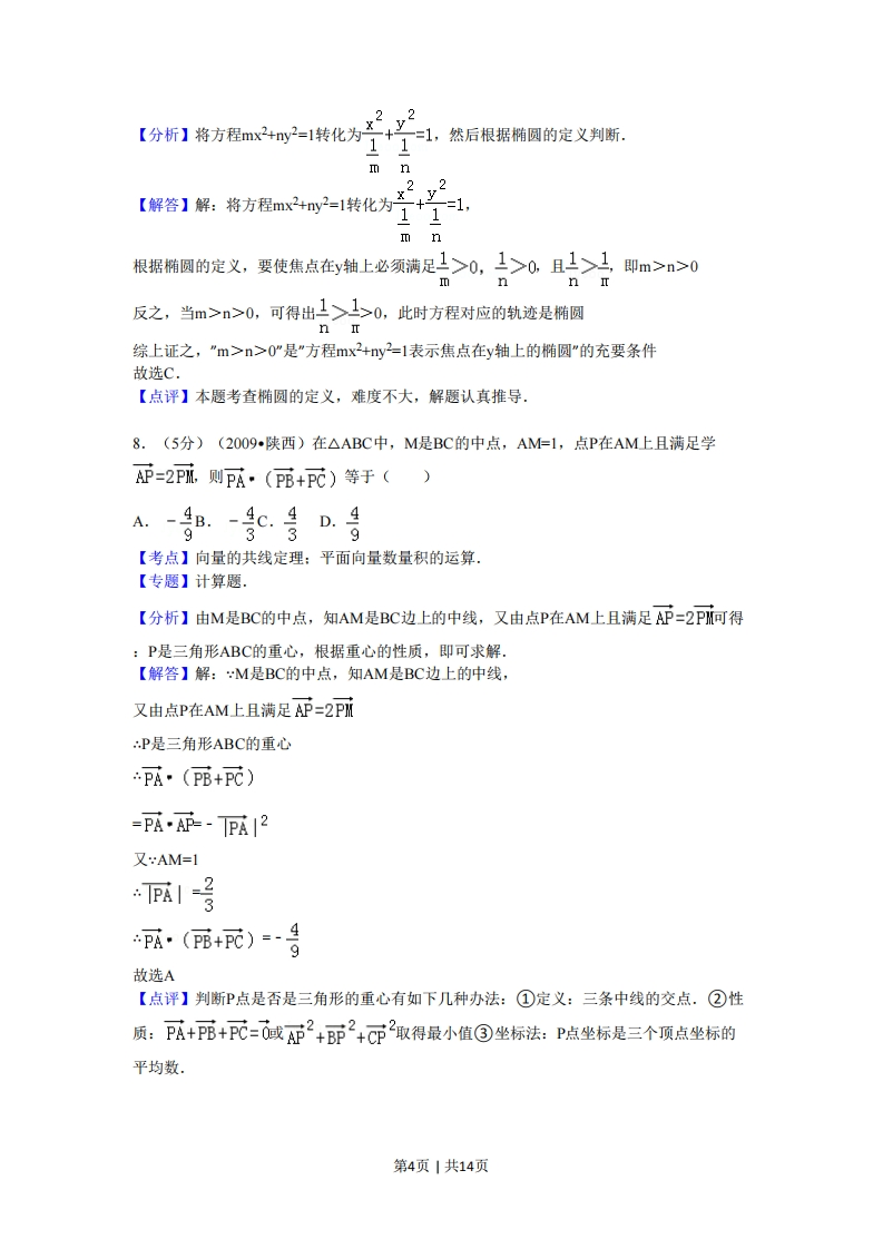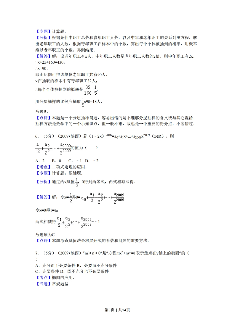2009年陕西省高考数学试卷(文科)童考答案与试惠佩析一、选择题(共12小题,每小题5分,满分60分)1.(5分)(2009陕西)设不等式x2-x≤0的解集为M,函数f(x)=n(1-x)的定义域为N,则MnN为()A.[0,1)B.(0,1)C.0,1]D.(-1,0]【考点】函数的定义域及其求法:元素与集合关系的判断。【专题】计算题.【分析】先求出不等式的解集和函数的定义域,然后再求两个集合的交集,【解答】解:不等式x2-x≤0转化为x(x-1)≤0解得其解集是{x0sX≤1},而函数f(x)=n(1-)有意义则需:1-风>0解得:-14)的反函数为()Af1(x)=x242(x>0)B.f1(x)=x242(x>2)C.f1(x)=x244(x>0)D.f1(x)=244(x>2)【考点】反函数.第1页1共14页【专题】应用题【分析】从条件中函数式数F(x)=√2x-4(x>4)反解出x,再将x,y互换即得对数函数的函数,再依据互为反函数间的定义域与值域的关系求得反函数的定义域即可.【解答】解:£(x)=2x-4(x>4)y>2,f1(x)=号x242,>2,逐一验证,知B正确。故选B.【点评】求反函数,一般应分以下步骤:(1)由己知解析式y=f(x)反求出x=中(y):(2)交换x=中(y)中x、y的位置:(3)求出反函数的定义域(一般可通过求原函数的值域的方法求反函数的定义域).4.(5分)(2009·陕西)过原点且倾斜角为60°的直线被圆x2+v2-4v=0所截得的弦长为(A.3 B.2 C.6 D.23【考点】直线的倾斜角:直线和圆的方程的应用.【专题】计算题.【分析】本题考查的知识点是直线与圆方程的应用,由己知圆x2+y2-4y0,我们可以将其转化为标准方程的形式,求出圆心坐标和半径,又直线由过原点且倾斜角为60°,得到直线的方程,再结合半径、半弦长、弦心距满足勾股定理,即可求解。【解答】解:将圆x2y2-4y=0的方程可以转化为:x2+(y-2)2=4,即圆的圆心为A(0,2),半径为R=2,∴A到直线ON的距离,即弦心距为1,0N=V3,弦长2W3故选D.【点评】要求圆到割线的距离,即弦心距,我们最常用的性质是:半径、半弦长(BE)、弦心距(OE)构成直角三角形,满足勾股定理,求出半径和半弦长,代入即可求解.5.(5分)(2009陕西)某单位共有老、中、青职工430人,其中青年职工160人,中年职工人数是老年职工人数的2倍.为了解职工身体状况,现采用分层抽样方法进行调查,在抽取的样本中有青年职工32人,则该样本中的老年职工人数为()A.9B.18C.27D.36【考点】分层抽样方法.第2页1共14页【专题】计算题.【分析】根据条件中职工总数和青年职工人数,以及中年和老年职工的关系列出方程,解出老年职工的人数,根据青年职工在样本中的个数,算出每个个体被抽到的概率,用概率乘以老年职工的个数,得到结果,【解答】解:设老年职工有x人,中年职工人数是老年职工人数的2倍,则中年职工有2x,x+2x+160=430,x=90,即由比例可得该单位老年职工共有90人,:在抽取的样本中有青年职工32人,每个个体被抽到的概率是32-11605用分层抽样的比例应抽取上x90=18人.故选B.【点评】本题是一个分层抽样问题,容易出错的是不理解分层抽样的含义或与其它混淆.抽样方法是数学中的一个小知识点,但一般不难,故也是一个重要的得分点,不容错过.6.(5分)(2009陕西)若(1-2x)2009=-a0+a1x++a2009x209(xER),则a1,a2a2009的值为()一2一二2马■A.2B.0C.-1D.-2【考点】二项式定理的应用。【专题】计算题:压轴题.【分析】通过给x赋值马0得到两等式,两式相减即得.a1 a2【解答】解:令x=1得0-a0+2a20092222200g令x=0得1=a0两式相减得1,a2222…a20092009-1故选项为C【点评】本题考查赋值法是求展开式的系数和问题的重要方法.7.(5分)(2009.陕西)”m>n>0”是"方程mx2+nw2=1表示焦点在y轴上的椭圆"的()A.充分而不必要条件B.必要而不充分条件C.充要条件D.既不充分也不必要条件【考点】椭圆的应用.【专题】常规题型第3页1共14页