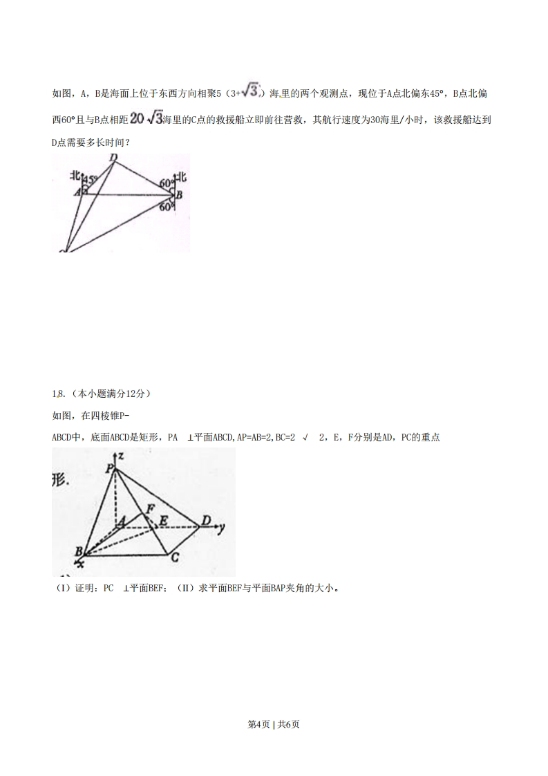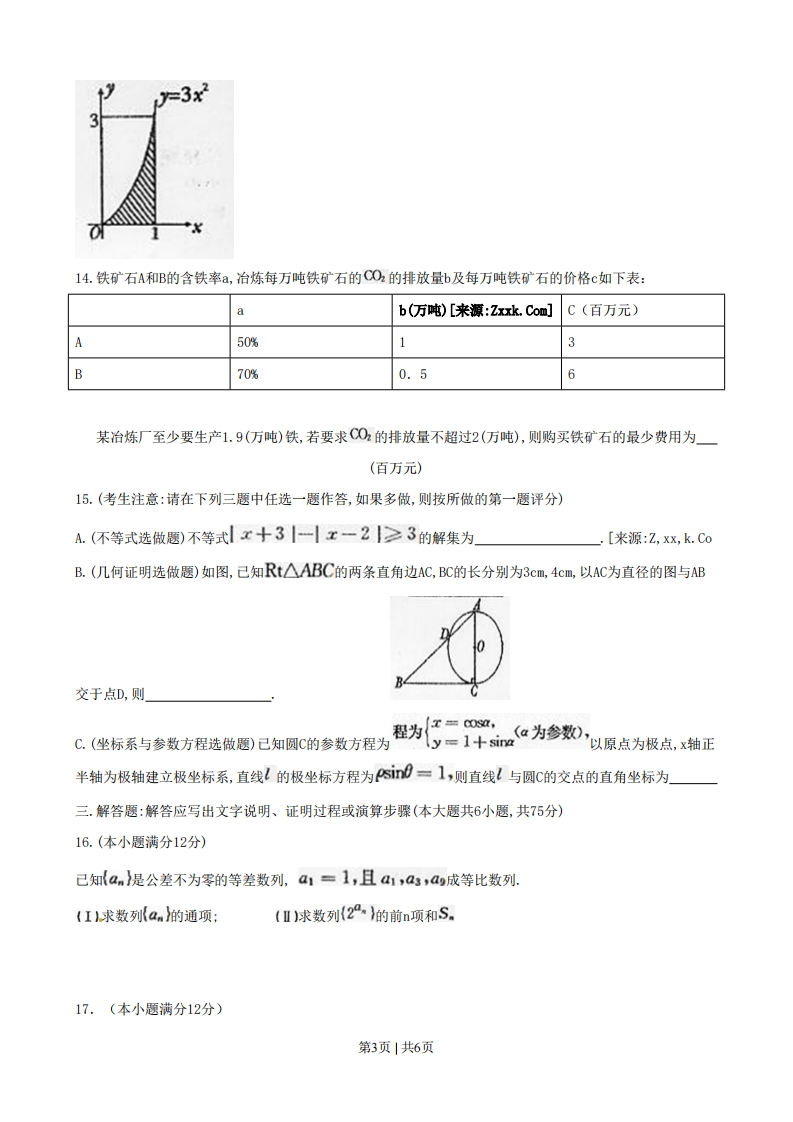 2010年陕西省高考理科数学试题一、选择题1.集合A={x-1≤x≤2},B={xx<1},则A∩(CB)=()(A){xx>1}(B){xx≥1}(C){x1输出X1,X2,X10主视图左视图2俯视图是结束否8.己知抛物线2=2px(p>0)的准线与圆x2+y2-6x一7=0相切,则p的值为【】ω(B)1(C)2(D)4229.对于数列{a.},“a。1>a(n,2.)”是“{a}为递增数列的【】(A)必要不充分条件(B)充分不必要条件[来源:学+科+网](C)必要条件(D)既不充分也不必要条件10.某学校要召开学生代表大会,规定各班每10人推选一名代表,当各班人数除以10的余数大于6时再增选一名代表。那么,各班可推选代表人数y与该班人数x之间的函数关系用取整函数y=[x)([x]表示不大于的最大整数)可以表示为【】w[]®[o@二、填空题:把答案填在答题卡相应题号后的横线上(本大题共5小题,年小题5分,共25分)。11.己知向量a=(2,-1),b=(-1,m),c=(-1,2),若(a+b)lc,则m=12.观察下列等式:13+232,1+22+3=62,12+22+32+43=102,.根据上述规律,第五个等式为_1+22_32+4+53=21213.从如图所示的长方形区域内任取一个点M(x,y),则点M取自阴影部分的概率为第2页|共6页3x214.铁矿石A和B的含铁率a,冶炼每万吨铁矿石的CO2的排放量b及每万吨铁矿石的价格c如下表:ab(万吨)[来源:Zxk.Co如]C(百万元)A50%B70%0.56某治炼厂至少要生产1.9(万吨)铁,若要求CO的排放量不超过2(万吨),则购买铁矿石的最少费用为(百万元)15.(考生注意:请在下列三题中任选一题作答,如果多做,则按所做的第一题评分)A.(不等式选做题)不等式lx十3一x一2|≥3的解集为.[来源:Z,xx,k.CoB.(几何证明选做题)如图,己知Rt△ABC的两条直角边AC,BC的长分别为3Cm,4cm,以AC为直径的图与AB交于点D,则C.(坐标系与参数方程选做题)已知圆C的参数方程程为仔二平a为参0,以原点为服点.抽正半轴为极轴建立极坐标系,直线l的极坐标方程为si0=1,则直线!与圆C的交点的直角坐标为三.解答题:解答应写出文字说明、证明过程或演算步骤(本大题共6小题,共75分)16.(本小题满分12分)己知lan}是公差不为零的等差数列,a1=1,且a1,ag,ag成等比数列.(I)求数列an的通项:(Ⅱ)求数列(2的前n项和S。17.(本小题满分12分)第3页|共6页