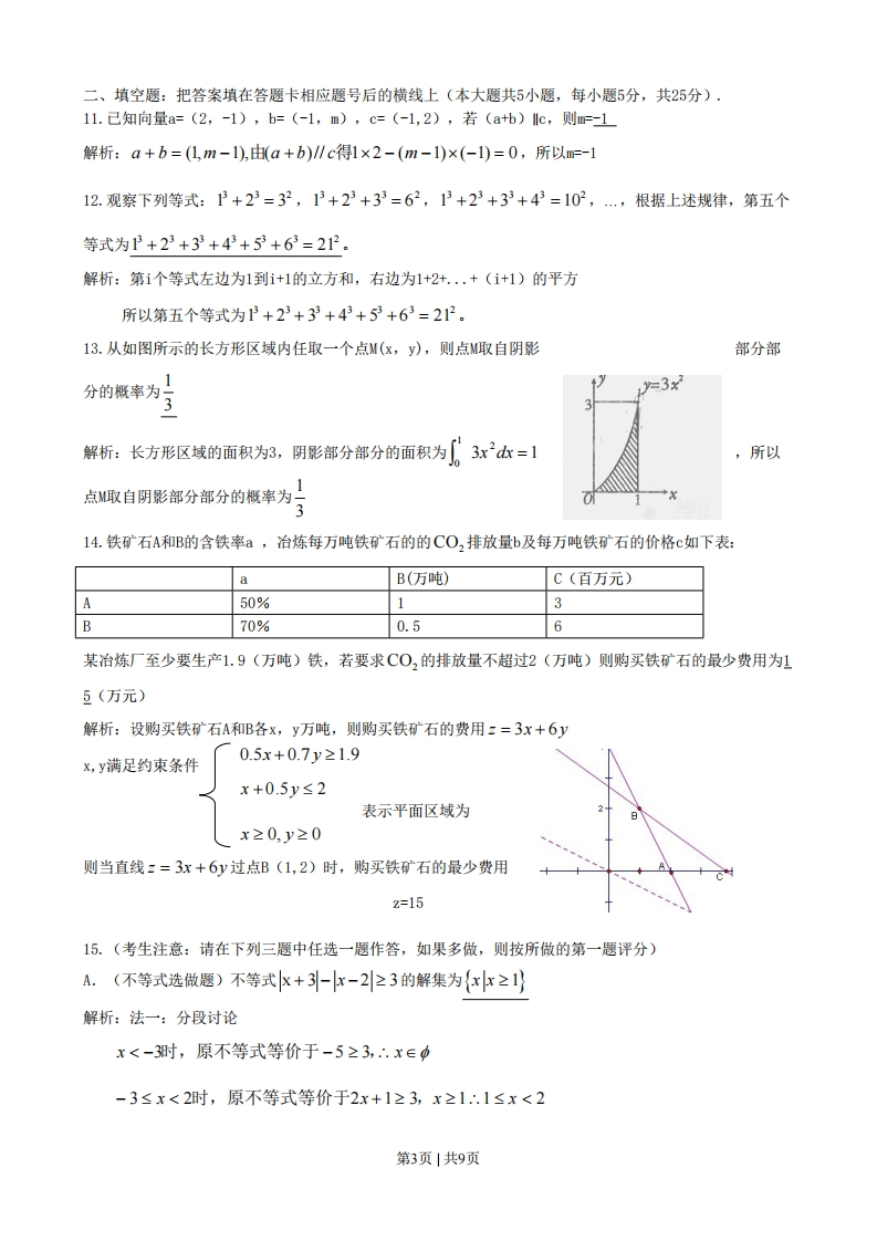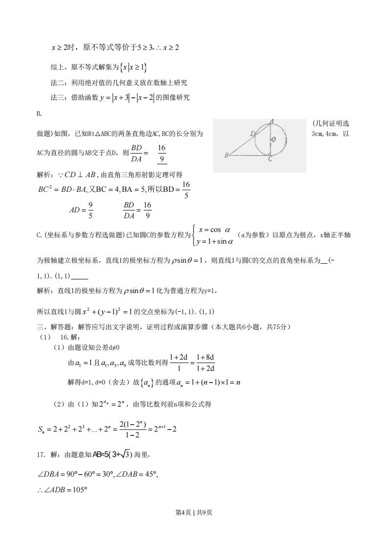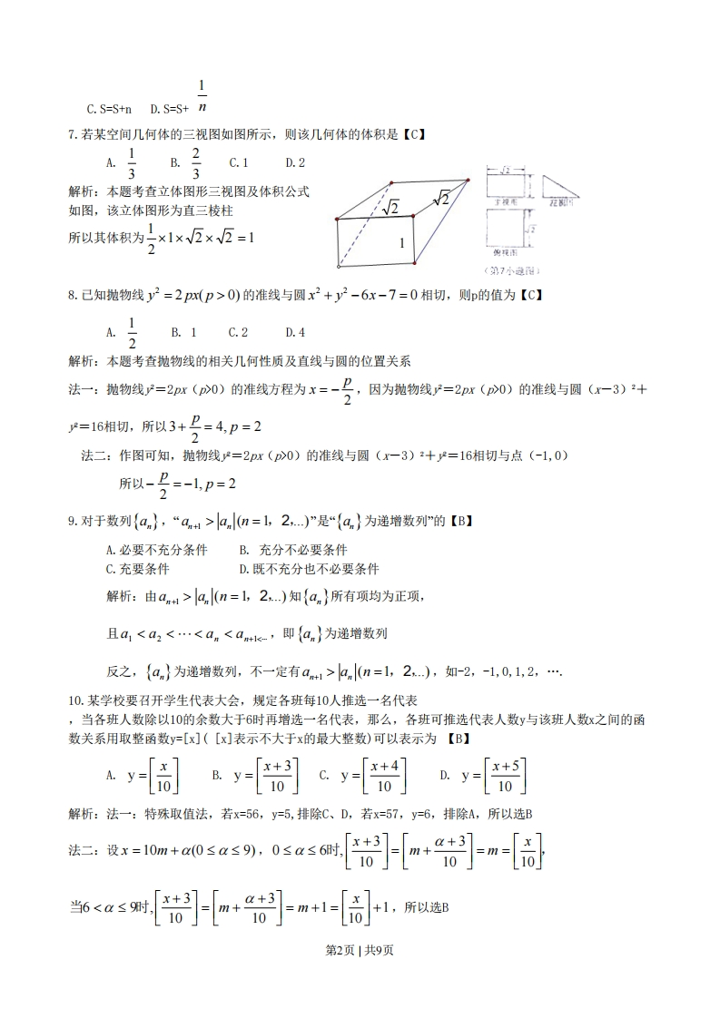 0)的准线与圆x2+y2-6x-7=0相切,则p的值为【C】月B.1C.2D.4解析:本题考查抛物线的相关几何性质及直线与圆的位置关系法一:抛物线y2=2pr(p>0)的准线方程为x=-巳,因为抛物线2=2pr(p>0)的准线与圆(r一3)+2=16相切,所以3+卫=4,p=2法二:作图可知,抛物线2=2x(p>0)的准线与圆(x一3)2+=16相切与点(-1,0)所以-号=-lp=29.对于数列{an},“an1>an(n=1,2)”是“{an}为递增数列”的【B】A.必要不充分条件B.充分不必要条件C.充要条件D.既不充分也不必要条件解析:由an1>an(n=1,2,.)知{an}所有项均为正项,且a1an(n=1,2.),如-2,-1,0,1,2,…10.某学校要召开学生代表大会,规定各班每10人推选一名代表,当各班人数除以10的余数大于6时再增选一名代表,那么,各班可推选代表人数y与该班人数x之间的函数关系用取整函数y=[x]([x]表示不大于x的最大整数)可以表示为【B】y-[周=[c[[解析:法一:特殊取值法,若x=56,y=5,排除C、D,若x=57,y=6,排除A,所以选B法:段x=10m+a0sas列,0sas6[][m+t]-m[
