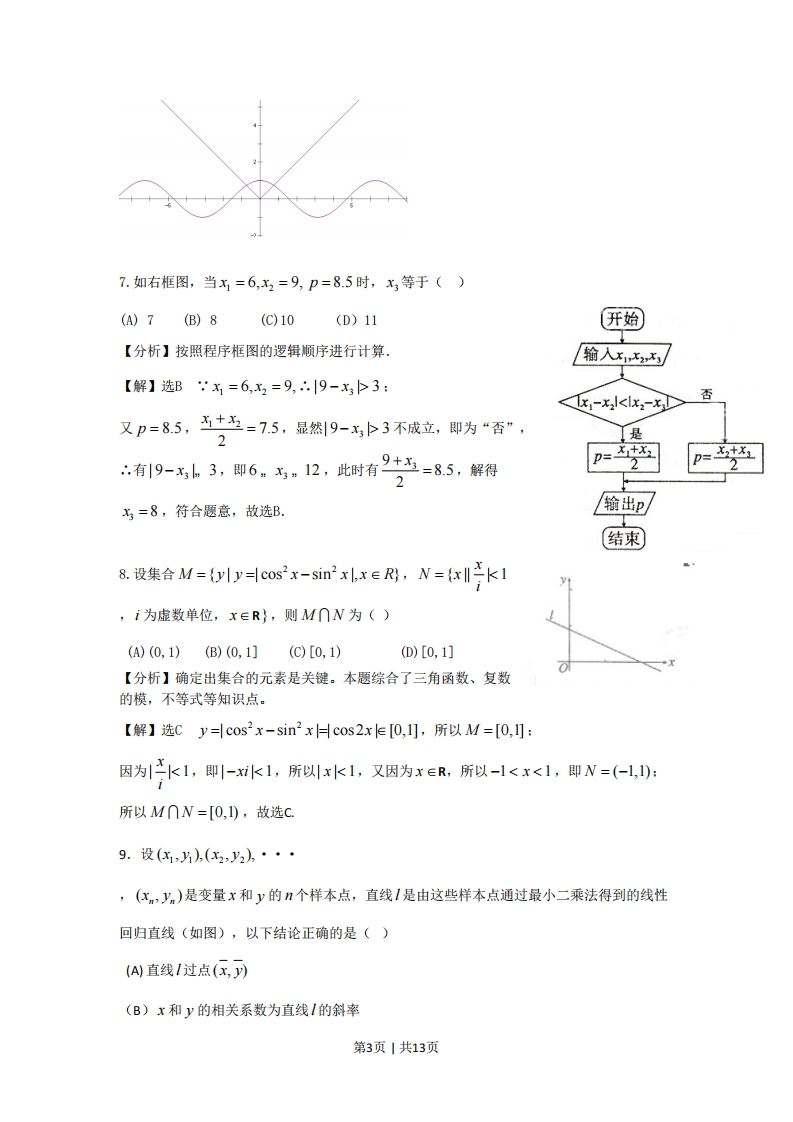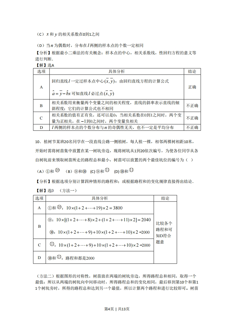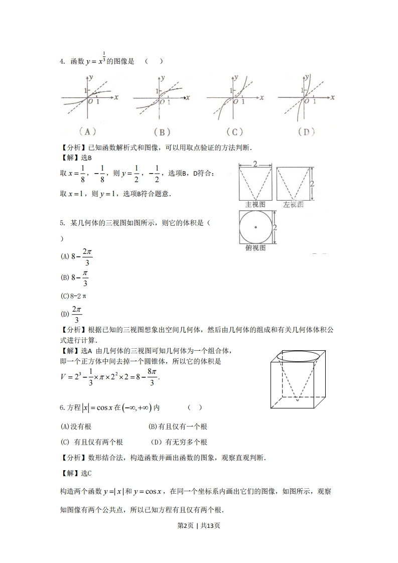 2011年普通高等学校招生全国统一考试·陕西卷(文科)全解全析一、选择题:在每小题给出的四个选项中,只有一项是符合题目要求的(本大题共10小题,每小题5分,共50分).1.设a,b是向量,命题“若a=-b,则|a曰b|”的逆命题是()(A)若a≠-b,则|aHb川(B)若a=-b,则|aHb|(c)若|abl,则a≠-b(D)若1a日bl,则a=-b【分析】首先确定原命题的条件和结论,然后交换条件和结论的位置即可得到逆命题。【解】选D原命题的条件是a=-b,作为逆命题的结论:原命题的结论是|a=Hb|,作为逆命题的条件,即得逆命题“若|a月b|,则a=-b”,故选D2.设抛物线的顶点在原点,准线方程为x=-2,则抛物线的方程是()(A)y2=-8x(B)y2=-4x(C)y2=8x(D)y2=4x【分析】由准线确定抛物线的位置和开口方向是判断的关键。【解】选C由准线方程x=-2得一二=-2,且抛物线的开口向右(或焦点在x轴的正半轴),所以y2=2pm=8x.3.设0