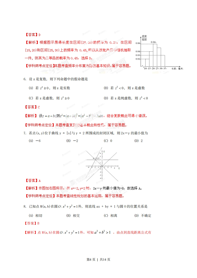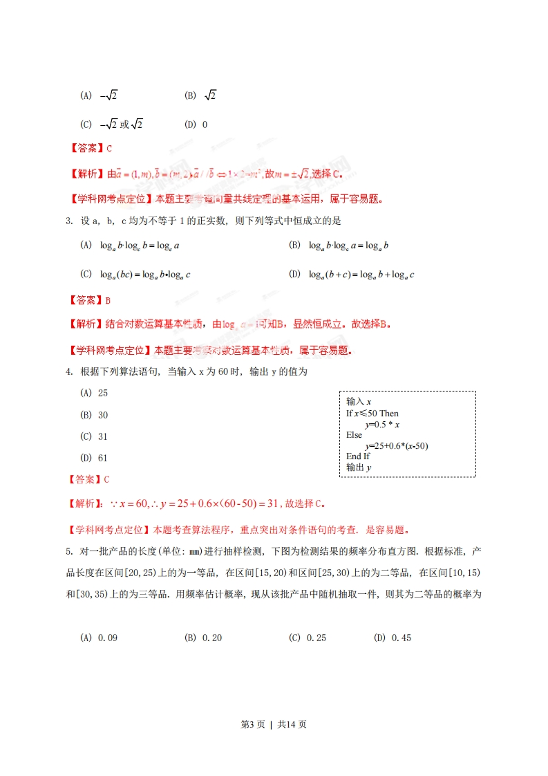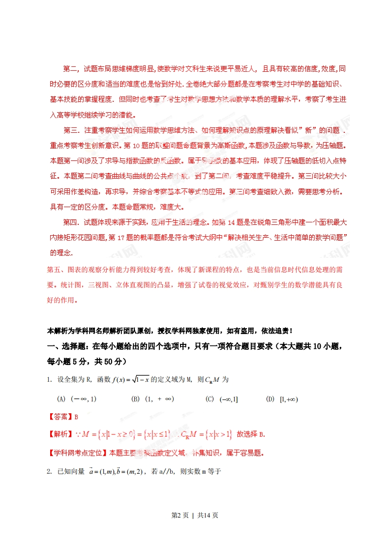 2013年高考陕西数学(文)卷解析(精编版)【学科网试卷点评】2013年高考文科数学陕西卷与往年试卷结构相同、题型题量分值都没发生变化,考查内容控制在新课程标准和考试大纲规定的范围内,试卷内容覆盖面广,涵盖了高中数学的主要内容,就考查知识而言,主干知识地位突出,重点内容仍重点考查.在命题形式上依日遵循以往框架,在命题内容上强调重点,兼顾全面,略有改换,而命序有所调整,试题难度整体稳定,命题风格体现了新课标“侧重能力考查,鼓励探索创等“的特点。能很好地检学生的基础知识、数学技能和综合运用能力。6个主观题类型稳定,题序依次回归为:三角函数、数列、立体几何、概率统计、解析几何、函数与导数。考点和知识点分值统计:知识点及分值涉及考题解析几何:33分8,11,15-B,15-C,20函数与导数:29分3,10,14,21概率与统计:17分5,19数列:12分17三角函数、解三角形与平面向2,9,16量:22分立体几何:17分7,12,15A,18不等式:10分7,15A集合与复数、推理、及简易逻辑:1,6,1315分程序框图:5分4试卷特点主要有以下几点:第一,体现高考命题来源于教材的主导思想,如第17题的第一问推导等差数列的前项和计算公式就是完全来自课本,体现基本思维过程的题目,注重知识过程的学生很容易上手。本题意在指引考生高考数学复习必须回归课本,回归基本知识的生成过程和基本思维活动经验,摒弃死抱住复习资料不放,盲目搞题海战术。第1页|共14页第二,试题布局思雄梯度明显,使数学对文科生来说更平易近人,且具有较高的信度,效度,同时必要的区分度和适当的难度也是恰到好处.全卷绝大部分题都是在考察考生对中学的基础知识、基本技能的掌握程度.但同时也考查了考生对数学思想方法和数学本质的理解水平,考察了考生进入高等学校继续学习的潜能。第三.注重考察学生如何运用数学思维方法、如何理解知识点的原理解决看似”新”的问题重点考察考生创新意识。第10题的取整问题命题背景为高斯数,本题涉及函数与导数,为压轴题。本题第一问涉及了求导与指数函数的反数。属于导爱的基本应用,体现了压轴题的低切入点特征。本题第二间考查曲线与曲线的公共点个家,到了第二问:考查难度平稳提升。第三问比较大小可采用作差构造,再求导,并综合考察基本不等式的应用。第三问考查细致入微,需要思考分析。具有一定的区分度。本题命题常规,难度大第四.试题体现来源于实践,应用于生活的理念.如第14题是在锐角三角形中建一个面积最大内接矩形花园问题,第17题的概率题都是符合考试大纲中“解决相关生产、生活中简单的数学问题”的理念,第五、图表的观察分析能力得到较好考查,体现了新课程的特点,也是当前信息时代信息处理的需要。统计图,三视图、立体直观图的凸显,增强了试卷的视觉效应,对甄别学生的数学潜能具有良好的作用。本解析为学科网名师解析团队原创,授权学科网独寡使用,如有盗用,依法追责1一、选择题:在每小题给出的四个选项中,只有一项符合题目要求(本大题共10小题,每小题5分,共50分)1.设全集为R,函数f(x)=V1-x的定义域为M,则CM为(A)(-∞,1)(B)(1,+o)(C)(-0,1](D)L,+o)【答案】B【解析】M={x-x20={x中≤1.CM={x水>1}故选择B.【学科网考点定位】本题主要考案数定义域,补集知识,属于容易题。2.己知向量a=(1,m,b=(m,2),若a/b,则实数m等于第2页|共14页(A)-E(B)V5(C)-√5或√2(D)0【答案】c【解析】由a=1,测),=m,2)a/万=1×2,故m=±√互选择C。【学科网考点定位】本题主要考自向量共线定的基本运用,属于容易题。3.设a,b,c均为不等于1的正实数,则下列等式中恒成立的是(A)log,blog,b=log a(B)log b-loge a=log b(C)log (bc)=log b-log.c(D)log(b+c)=loga b+loga c【答案】B【解析】结合对数运算基本性质,由1oga-可知B,显然恒成立。故选择B。【学科网考点定位】本题主要考察对故运算基本性质,属于容易题。4.根据下列算法语句,当输入x为60时,输出y的值为(A)25输入x(B)30Ifx≤50ThenJ=0.5*x(C)31Else1=25+0.6*(x-50)(D)61End If输出y【答案】C【解析】:x=60,y=25+0.6×(60-50)=31,故选择C.【学科网考点定位】本题考查算法程序,重点突出对条件语句的考查.是容易题。5.对一批产品的长度(单位:mm)进行抽样检测,下图为检测结果的频率分布直方图.根据标准,产品长度在区间[20,25)上的为一等品,在区间[15,20)和区间[25,30)上的为二等品,在区间[10,15)和[30,35)上的为三等品.用频率估计概率,现从该批产品中随机抽取一件,则其为二等品的概率为(A)0.09(B)0.20(C)0.25(D)0.45第3页|共14页
