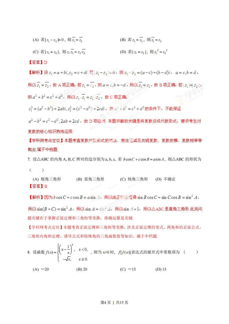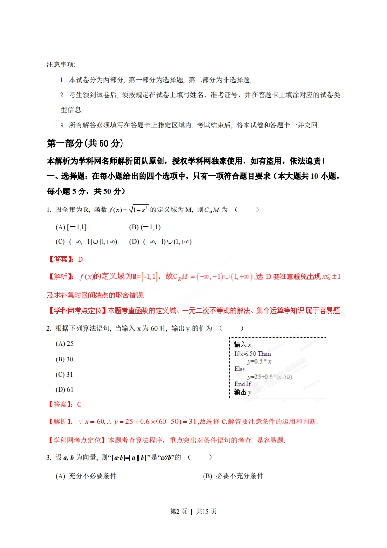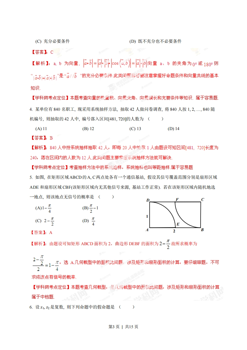 2013年普通高等学校招生全国统一考试(陕西卷)理科数学【试卷总评】2013年高考理科数学陕西卷整体遵循考纲,体现新课标改革精神.试卷内容覆盖面广,涵盖了高中数学的主要内容,就考查知识而言,主干知识地位突出,重点内容仍重点考查.6个主观题类型稳定,题序依次回归为:三角函数、数列、立体几何、概率统计、解析几何、函数与导数试题呈现出如下特点:1.比照2012年高考试卷,2013年的高考真题体现出来的特色是:试题情景设计生活味浓厚,诸如:问卷调查、信号覆盖、投票选举等社会热点话题:试题背景设计数学味深刻,如高斯函数、柯西不等式、对数平均值不等式、以及高等数学里的中值定理影子;试题选材设计紧扣高中数学教材核心内容,如等比、等差数列公式的推导,椭圆第二定义试题呈现设计简单、基础、基本,力求凸现核心内容如压卷题里的指数函数2.难度控制中等偏易,许多题目都是常见的、熟悉的.如理科第1、2、6、7、9、11、12、1314题等3.适度创新,增加亮点试题的灵活性有所增加,新题型、改编题增多,如理科第2小题在算法中首次出现了f-h的条件语句;第4、8、10题给人的感觉也很清新灵活;选修题的命题角度有所转变各个知识块所占的分数如下:函数不等式三角函数数列立体几何解析几何概率统计算法、平面向选修量、复数、推理与证明24分15分17分12分17分18分22分20分5分(8,10,21)(1,9,13)(7.16)(17)(12,18)(11,20)(4,5,19)(2,3,6,14)(15)16%10%11.3%8%11.3%12%8%10%3.3%整个试卷在明确考查“三基”(基础知识、基本技能、基本方法)、“五能力”(思维能力、运算能力、空间想象能力、实践能力、创新能力)的基础上,更加突出中学数学主要知识的考查,更加突出数学思想方法的考查,更加突出数学与现实生活的联系」第1页|共15页注意事项1.本试卷分为两部分,第一部分为选择题,第二部分为非选择题2.考生领到试卷后,须按规定在试卷上填写姓名、准考证号,并在答题卡上填涂对应的试卷类型信息3.所有解答必须填写在答题卡上指定区域内.考试结束后,将本试卷和答题卡一并交回,第一部分(共50分)本解析为学科网名师解析团队原创,授权学科网独家使用,如有盗用,依法追责!一、选择题:在每小题给出的四个选项中,只有一项符合题目要求(本大题共10小题,每小题5分,共50分)1.设全集为R,函数f(x)=V-x2的定义域为M,则CRM为()(A)[-1,1(B)(-1,1)(C)(-0,-1l,+o)(D)(-0,-1)U1,+o)【答案】D【解析1f(x的定义域为=[-11,故CM=(-,-1)(1,+x)选D.要注意避免出现≤±1及求补集时区间端点的取舍错误【学科网考点定位】本题考查函数的定义域、一元二次不等式的解法、集合运算等知识属于容易题2.根据下列算法语句,当输入x为60时,输出y的值为((A)25输人xIfx50 Then(B)303=0.5*xElse(C)31j=25+0.6x-50)EndIf(D)61输出y【答案】:C【解析】:x=60,∴.y=25+0.6×(60-50)=31,故选择C.解答要注意条件的运用和判断.【学科网考点定位】本题考查算法程序,重点突出对条件语句的考查.是容易题」3.设a,b为向量,则|b曰ab|”是“a仍的()(A)充分不必要条件(B)必要不充分条件第2页|共15页(C)充分必要条件(D)既不充分也不必要条件【答案】C【解析】:ab为向量,.-kos,6=向量a、b的夹角为o°或180则“a5一a1"是“à/石"的充分必要条件此类可听解答要注意掌握好命题条件和向量共线的基本知识【学科网考点定位】本题考查向量的里积、向三夹角、向留漠长和充要条件等知识.属于容易题4.某单位有840名职工,现采用系统抽样方法,抽取42人做问卷调查,将840人按1,2,,840随机编号,则抽取的42人中,编号落入区间[481,720]的人数为()(A)11(B)12(C)13(D)14【答案】B【解析】840人中按系统抽样抽取42人,即海20人中始取1人由题设可知区间[481,720]长度为240,落在区间内的人数为12人此对可题主要掌提系筑抽样方法就可解决【学科网考点定位】考查抽样方法中的系统油样,系统抽样也叫等距抽样属于容易题5.如图,在矩形区域ABCD的A,C两点处各有一个通信基站,假设其信号覆盖范围分别是扇形区域ADE和扇形区域CBF(该矩形区域内无其他信号来源,基站工作正常).若在该矩形区域内随机地选一地点,则该地点无信号的概率是(A1-号(B)交-12(C)2-z2(【答案】:A【解析】:由题设可知矩形ABCD面积为2,曲边形DEBF的面积为2-T故所求概率为22五1π,选A几何概型中的面积比间题,步及矩形和扇形面积的计算,要仔细审题,不可4求成该点有信号的概率【学科网考点定位】本题考查几何概型,是几何铁型中的面积此问题,涉及矩形和扇形面积的计算属于中档题6.设z1,2是复数,则下列命题中的假命题是()第3页|共15页