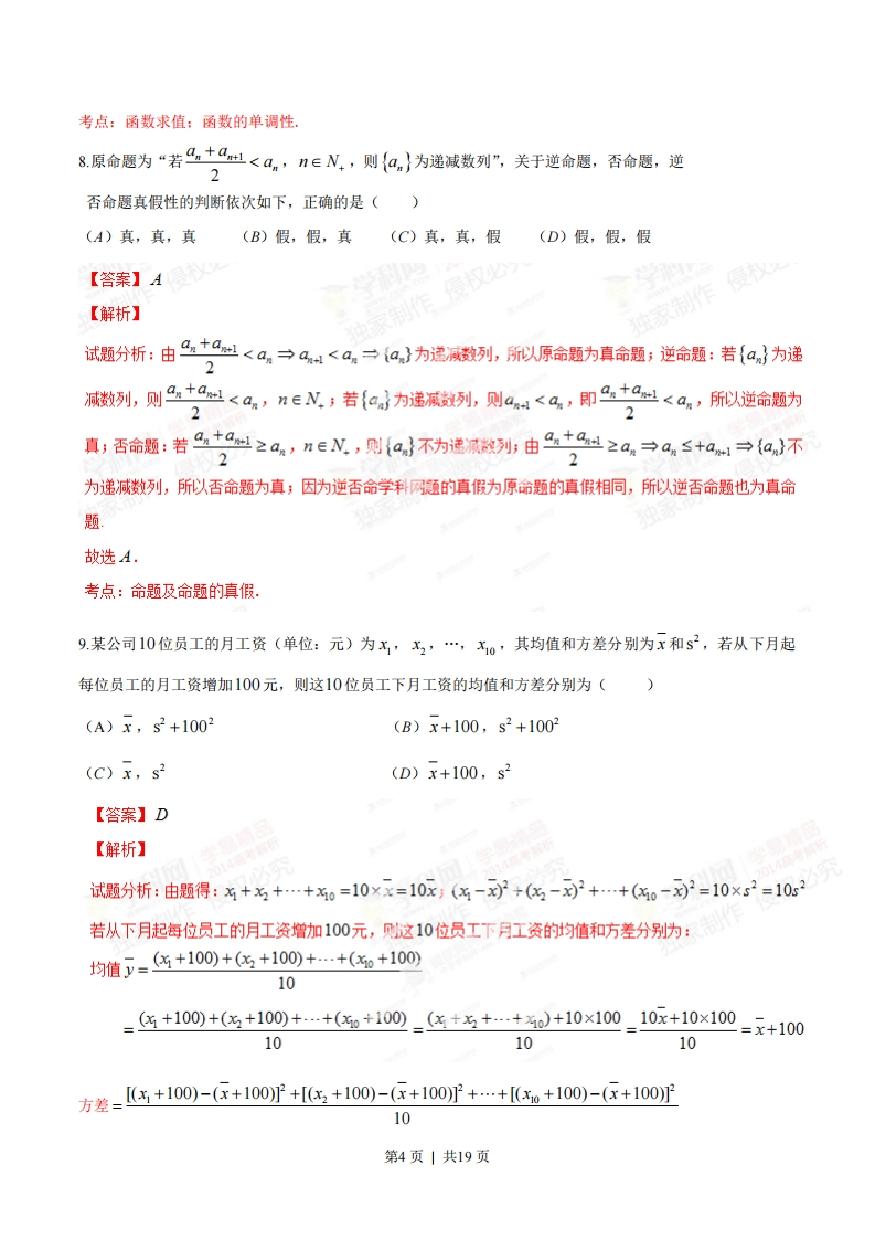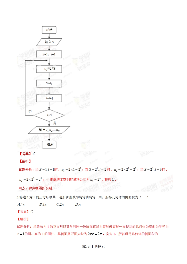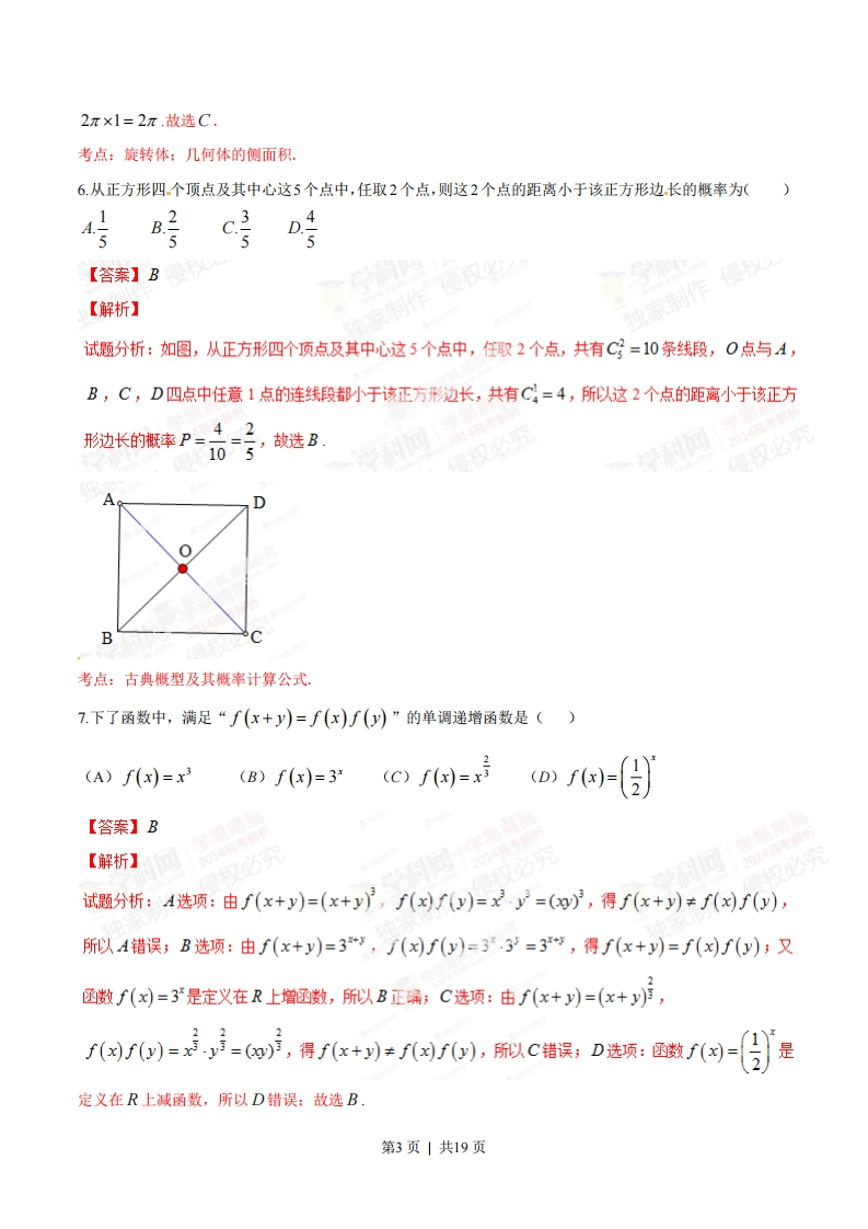 2014年陕西高考数学试题(文)一.选择题:本大题共10小题,每小题5分,共50分在每小题给出的四个选项中,只有一项是符合题目要求的1.己知集合M={x|x≥0,x∈R},N={x|x2<1,x∈R),则M∩N=()A.[0,1]B.(0,1)C.(0,1D.[0,1)【答案】D【解析】试题分析:由M={x|x≥0,x∈R}=[0,+∞),N={xx<1,x∈R}=(-1,1),所以M∩N=[0,1),故选D考点:集合间的运算.家制作2.函数f()=c0s(2x+乃)的最小正周期是()41BπC.2πD.4π【答案】B【解析】试题分析:由周期公式T=2江,又w=2,所以数/)=c0s(2x-马的周期T=2亚=π,故选B2考点:三角函数的最小正周期3.己知复数z=2-i,则z·z的值为()A.5B.5C.3D.A3【答案】A【解析】权必究权必究试题分析:由z=2-i得z=2+i,所以z~2=(2-)-(2+)=5,故选A考点:共轭复数;复数的运算4.根据右边框图,对大于2的整数N,得出数列的通项公式是()Ad 2nB.an=2(n-1)C.a=2"D.a =2"-第1页|共19页开始输入NS,i=1一学利a,2*S独家用S-a=+1学独家bN是输出a1a2-Ay结束【答案】C【解析】试题分析:当S=1i=1时,a=2×1=2,当S=2,i=2时,a=2×2=22,当S=22,i=3时,a=2×22=2,…由此得出数列的通项公式为a=2,故选C.2014考点:程序框图的识别但权5.将边长为1的正方形以其一边所在直线为旋转轴旋转一周,所得几何体的侧面积为()A.4πB.3πC.2πD.π【答案】C【解析】试题分析:将边长为1的正方形以其学科网一边所在直线为旋转轴旋转一周得到的几何体为底面为半径为r=1的圆、高为1的圆柱,其侧面展开图为长为2πr=2π,宽为1,所以所得几何体的侧面积为第2页|共19页2π×1=2π.故选C.考点:旋转体:几何体的侧面积6.从正方形四个顶点及其中心这5个点中,任取2个点,则这2个点的距离小于该正方形边长的概率为()c【答案】B【解析】制作侵权试题分析:如图,从正方形四个顶点及其中心这5个点中,任取2个点,共有C=10条线段,O点与A,B,C,D四点中任意1点的连线段都小于该正方形边长,共有C=4,所以这2个点的距离小于该正方形边长的概率P=权必一学利网得权必0B考点:古典概型及其概率计算公式。7.下了函数中,满足“f(x+y)=f(x)f(y)”的单调递增函数是()(A)f(x)=x3(B)f(x)=3x(C)f()=xD1)-【答案】B【解析】试题分析:A选项:由f(x+y)=(x+y,f(x)f(y)=xy=(),得f(x+y)≠f(x)f(y),所以A错误,B选项:由f(x+y)=3,f(x)f(y)=33=3w,得f(x+y)=f(x)(y):又函数f(x)=3是定义在R上增数,所以B正确;C选项:由f(x+y)=(x+y)月,f)=,=6o),得fk++f),所刷c错误,D速项:国数f()=日是定义在R上减函数,所以D错误:故选B第3页|共19页
