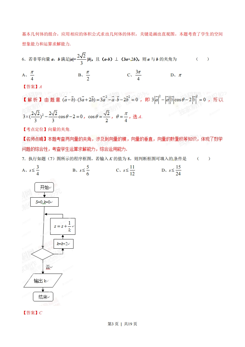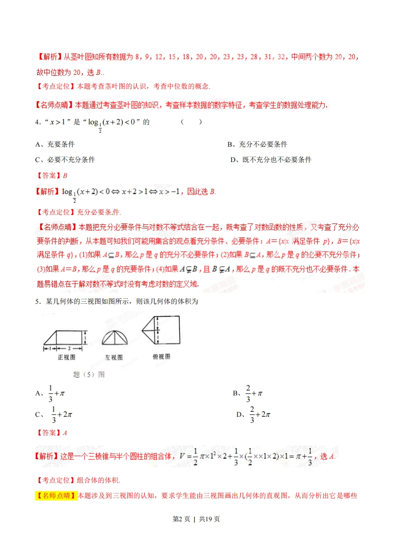 2015年普通高等学校招生全国统一考试(重庆卷)数学(理科)本试卷包括选择题、填空题和解答题三部分,共6页,时量120分钟,满分150分一、选择题:本大题共10小题,每小题5分,共50分.在每小题给出的四个选项中,只有一项是符合题目要求的,1.知集合4={1,2,3},B={2,3},则A、A=BB、AOB=OC、AOBD、BOA【答案】D【解析】由于2∈A2∈B,3∈A,3∈B,1∈A1EB,故A、B、C均错,D是正确的,选D.【考点定位】本题考查子集的概念,考查学生对基础知识的掌握程度【名师点晴】考查集合的关系,涉及集合的相等.集合的交集运算,子集等概念,是送分题。2.在等差数列{an}中,若a2=4,a-2,则a6=()A、-1B、0C、1D、6【答案】B【解析】由等差数列的性质得a5=2a4-a2=2×2-4=0,选B.【考点定位】本题属于数列的问题,考查等差数列的通项公式与等差数列的性质【名师点晴】本题可以直接利用等差数列的通项公式求解,也可应用等差数列的性质求解,主要考查学生灵活应用基础知识的能力,是基础题,3.重庆市2013年各月的平均气温(°C)数据的茎叶图如下:0l891258200338312则这组数据的中位数是()A、19B、20C、21.5D、23【答案】B.第1页|共19页【解析】从茎叶图知所有数据为8,9,12,15,18,20,20,23,23,28,31,32,中间两个数为20,20,故中位数为20,选B.【考点定位】本题考查茎叶图的认识,考查中位数的概念【名师,点晴】本题通过考查茎叶图的知识,考查样本数据的数字特征,考查学生的数据处理能力.4.“x>1”是“10g1(x+2)<0”的()2A、充要条件B、充分不必要条件C、必要不充分条件D、既不充分也不必要条件【答案】B【解析】1og1(x+2)<0台x+2>1台x>-1,因此选B【考点定位】充分必要条件【名师点晴】本题把充分必要条件与对数不等式结合在一起,既考查了对数函数的性质,又考查了充分必要条件的判断,从本题可我们可能用集合的观点看充分条件、必要条件:A={x满足条件p},B={x满足条件g},(1)如果A二B,那么p是q的充分不必要条件;(2)如果B二A,那么p是g的必要不充分条件;(3)如果A=B,那么p是g的充要条件:(4)如果A至B,且B至A,那么p是q的既不充分也不必要条件.本题易错点在于解对数不等式时没有考虑对数的定义域,5.某几何体的三视图如图所示,则该几何体的体积为正视图左视图俯视图题(5)图、3A、一十πB十π3+2C、D、3+2【答案】A【解折1这是一个三棱锥与半个圆鞋的阻合体,V-x1P×2+行×兮×1x2)×1=元+写选4123【考点定位】组合体的体积.【名师点晴】本题涉及到三视图的认知,要求学生能由三视图画出几何体的直观图,从而分析出它是哪些第2页|共19页基本几何体的组合,应用相应的体积公式求出几何体的体积,关键是画出直观图,本题考查了学生的空间想象能力和运算求解能力,6.若非零向量a,b满足引a22M,且(a-b)上(3a+2b),则a与b的夹角为()πA、B、c、3πD、π4【答案】A【解析】由题意(a--6a+2而=3a-ā.i-26=0,即3-cos日-2=0,所以329-22cos0-2=0,co0s0-54【考点定位】向量的夹角】【名师点晴】本题考查两向量的夹角,涉及到向量的模,向量的垂直,向量的数量积等知识,体现了数学问题的综合性,考查学生运算求解能力,综合运用能力.7.执行如题(7)图所示的程序框图,若输入K的值为8,则判断框图可填入的条件是()A、5s31115B、s≤6C、s≤D、S≤1224开始S=0.-0:S==k+2输出k结束【答案】C第3页|共19页