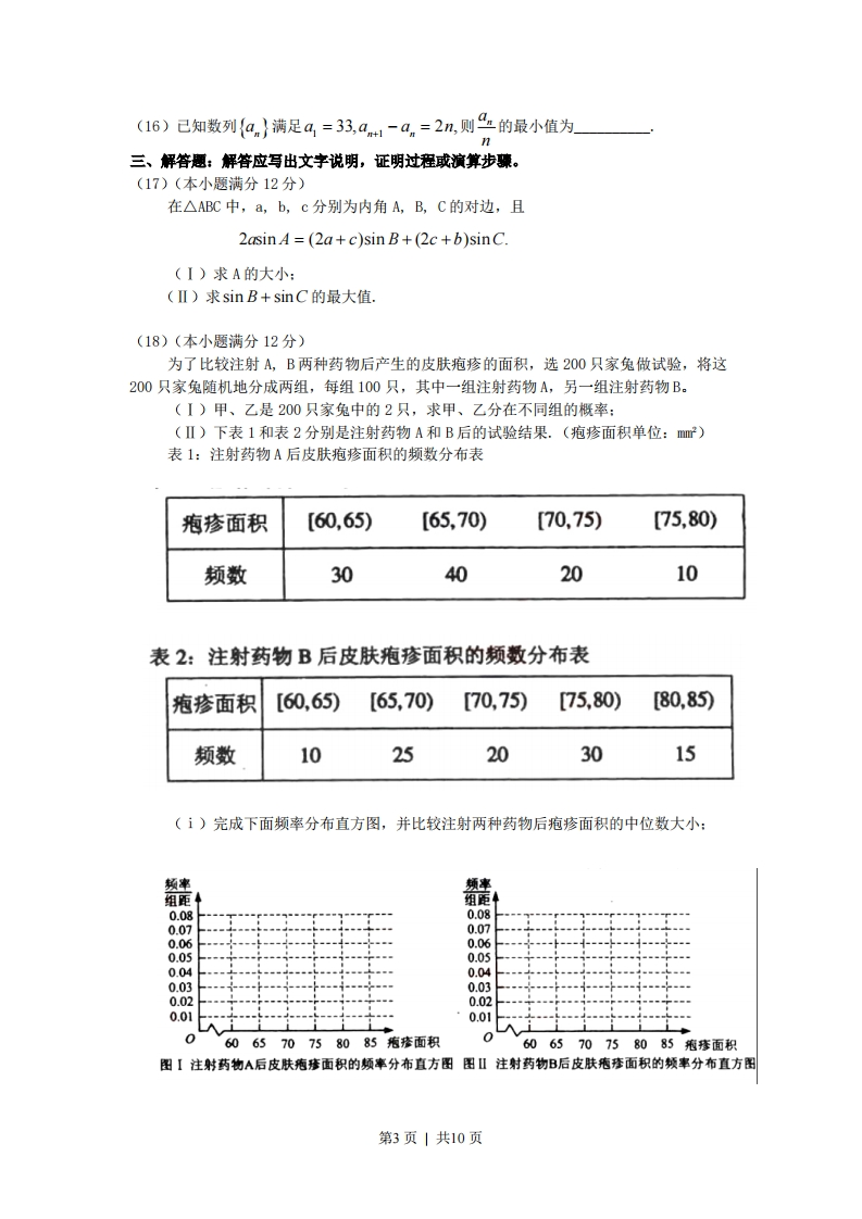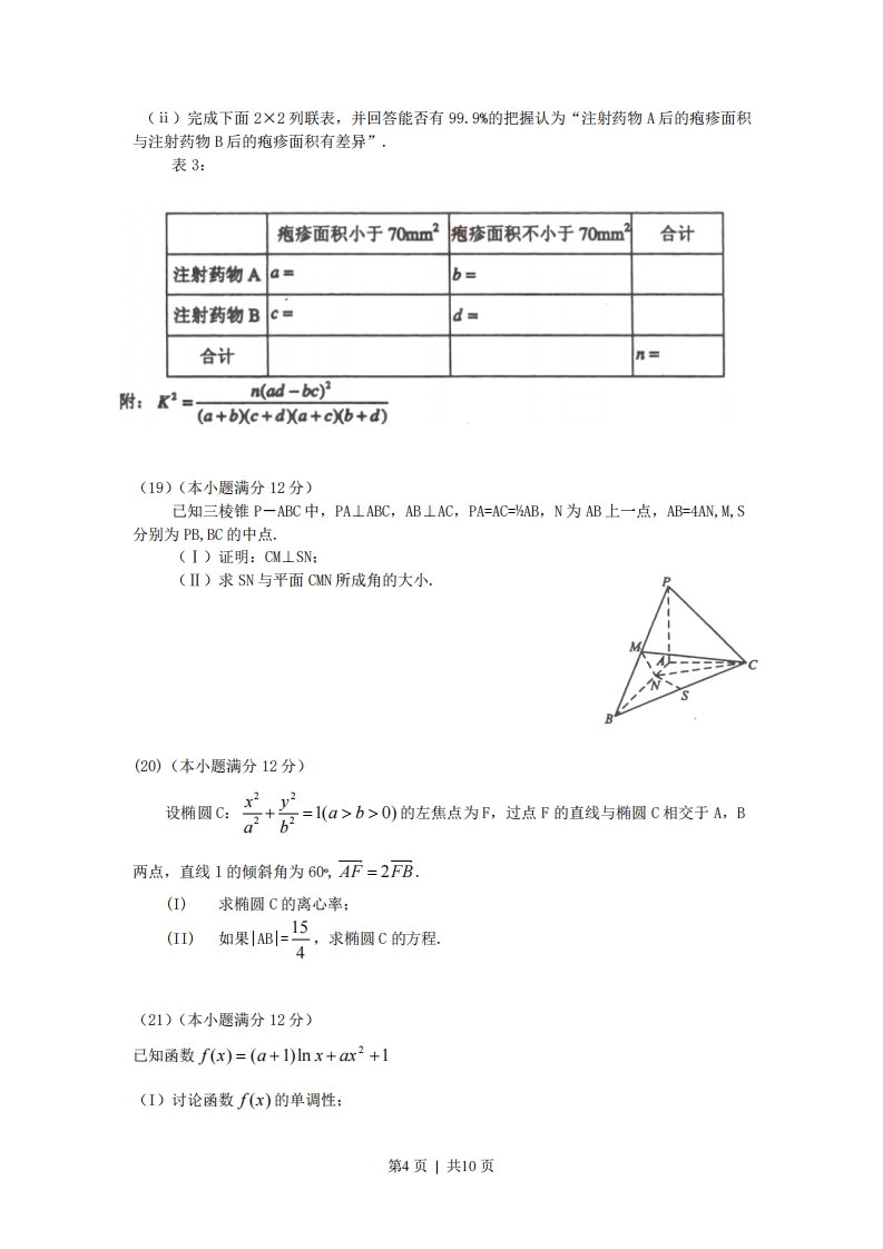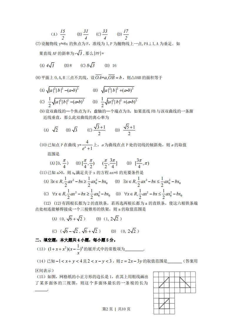 0,函数y=sin(ox+)+2的图像向右平移π个单位后与原图像重合,则o的3最小值是(A)2®)¥(D)332(6)设{a}是有正数组成的等比数列,Sn为其前n项和。已知aa,=l,S3=7,则S,=第1页|共10页(A)15、)4(C3317(D)(7)设抛物线y=8x的焦点为F,准线为1,P为抛物线上一点,PA⊥1,A为垂足.如果直线AF的斜率为-√5,那么PF=(A)45(B)8(C)83(D)16(8)平面上0,A,B三点不共线,设OA=a,OB=b,则△0AB的面积等于(A)MalbP-(a-b)2(B)Malb+(a-b)(C)FF-ab)(D)vaFIDF+(ab(⑨)设双曲线的一个焦点为F:虚轴的一个端点为B,如果直线B与该双曲线的一条渐近线垂直,那么此双曲线的离心率为(A)V(B)V5o5+105+1(10)己知点P在曲线y=上,a为曲线在点P处的切线的倾斜角,则a的取值e"+l范围是wo,子国居孕10语(11)己知a>0,则x满足关于x的方程ax=6的充要条件是W3reRm-m≥2-,1(B)3r∈R,5ar2-bx≤5ax6-bx0221⊙)x∈R2ar-r≥2-bx0)x∈R,2m-r≤2G-6(12)(12)有四根长都为2的直铁条,若再选两根长都为a的直铁条,使这六根铁条端点处相连能够焊接成一个三棱锥形的铁架,则的取值范围是(A)(0,6+√5)(B)(1,2√2)(C)(6-2,√6+2)(①)(0,25)二、填空题:本大思共4小题,每小题5分。(13)(1+x+x2)(x--)的展开式中的常数项为(14)己知-1