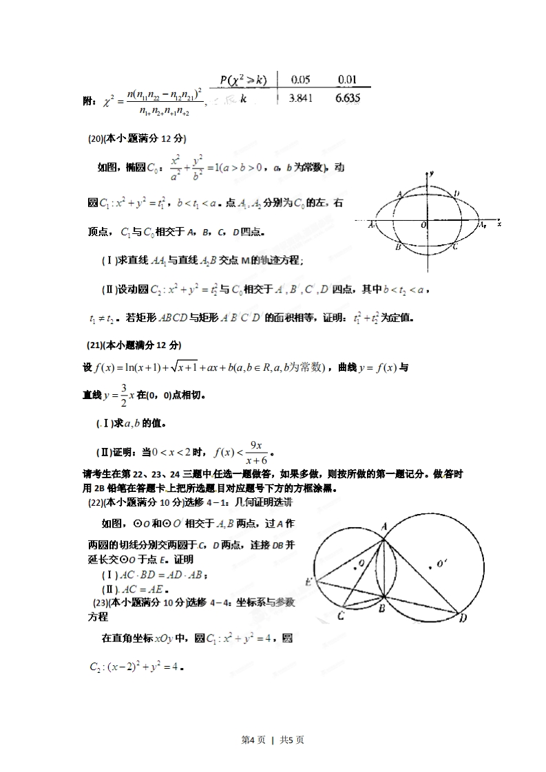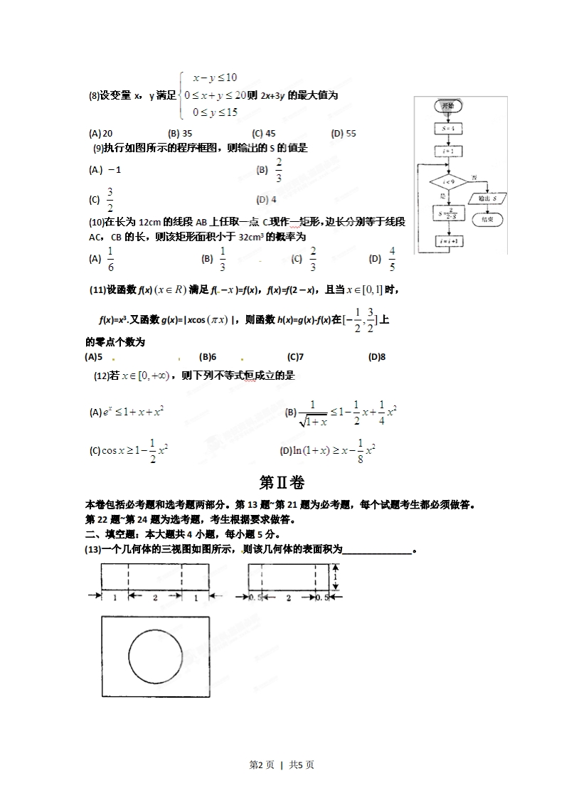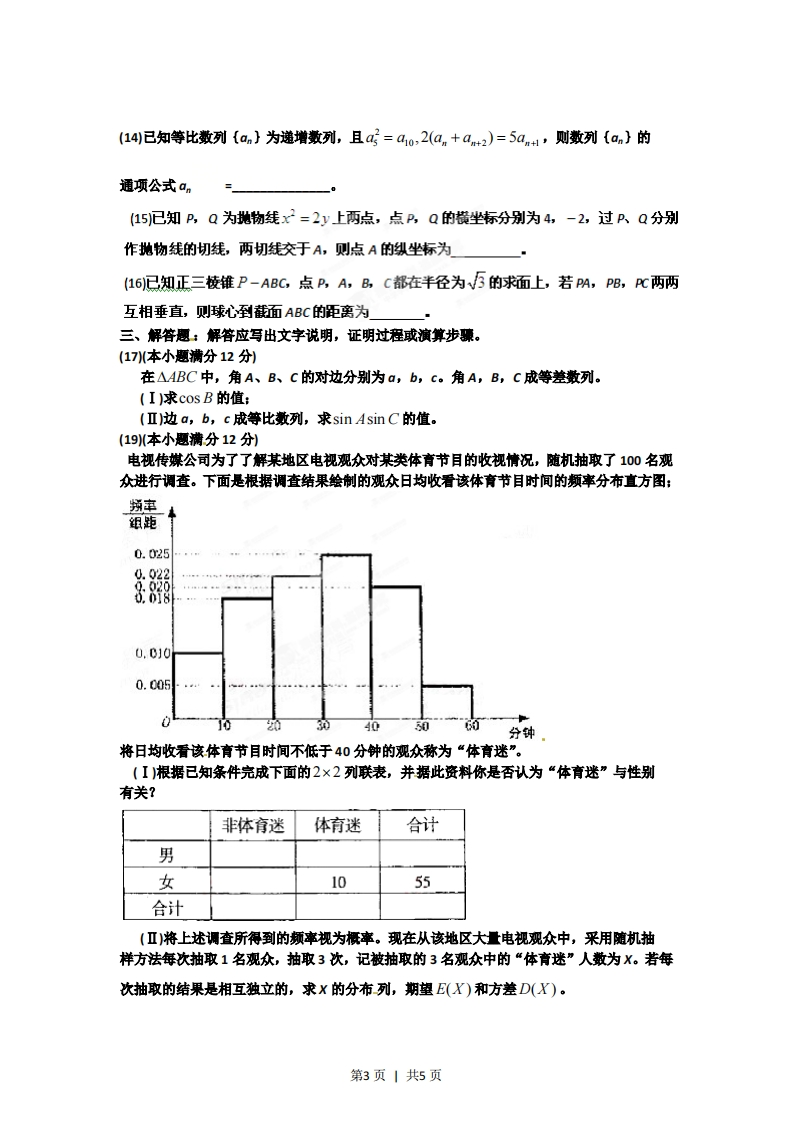 2012年普通高等学校招生全国统一考试(辽宁卷)数学(供理科考生使用)注意事项:1,本试卷分第I卷选择题和第Ⅱ卷(非选释题两部分。答卷前,考生务必将自已的姓名、准考证号填写在答题卡上。2,回答第I卷时,选出每小题答案后,用铅笔把答题卡上对应题目的答案标号涂黑。如需改动,用橡皮擦干净后,再选涂其它答案标号。写在本试卷上无效。3.回答第Ⅱ卷时,将答案写在答题卡上,写在本试卷上无效。4.考试结束后,将本试卷和答题卡一并交回。第I卷一、选择题:本大题共12小题,每小题5分,每小题给出的四个选项中,只有一项是符合题目要求的。(1已知全集U={0,1,2,3,4,5,6,7,8,9},集合A={0,1,3,5,8,集合B={2,4,5,6,8],则(CA)∩(CB)(AK5,8}(BK7,9}(C0,1,3引(DK2,4,62废数22+i341-1*(3)已知两个非零向量a,b满足引a+b=a-b1,则下面结论正确的是(Aa∥b(B)a⊥b(C0,1,3}(D)a+b=a-b(4已知命题p:廿,为∈R,x-fKk2-为≥0,则一p是(A)3,为2eR,x2-fx-小≤0(B)VM1,为eR,2)-fx&-x≤0(C)3X,为eR,K-fxK-X0(D)VK1,∈R,x-fx%-xK0(5)一排9个座位坐了3个三口之家,若每家人坐在一起,则不同的坐法种数为(A)3X3!(B)3X(3!P(C3!PD)9!(6)在等差数列{a中,已知a+0=16,则该数列前11项和511(a58(B)88(g143(D1176(7)已知sina-cosa=√反,a∈l0,,则tana=(A)-1(B)(C)(D)12第1页1共5页「x-y≤10(8)设变量,y满足0≤x+y≤20则2x+3y的最大值为0≤y≤15(A)20(B)35(g45(D155(9执行如图所示的程序框图,则给出的S的值是(A)-11(D)4翰出(10)在长为12cm的线段AB上任取一点c现作一矩形,边长分别等于线段AC,CB的长,则该矩形面积小于32cm3的率为4(11)设函数x)(x∈R)满足孔-x=f孔x,孔x=f2-x刘,且当x∈[0,]时,e又西数goas(红h则番数Mg在-子上的零点个数为(A)5.(B)6(c)7(D8(12若x∈[0.+0),则下列不等式柜成立的是(a)e≤1+x+x2(B)120cosx≥1-11(D)ln(1+x)≥x-第Ⅱ卷本卷包括必考思和选考题两部分。第13题第21愿为必考愿,每个试题考生都必须做答。第22题~第24题为选考题,考生根据要求做答。二、填空题:本大题共4小题,每小题5分。(13引一个几何体的三视图如图所示,则该几何体的表面积为州21第2页1共5页(14)已知等比数列{an】为递增数列,且a=a1o,2(an+an+2)=5an1,则数列(an}的通项公式an(15已知P,Q为抛物线x2=2y上两点,点P,Q的横坐标分别为4,-2,过P、Q分别作地物线的切线,两切线交于A,则点A的纵坐标为(16已知正三棱锥P-ABC,点P,A,B,C都在半径为√5的求面上,若A,PB,PC两两互相垂直,则球心到截面ABC的距离为三、解答题:解答应写出文字说明,证明过程或演算步骤。(17(本小题满分12分)在△ABC中,角A、B、C的对边分别为a,b,c。角A,B,C成等差数列。(I)求cosB的值:(Ⅱ)边a,b,c成等比数列,求sin Asin C的值。(19(本小题满分12分)电视传媒公司为了了解某地区电视观众对某类体育节目的收视情况,随机抽取了100名观众进行调查。下面是根据调查结果绘制的观众日均收看该体育节目时间的频率分布直方图:频宝组距0.0250.0220.020.门80.0100.005040分钟将日均收看该体育节目时间不低于40分钟的观众称为“体育迷”。(I)根据已知条件完成下面的2×2列联表,并据此资料你是否认为“体育迷”与性别有关?非体育迷体育迷合计男女1055合计(Ⅱ)将上述调查所得到的频率视为概率。现在从该地区大量电视观众中,采用随机抽样方法每次抽取1名观众,抽取3次,记被抽取的3名观众中的“体育迷”人数为X。若每次抽取的结果是相互独立的,求X的分布列,期望E(X)和方差D(X)。第3页1共5页