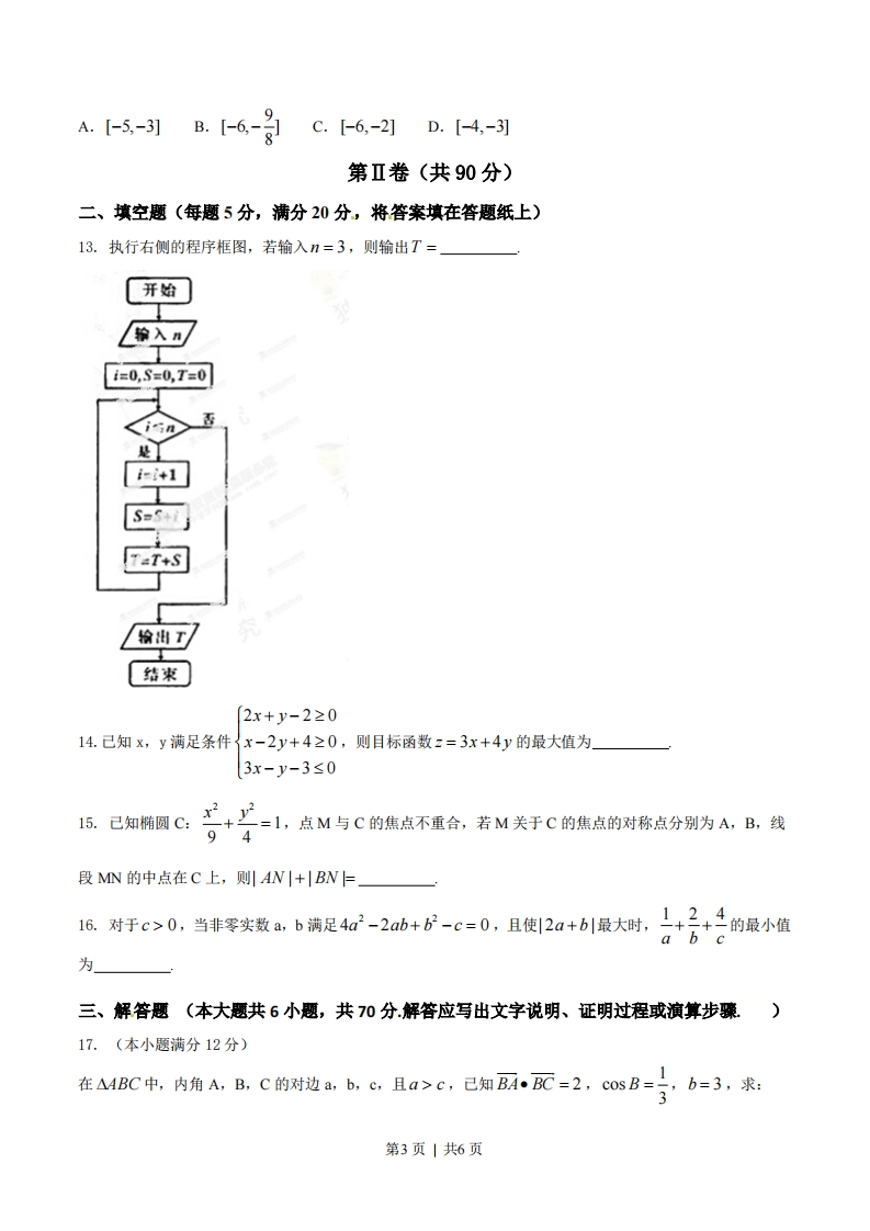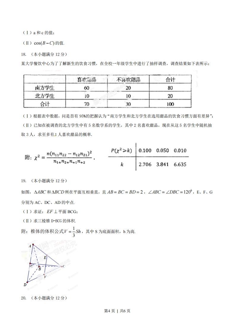 2014年普通高等学校招生全国统一考试(辽宁卷)文科数学第I卷(共60分)一、选择题:本大题共12个小题,每小题5分,共60分.在每小题给出的四个选项中,只有一项是符合题目要求的,1.己知全集U=R,A={x|x≤0},B={x|x21},则集合C(AUB)=(A.{x|x20}B.{x|x≤1}C.{x|0≤x≤1}D.{x|0b>c B.a>c>b C.c>a>b D.c>b>a4.己知m,n表示两条不同直线,“表示平面,下列说法正确的是()A.若m/1a,n/1a,则m/1nB.若m⊥a,nc,则m⊥nC.若m⊥,m⊥n,则n//aD.若m//,m⊥n,则n⊥5.设a,b,c是非零向量,已知命题P:若ab=0,b.c=0,则a-c=0:命题q:若a/i,b/1c,则a/lc,则下列命题中真命题是()A.pvq B.png C.(p)A(g)D.pv(-q)6.若将一个质点随机投入如图所示的长方形ABCD中,其中AB=2,BC=1,则质点落在以AB为直径的半圆内的概率是()AB.Cg.及第1页|共6页7.某几何体三视图如图所示,则该几何体的体积为()A.8-2mB.8-元C.8-TD.8-41网2014制作侵权必201423侵权必8.己知点A(-2,3)在抛物线C:y2=2px的准线上,记C的焦点为F,则直线AF的斜率为()4A.-B.-1c.-33D.-5429.设等差数列{a,}的公差为d,若数列{24}为递减数列,则()A.d<0 B.d>0 C.ad0c0sx,xe0,匀10.己知f(x)为偶函数,当x≥0时,f(x)=则不等式f(x-)≤的解集为()2x-lx∈(5,+0)哈u子B.子u片3c兮u子D.子u写11.将函数y=3sin(2x+乙)的图象向右平移交个单位长度,所得图象对应的函数()A.在区间[元]上单调递减12'12B.在区间工1上单调递增12'12C.在区若]上单调递减D、在区间[-后子上单调造带12.当x∈[-2,1]时,不等式ar3-x2+4x+3≥0恒成立,则实数a的取值范围是()第2页|共6页A.[-5,-3]B-6-C.[-6,-2]D.[-4,-3]第Ⅱ卷(共90分)二、填空题(每题5分,满分20分,将答案填在答题纸上)13.执行右侧的程序框图,若输入n=3,则输出T=」开始i0,S=0,T=0出T结束2x+y-2≥014.己知x,y满足条件x-2y+4≥0,则目标函数z=3x+4y的最大值为3x-y-3≤015.己知椭圆C:y29+4=1,点M与C的焦点不重合,若M关于C的焦点的对称点分别为A,B,线段MN的中点在C上,则|AN|+|BN=16.对于c>0,当非零实数a,b满足4d2-2ab+B-c=0,且使12a+b1最大时,上+2+4的最小值a b c为三、解答题(本大题共6小题,共70分解答应写出文字说明、证明过程或演算步骤)17.(本小题满分12分)在A1BC中内角AB,C的对边a,b,c,且a>c,已知B1,BC=2,cosB=写b=3,求:第3页|共6页