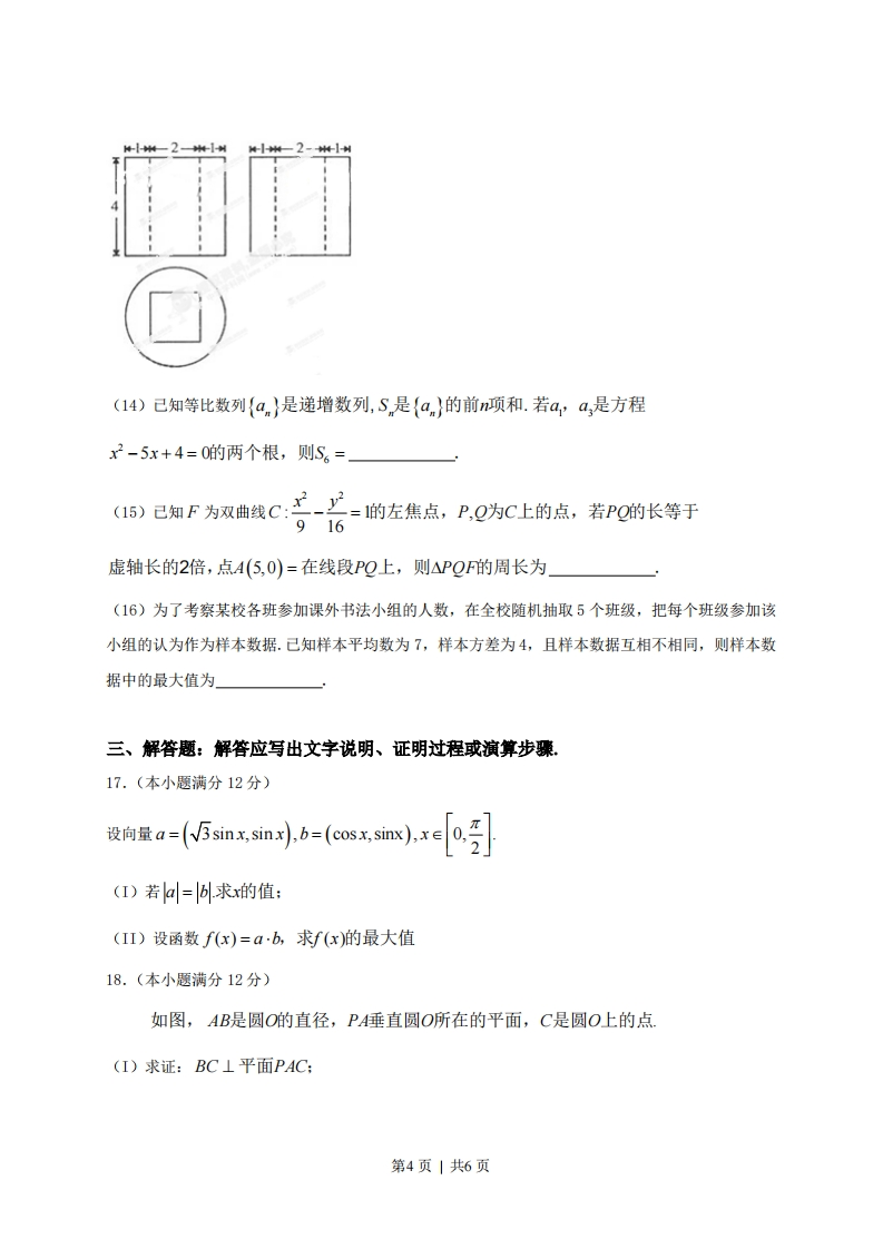 2013年高考辽宁效学(文)登原卷(精编版)一、选择题:本大题共12小题,每小题5分,共40分.在每小题给出的四个选项中,只有一项是符合题目要求的,(1)已知集合A={0,1,2,3,4},B={x<2,则4AnB=(A){O)(B){0,(c){0,2}(D){0,1,2}(2)复数的Z=1模为-1w月(B)(c)√5(D)22(3)己知点A(1,3),B(4,-1),则与向量AE同方向的单位向量为w得®怎·引o(o(引(4)下面是关于公差d>0的等差数列(an)的四个命题:P,:数列{an}是递增数列:乃:数列{nan}是递增数列:乃:数列是递增数列:p4:数列{an+3nd}是递增数列:n其中的真命题为(A)P1,P2(B)P3,P4(C)P2,P3(D)乃,P4(5)某学校组织学生参加英语测试,成绩的频率分布直方图如图,第1页|共6页数据的分组一次为颗军组雨[20,40),[40,60),[60,80),8[20,100)0.02若低于60分的人数是15人,则该班的学生人数是0.010.0(A)45(B)500.00(c)5520406080100(D)60(6)在△ABC,内角A,B,C所对的边长分别为a,b,c.asin BcosC+csin Bcos A=且a>b,则∠B=A.6BcD.5π6()已知函数f-h(+9F-3刘+1则/(e2到+/eA.-1B.0C.1D.2(8)执行如图所示的程序框图,若输入=8,则输出的S=AB.9C.gD.0输山S结i=i+2(9)已知点O(0,0),A(0,b),B(a,a)若△ABC为直角三角形,则必有第2页|共6页A.b=aB.b=d+ac.-a6-d-)-0D.(10)已知三棱柱ABC-A,B,C的6个顶点都在球O的球面上若AB=3,AC=4,AB⊥AC,A4,=12,则球O的半径为A.3w7B.210C.13D.3v102)已知烤圆C器+茶=a>b>0的左我点为FRC与过原点的直线相交于2A丽点,连接4F,BF若4=10BF-8cos∠ABF=号则C的离心率为wo(12)已知函数f(x)=x2-2(a+2)x+a2,g(x)=-x2+2(a-2)x-a2+8.设H,(x)=max{f(x),g(x)},H2(x)=min{f(x),g(x)},(max{p,g)表示p,g中的较大值,min{P,q}表示P,q中的较小值,记H1(x)得最小值为A,H2(x)得最小值为B,则A-B=(A)a2-2a-16(B)a+2a-16(c)-16(D)16二、填空题:本大题共4小题,每小题5分(13)某几何体的三视图如图所示,则该几何体的体积是第3页|共6页