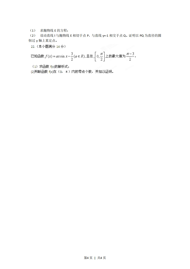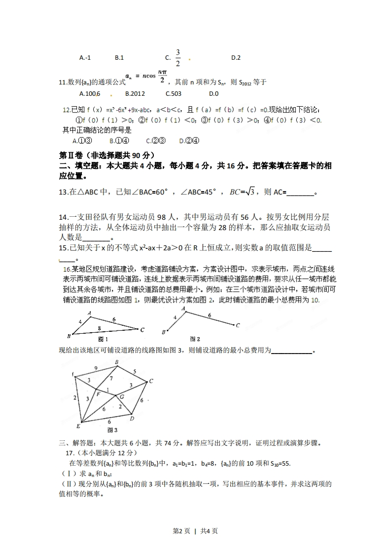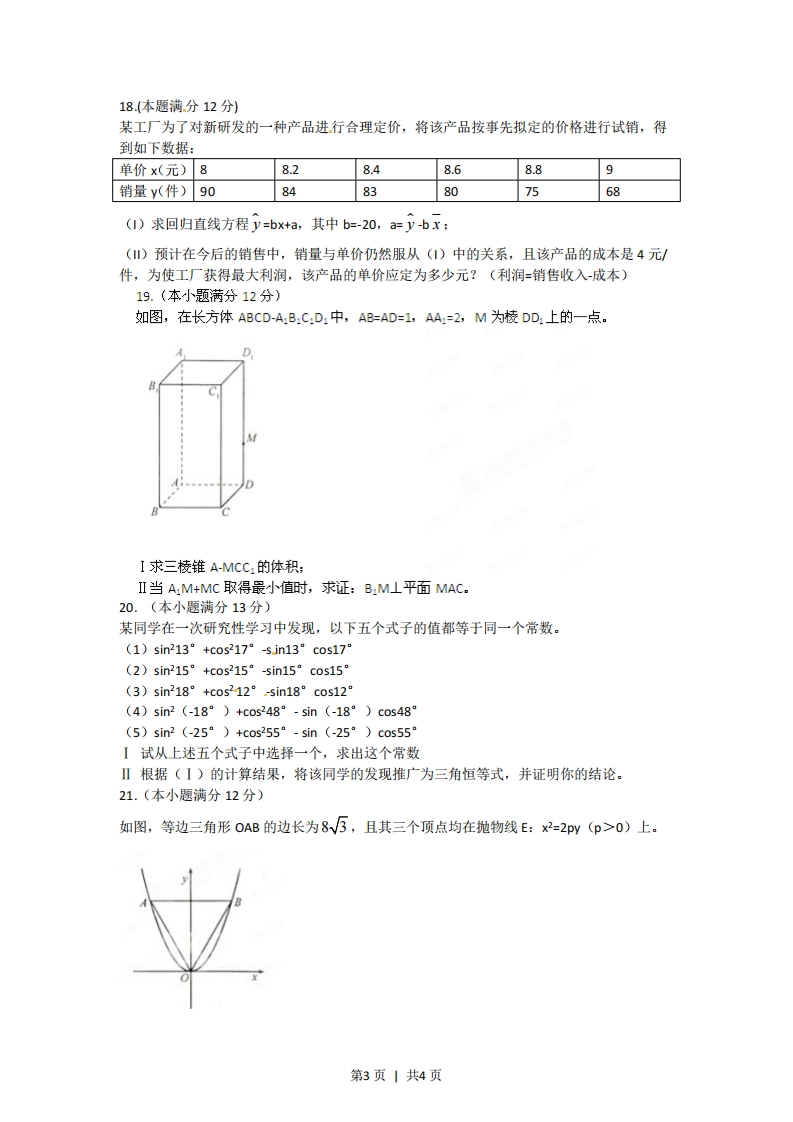 2012福建数学试题(文史类)第1卷(选择题共60分)一、选择题:本大题共12小题,每小题5分,共60分。在每小题给出的四个选项中,只有一项是符合题目要求的。1.复数(2+i)2等于A.3+4iB.5+4iC.3+2iD.5+212.已知集合M={1,2,3,4,N={2,2,下列结论成立的是A.NCM B.MUN=M C.MON=N D.MON=(2)3.已知向量a=(x-1,2),b=(2,1),则a⊥b的充要条件是B.x-1 C.x=5 D.x-04.一个几何体的三视图形状都相同,大小均等,那么这个几何体不可以是A球B三棱锥C正方体D圆柱5已知双曲线.y=1的右焦点为(3,0),则该双曲线的离心率等于53W14B3W2A14D3开始6阅读右图所示的程序框图,运行相应的程序,输出5值等于k=1,=A-3.B-10D-27.直线x+√3y-2=0与圆x2+y2=4相交于A,B两点,则弦AB的长k+l度等于A.25B2√5c.5D.1k<498,函数fK=sinx.严)的图像的一条对称轴是4,否ππππ输出sA.X=-C.X=-9D.x=-4Bx-241,x>0结束[1x为有理数9.设f(x)=0x=0,g(x)=-1,x<00x为为无理数'则@(》的值为A1B 0C-1D Ix+y-3≤010.若直线y=2x上存在点(x,y)满足约束条件{x-2y-3≤0,则实数m的最大值为x≥m第1页|共4页3A.-1B.1C.D.21.数列a的通项公式”。=nco2,其前n项和为Sn则Szn等于A.100.6。B.2012C.503D.012.已知f(x)=x2-6x2+9x-abc,a0;②f(o)f(1)<0:③f(o)f(3)>0:④f(o)f(3)<0.其中正确结论的序号是A.①③B.①④c.②③D.②④第Ⅱ卷(非选择题共90分)二、填空题:本大题共4小题,每小题4分,共16分。把答案填在答题卡的相应位置。13.在△ABC中,已知∠BAC=60°,∠ABC=45°,BC=√3,则AC=14.一支田径队有男女运动员98人,其中男运动员有56人。按男女比例用分层抽样的方法,从全体运动员中抽出一个容量为28的样本,那么应抽取女运动员人数是15.已知关于x的不等式x2ax+2a>0在R上恒成立,则实数a的取值范围是16某地区规划道路建设,考虑道路铺设方案,方案设计图中,求表示城市,两点之间连线表示两城市间可铺设道路,连线上数据表示两城市间铺设道路的费用,要求从任一城市都能到达其余各城市,并且铺设道路的总费用最小。例如:在三个城市道路设计中,若城市间可铺设道路的线路图如图1,则最优设计方案如图2,此时铺设道路的最小总费用为10.图1图2现给出该地区可铺设道路的线路图如图3,则铺设道路的最小总费用为】6图3三、解答题:本大题共6小题,共74分。解答应写出文字说明,证明过程或演算步骤。17.(本小题满分12分)在等差数列{an}和等比数列{bn}中,a1=b1=1,b4=8,{an}的前10项和S1o=55.(I)求an和bn(Ⅱ)现分别从{a}和{b}的前3项中各随机抽取一项,写出相应的基本事件,并求这两项的值相等的概率。第2页1共4页18.(本题满分12分)某工厂为了对新研发的一种产品进行合理定价,将该产品按事先拟定的价格进行试销,得到如下数据:单价x(元)88.28.48.68.89销量y(件)908483807568(1)求回归直线方程y=bx+a,其中b=-20,a=y-bx:()预计在今后的销售中,销量与单价仍然服从(1)中的关系,且该产品的成本是4元/件,为使工厂获得最大利润,该产品的单价应定为多少元?(利润=销售收入-成本)19.(本小题满分12分)如图,在长方体ABCD-AB:C:D:中,AB=AD=1,AA=2,M为棱DD1上的一点。I求三棱锥A-MCC:的体积,II当AM+MC取得最小值时,求证:B:ML平面MAC.20.(本小题满分13分)某同学在一次研究性学习中发现,以下五个式子的值都等于同一个常数。(1)sin213°+cos217°-sjn13°cos17(2)sin215°+cos215°-sin15°cos15(3)sin218°+cos212°-sin18°cos12°(4)sin2(-18°)+cos248°-sin(-18°)cos48°(5)sin2(-25°)+cos255°-sin(-25°)cos55I试从上述五个式子中选择一个,求出这个常数Ⅱ根据(I)的计算结果,将该同学的发现推广为三角恒等式,并证明你的结论。21.(本小题满分12分)如图,等边三角形OAB的边长为8√5,且其三个顶点均在抛物线E:x2=2py(p>0)上。第3页1共4页
