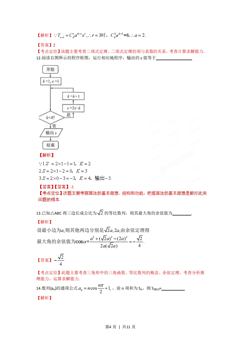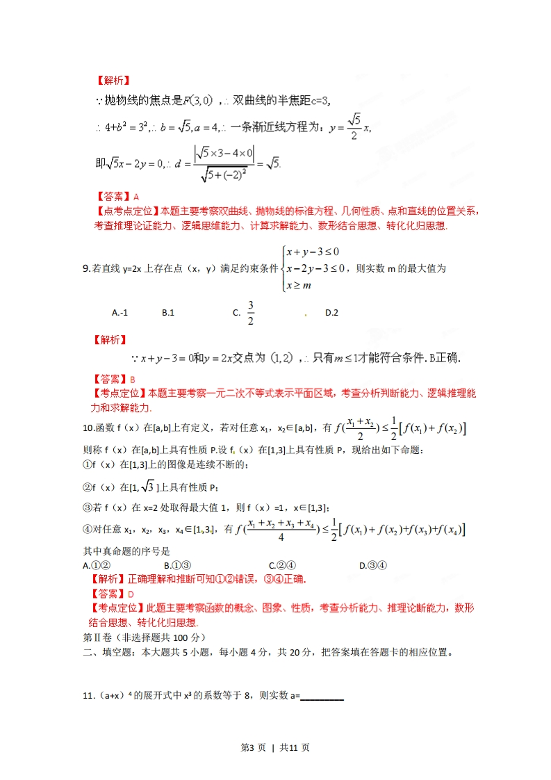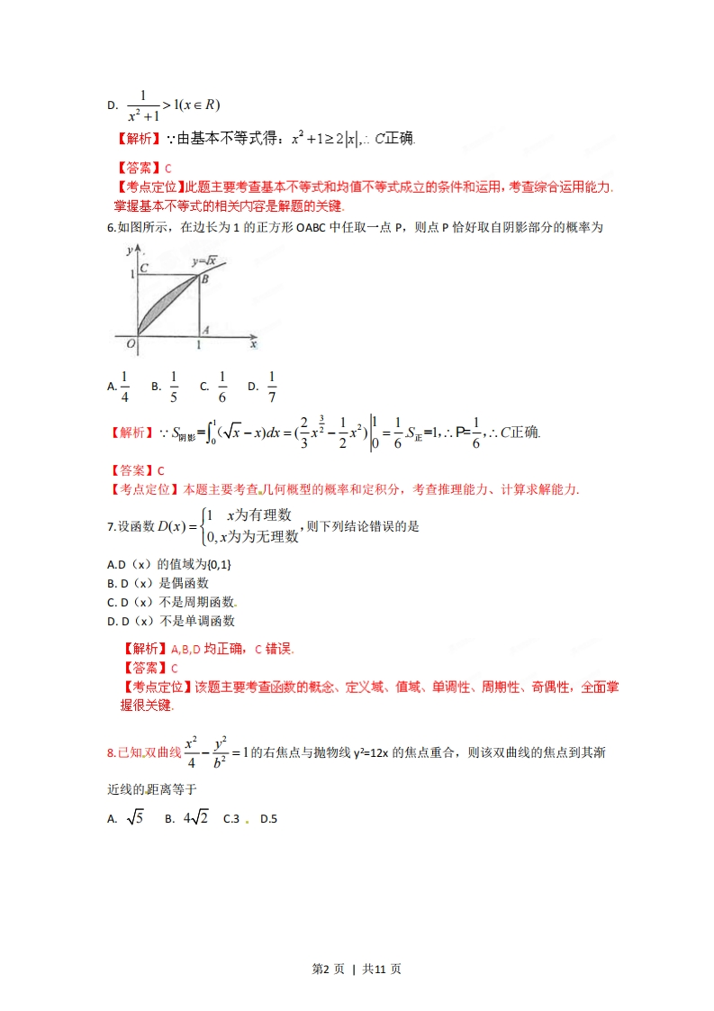 本套试题从新课标的新理念出发,展现了新课程新考纲的新观念考点覆盖全面,考查知识方法的同时考查能力、思想和方法,没有忘记创新,特别是第15、17题.2012年福建省高考理科数学真题解析(专版)第1卷(选择题共50分)一、选择题:本大题共10小题,每小题5分,共50分。在每小题给出分四个选项中,只有一项是符合题目要求的1.若复数z满足zi=1-i,则z等于A.-1-iB.1-iC.-1+iD.1=i1-i【解析】…z=二=-1-i.:正确【答案】A【考点定位】本题主要考查复数的代数运算,主要掌握复数四侧运算法则2.等差数列{an}中,a1+a5=10,au=7,则数列{an}的公差为A.1B.2C3D.4【解析】a,+a=10,.2a,+4d=10,a,=a,+3d=7,∴.d=2.【答案】B【考点定位】该题主要考查等差数列的通项公式,考查计算求解能力,3.下列命题中,真命题是A.3x∈R,e≤0B.x∈R,2>x2C.a+b=0的充要条件是9=-1bD.a>1,b>1是ab>1的充分条件【解析】A,B,C均错,D正确【答案】D【考点定位】此题主要考查逻辑用语中的充分必要条件,考查逻辑推理能力、分析判断能力、必然与或然的能力4.一个几何体的三视图形状都相同、大小均相等,那么这个几何体不可以是A.球B.三棱柱C.正方形D.圆柱【解析】分别比较A,B,C的三视图不符合条件,D符合.【答案】D【考点定位】考查空间几何体的三视图与直观图,考查空间想象能力、逻辑推理能力.5.下列不等式一定成立的是A.log(x2+)>Ig x(x>0)1B.Sinx+-≥2(x≠kπ,k∈z)sinxc.3x2+1≥2x(x∈R)第1页|共11页D.、1->1(x∈R)x2+11【解析】:由基本不等式得:x2+122,C正确【答案】C【考点定位】此题主要考查基本不等式和均值不等式成立的条件和运用,考查综合运用能力,掌握基本不等式的相关内容是解题的关键6.如图所示,在边长为1的正方形OABC中任取一点P,则点P恰好取自阴影部分的概率为A.-B.C.-D.-6解桥】Sa=-x=(2-7)n三S=C正066【答案】C【考点定位】本题主要考查几何概型的概率和定积分,考查推理能力、计算求解能力,[1x为有理数7.设函数D(x)=,则下列结论错误的是0,x为为无理数A.D(x)的值域为{O,1}B.D(x)是偶函数C.D(x)不是周期函数D.D(x)不是单调函数【解析】A,B,D均正确,C错误【答案】C【考点定位】该题主要考查函数的慨念、定义域、值域、单调性、周期性、奇偶性,全面掌握很关键8.已知双曲线x2 y2462=1的右焦点与抛物线y2=12x的焦点重合,则该双曲线的焦点到其渐近线的距离等于A.5B.4W2C.3.D.5第2页|共11页【解析】抛物线的焦点是(3,0),:双曲线的半焦距c=3,4+62=3.6=5.a=4一条渐近线方程为:y=55x3-4×0即5x-2y=0,d==5V5+(-2)2【答案】A【点考点定位】本题主要考察双曲线、抛物线的标准方程、几何性质、点和直线的位置关系,考查推理论证能力、逻辑思维能力、计算求解能力、数形结合思想、转化化归思想x+y-3≤09.若直线y=2x上存在点(x,y)满足约束条件x-2y-3≤0,则实数m的最大值为x≥mA.-1B.1D.22【解析】:x+y-3=0和y=2x交点为(1,2),只有m≤1才能符合条件.B正确.【答案】B【考点定位】本题主要考察一元二次不等式表示平面区域,考查分析判断能力、逻辑推理能力和求解能力10.函数f(x)在a,上有定义,若对任意,∈a,,有f西)≤[fG)+f月2则称f(x)在[a,b)上具有性质P.设f(x)在[13引上具有性质P,现给出如下命题:①f(x)在[1,3引上的图像是连续不断的:②f(x)在1,√3]上具有性质P:③若f(x)在=2处取得最大值1,则f(x)=1,x∈[1,3]:④对任意,,,x∈,3动有f店+品++立)≤fx)+,Hf,H】其中真命题的序号是A.①②B.①③c.②④D.③④【解析】正确理解和推断可知①②错误,③④正确.【答案】D【考点定位】此题主要考察函数的概念、图象、性质,考查分析能力、推理论断能力,数形结合思想、转化化归思想,第Ⅱ卷(非选择题共100分)二、填空题:本大题共5小题,每小题4分,共20分,把答案填在答题卡的相应位置。11.(a+x)4的展开式中x3的系数等于8,则实数a=第3页|共11页