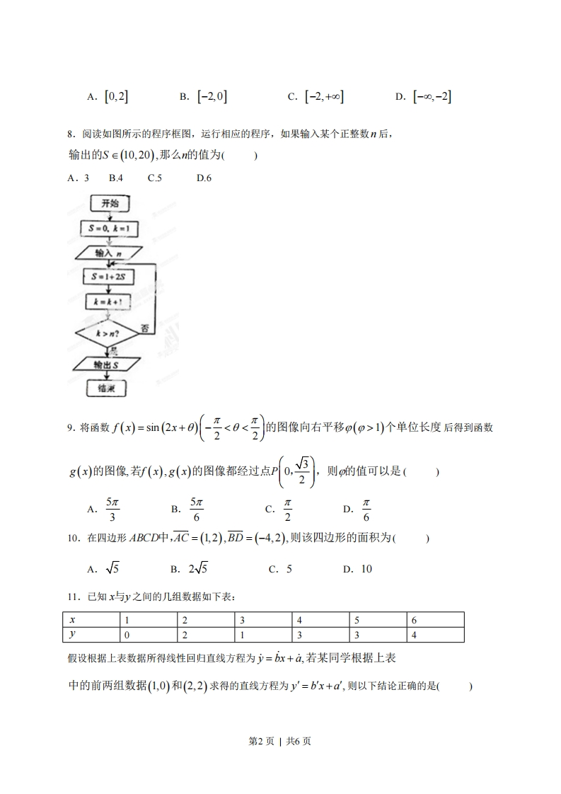 绝密★启用前2013年普通高等学校招生全国统一考试(福建卷)数学试题(文史类)第I卷(选择题共60分)一、选择题:本大题共12小题,每小题5分,共60分.在每小题给出的四个选项中,只有一项是符合题目要求的,1.复数的Z=-1-2i(为虚数单位)在复平面内对应的点位于模为(A.第一象限B.第二象限C.第三象限D.第四象限2.设点P(x,y),则“x=2且y=-P是“点P在直线1:x+y-1=0上”的()A.充分而不必要条件B.必要而不充分条件C.充分必要条件D.既不充分也不必要条件3.若集合A={1,2,3},B={1,3,4},则A⌒B的子集个数为A.2B.3C.4D.164.双曲线x2-y2=的顶点到其渐近线的距离等于(C.1D.5.函数f(x)=lnx2+1的图像大致是(x+y≤26.若变量x,y满足约束条件x21,则z=2x+y的最大值和最小值分别为(y≥0,A.4和3B.4和2C.3和2D.2和07.若2+2'=1,则x+的取值范围是(第1页|共6页A.[0,2]B.[-2,0]c.[-2,+w]D.[-0,-2]8.阅读如图所示的程序框图,运行相应的程序,如果输入某个正整数后,输出的Se(10,20),那么n的值为()A.3B.4c.5D.6开始S=0.k=1S=1+2输出S结9.将函数f()=sin2x+)-子<0<号的图像向右平移p(o>个单位长度后得到函数g(x)的图像,若f(x),g(x)的图像都经过点P则的值可以是(号B.Szπ6c.D君10.在四边形ABCD中,AC=(1,2),BD=(-4,2),则该四边形的面积为(A.5B.25C.5D.1011.己知x与y之间的几组数据如下表:123456y02334假设根据上表数据所得线性回归直线方程为少=bx+ā,若某同学根据上表中的前两组数据(1,0)和(2,2)求得的直线方程为y'=b'x+d,则以下结论正确的是(第2页|共6页A.b>b',a>a'B.b>b',a