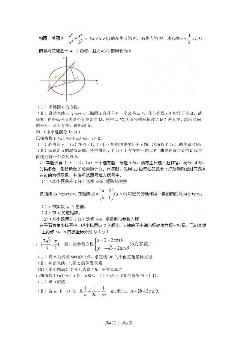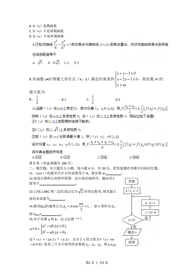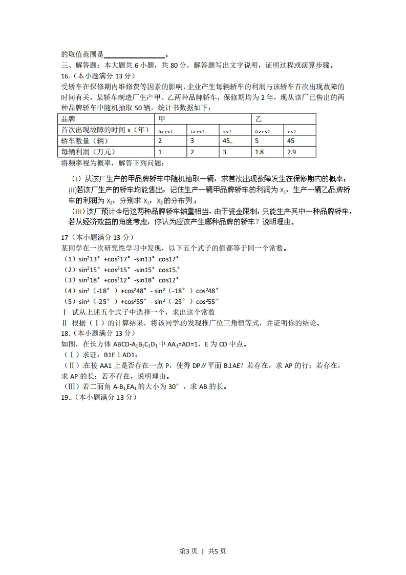 2012年福建省高考理科数学第1卷(选择题共50分)一、选择题:本大题共10小题,每小题5分,共50分。在每小题给出分四个选项中,只有一项是符合题目要求的。·1.若复数z满足i=1-,则z等于A-1-lB.1-iC.-1+lD.1=i2.等差数列{an}中,a1+as=10,au=7,则数列{an}的公差为A.1B.2C3D.43.下列命题中,真命题是A.3x∈R,e≤0B.x∈R,2*>x2c.a+b=0的充要条件是2=-1bD.a>1,b>1是ab>1的充分条件4.一个几何体的三视图形状都相同、大小均相等,那么这个几何体不可以是A.球B.三棱柱C.正方形D.圆柱5.下列不等式一定成立的是A.log()1B.Sinx+-≥2(x≠kπ,k∈z)sinC.x2+122x(x∈R)D.x+>Ix∈R)6如图所示,在边长为1的正方形OABC中任取一点P,则点P恰好取自阴影部分的概率为y反1A.B.C.D.4561x为有理数7.设函数D(x)=,则下列结论错误的是0,x为为无理数A.D(x)的值域为{O,1}第1页|共5页B.D(x)是偶函数C.D(x)不是周期函数D.D(x)不是单调函数8已知双曲线、y4~方=1的右焦点与抛物线yP=12x的焦点重合,则该双曲线的焦点到其渐近线的距离等于A.5B.42C.3.D.5x+y-3≤09.若函数y=2*图像上存在点(x,y)满足约束条件x-2y-3≤0,则实数m的x≥m大值为AB.1D.2函数f(x)在a,止有定义,若对任意,∈a,,有f(西十形)≤[f(x)+f(】则称f(x)在[a,b1上具有性质P。设i(x)在1,3上具有性质P,现给出如下命题:①f(x)在[1,3引上的图像时连续不断的:②f(x2)在1,√31上具有性质P③若f(x)在x=2处取得最大值1,则f(x)=1,x∈[1,3引:④对任意,,,X∈1,3引有(西+西+5+)s[()+f()t(s)/(x】4其中真命题的序号是A.①②B.①③c.②④D.③④第Ⅱ卷(非选择题共100分)二、填空题:本大题共5小题,每小题4分,共20分,把答案填在答题卡的相应位置。11.(a+x)4的展开式中x的系数等于8,则实数a=12.阅读右图所示的程序框图,运行相应地程序,输出的s值等于」开始13.已知△ABC得三边长成公比为√2的等比数列,则其最大k=1,5=角的余弦值为14.数列a的通项公式a,=ncos”7+1,前n项和为5n,=k+2则S20122■2-k15.对于实数a和b,定义运算“*”是k<42a2-ab,(a≤b),a*b=否b2-ab,(a>b),输出s设f(x)=(2x-1)*(x1),且关于x的方程为f(x)=m(m∈R)恰有三个互不相等的实数根x1,X2,X,则x12X3结束第2页1共5页的取值范围是」三、解答题:本大题共6小题,共80分,解答题写出文字说明,证明过程或演算步骤。16.(本小题满分13分)受轿车在保修期内维修费等因素的影响,企业产生每辆轿车的利润与该轿车首次出现故障的时间有关,某轿车制造厂生产甲、乙两种品牌轿车,保修期均为2年,现从该厂己售出的两种品牌轿车中随机抽取50辆,统计书数据如下:品牌甲乙首次出现故障的时间×(年)0cxslIcxs2x320cxs2x32轿车数量(辆)2345.545每辆利润(万元》1231.82.9将频率视为概率,解答下列问题:(1)从该厂生产的甲品牌轿车中随机抽取一辆,求首次出现故障发生在保修期内的概率,仙若该厂生产的轿车均能售出,记住生产一辆甲品牌轿车的利润为X,生产一辆乙品牌轿车的利润为X2,分别求X,X的分布列,()该厂预计今后这两种品牌轿车销量相当,由于资金限制,只能生产其中一种品牌轿车,若从经济效益的角度考虑,你认为应该产生娜种品牌的轿车?说明理由。17(本小题满分13分)某同学在一次研究性学习中发现,以下五个式子的值都等于同一个常数。(1)sin213°+cos217°-sin13°cos17°(2)sin215°+cos215°-sin15°cos15.°(3)sin218°+cos212°-sin18°cos12(4)sin2(-18°)+cos248°-sin2(-18°)cos248°(5)sin2(-25°)+cos255°-sin2(-25°)cos255I试从上述五个式子中选择一个,求出这个常数Ⅱ根据(I)的计算结果,将该同学的发现推广位三角恒等式,并证明你的结论。18.(本小题满分13分)如图,在长方体ABCD-A1B1C1D1中AA1=AD=1,E为CD中点。(I)求证:B1E⊥AD1:(I)在棱AA1上是否存在一点P,使得DP∥平面B1AE?若存在,求AP的行:若存在,求AP的长:若不存在,说明理由。(Ⅲ)若二面角A-B1EA的大小为30°,求AB的长。19。(本小题满分13分)第3页1共5页