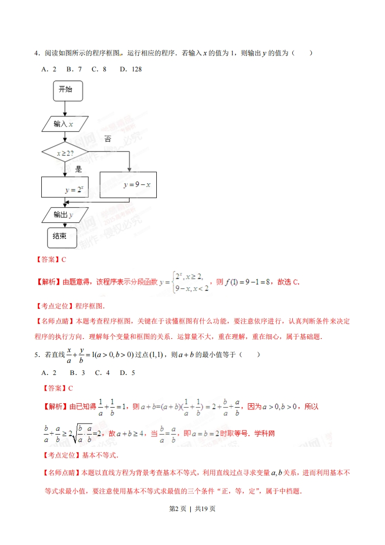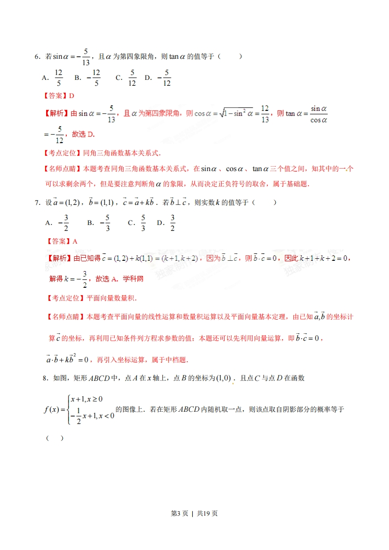 2015年普通高等学校招生全国统一考试(福建卷)数学(文史类)第I卷(选择题共60分)一、选择题:本题共12小题,每小题5分,共60分,在每小题给出的四个选项中,只有一项是符合题目要求的1.若(1+)+(2-3)=a+bi(a,b∈R,i是虚数单位),则a,b的值分别等于()A.3,-2B.3,2C.3,-3D.-1,4【答案】A【解析】学科网由已知得3-2i=a+bi,所以a=3.b=-2,选A.【考点定位】复数的概念。【名师点睛】本题考查复数相等的充要条件和复数运算,利用复数相等可以确定参数的取值,属于基础题,但是要注意运算准确.2.若集合M={x-2≤x<2},N={0,1,2},则M∩N等于()A.{0}B.{C.{0,1,2}D{0,1}【答案】D【解析】由交集定义得M∩V={0,1},故选D.【考点定位】集合的运算.【名师点睛】本题考查集合的交集运算,理解交集的含义是正确解答的前提,属于基础题。3.下列函数为奇函数的是()A.y=x B.y=e*C.y=cosx D.y=e*-e*【答案】D【解析】函数y=√x和y=e是非奇非偶函数;y=cosx是偶函数;y=e-e是奇函数,故选D.【考点定位】函数的奇偶性.【名师点睛】本题考查函数的奇偶性,除了要掌握奇偶性定义外,还要深刻理解其定义域特征即定义域关于原点对称,否则即使满足定义,但是不具有奇偶性,属于基础题.第1页|共19页4.阅读如图所示的程序框图,运行相应的程序.若输入x的值为1,则输出y的值为()A.2B.7C.8D.128开始输入x否x222是y=2y=9-x输出y结東侵权必【答案】C【解析】由题意得,该程序表示分段函数y=2,x22,则f(①=9-1=8,故选C.9-x,x<2【考点定位】程序框图.【名师点睛】本题考查程序框图,关键在于读懂框图有什么功能,要注意依序进行,认真判断条件来决定程序的执行方向.理解每个变量和框图的关系.运算量不大,重在理解,重在细心,属于基础题,5.若直线'+兰=1(a>0,b>0)过点(L,),则a+b的最小值等于()a bA.2B.3C.4D.5【答案】C【解折】已知得+=1,则a+-a+2+=2+2+,因为a>0,5>0,所以a babb a.日2,故a+6≥4,当=,即a=b=2时取等号.学科网a b【考点定位】基本不等式【名师点睛】本题以直线方程为背景考查基本不等式,利用直线过点寻求变量α,b关系,进而利用基本不等式求最小值,要注意使用基本不等式求最值的三个条件“正,等,定”,属于中档题,第2页|共19页,且a为第四象限角,则ana的值等于()6.若sin=-A号。号5C.12D.-【答案】D【解析】由sina=-,且ax为第四象限角,侧c0sa=V一如a=5sina作一,则tana=cosa512'故选D.【考点定位】同角三角函数基本关系式:【名师点睛】本题考查同角三角函数基本关系式,在sina、cosa、ana三个值之间,知其中的一个可以求剩余两个,但是要注意判断角的象限,从而决定正负符号的取舍,属于基础题,7.设a=(L,2),b=(L,1),c=a+kb.若b⊥c,则实数k的值等于()【答案】A【解析】由已知得c=12)+11)=(k+1.k+2),因为6⊥c,则b-c=0,因此k+1+k+2=0,解得太=子散选入学科网3【考点定位】平面向量数量积.【名师点睛】本题考查平面向量的线性运算和数量积运算以及平面向量基本定理,由己知α,b的坐标计算c的坐标,再利用已知条件列方程求参数的值:本题还可以先利用向量运算,即bC=0,āb+kb=0,再引入坐标运算,属于中档题.8.如图,矩形ABCD中,点A在x轴上,点B的坐标为(I,O).且点C与点D在函数x+1,x20f(x)=的图像上.若在矩形ABCD内随机取一点,则该点取自阴影部分的概率等于亏x+1x≤0第3页|共19页