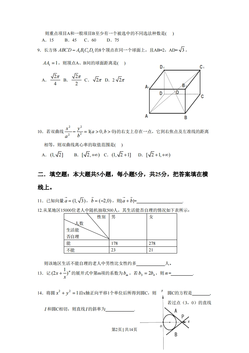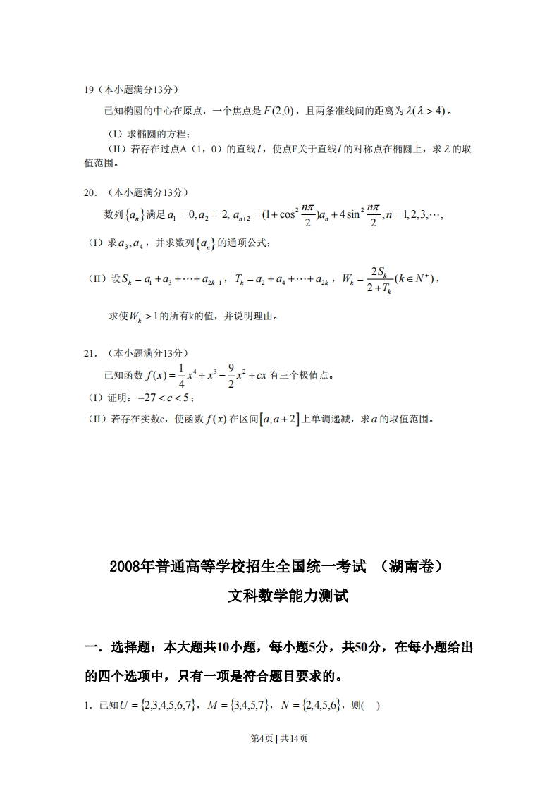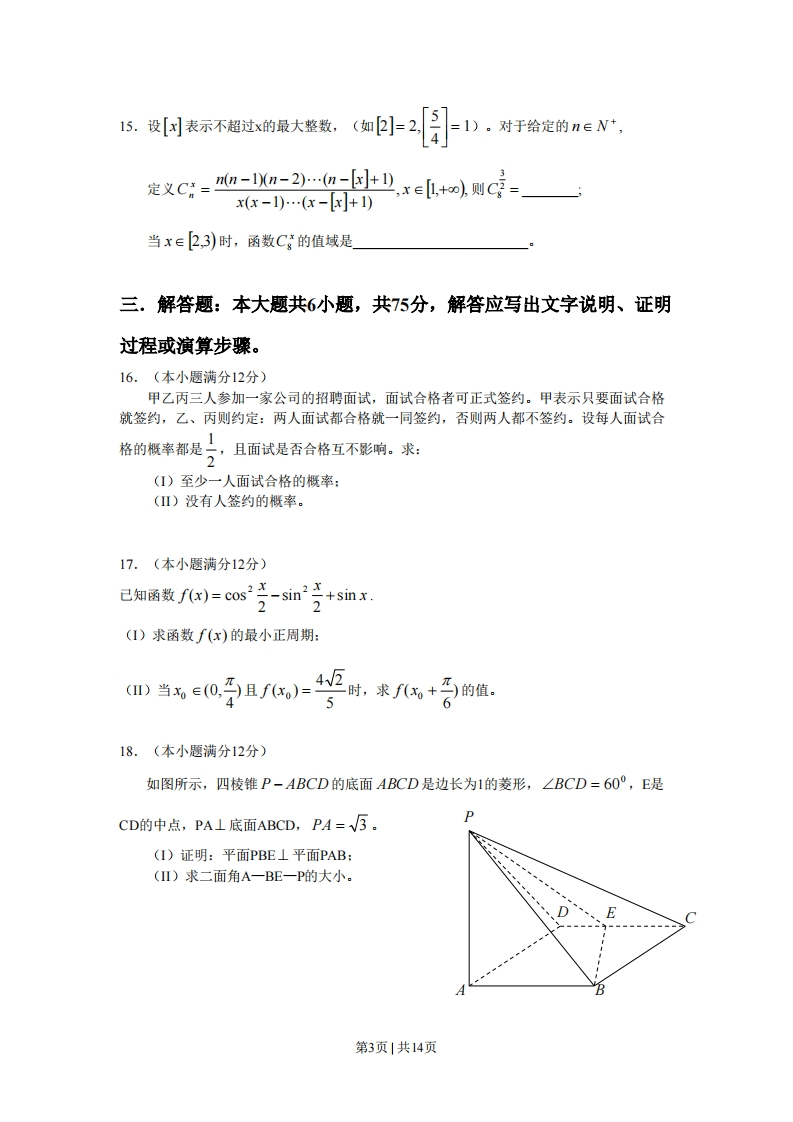 2008年普通高等学校招生全国统一考试(湖南卷)文科数学能力测试一,选择题:本大题共10小题,每小题5分,共50分,在每小题给出的四个选项中,只有一项是符合题目要求的。1.己知U={2,3,4,5,6,7,M={3,4,5,7},N=2,4,5,6},则()A.MN=4,6 B.MUN=UC.(C,N)UM=U D.(CM)nN=N2.“x-1<2”是“x<3”的()A.充分不必要条件B必要不充分条件C.充分必要条件D.既不充分也不必要条件x21,3.已条变量x,y满足y≤2,则x+y的最小值是()x-y≤0,X-y=0A.4B.3C.2D.1y=212)4.函数f(x)=x2(x≤0)的反函数是()2,21,1Af-(x)=Vx(x≥0)B.f1(x)=-V(x≥0)Cf1(x)=-√-x(x≤0)D.f(x)=-x2(x≤0)5.己知直线m,n和平面,B满足m⊥n,m⊥a,a⊥B,则()X=1A.n⊥BB.nl∥B,或nCB Cn⊥aD.n∥,或nca6.下面不等式成立的是()A.log;20,6>0)的右支上存在一点,它到右焦点及左准线的距离相等,则双曲线离心率的取值范围是()A.(L,V2]B.[V2,+o)C.(1,V5+1]D.[5+1,+o)二.填空题:本大题共5小题,每小题5分,共25分,把答案填在横线上。11.已知向量a=(1,V5),b=(-2,0),则1a+b日12.从某地区15000位老人中随机抽取500人,其生活能否自理的情况如下表所示:性别男女人数生活能否自理能178278不能2321则该地区生活不能自理的老人中男性比女性约多人13.记(2x+-)”的展开式中第m项的系数为bm,若b3=2b,,则n=14.将圆x2+y2=1沿x轴正向平移1个单位后所得到圆C,则’圆C的方程是若过点(3,0)的直线1和圆C相切,则直线1的斜率为第2页|共14页15设[冈表示不超过x的最大整数,(=2[月1)。对于给定的n∈N+,定义c:=a-=n-2a-,xeL+则c-x(x-1)…(x-x]+)当x∈2,3)时,函数C的值域是」三.解答题:本大题共6小题,共75分,解答应写出文字说明、证明过程或演算步骤。16.(本小题满分12分)甲乙丙三人参加一家公司的招聘面试,面试合格者可正式签约。甲表示只要面试合格就签约,乙、丙则约定:两人面试都合格就一同签约,否则两人都不签约。设每人面试合格的概率都是,且面试是否合格互不影响。求:(I)至少一人面试合格的概率:(Ⅱ)没有人签约的概率。17.(本小题满分12分)已知函数fx)=cos22-sinsin x.2(I)求函数f(x)的最小正周期:D当c0子且=,来,+为的位.618.(本小题满分12分)如图所示,四棱锥P-ABCD的底面ABCD是边长为1的菱形,∠BCD=6O°,E是CD的中点,PA⊥底面ABCD,PA=√5。(I)证明:平面PBE⊥平面PAB:(I)求二面角A一BE一P的大小.E第3页|共14页