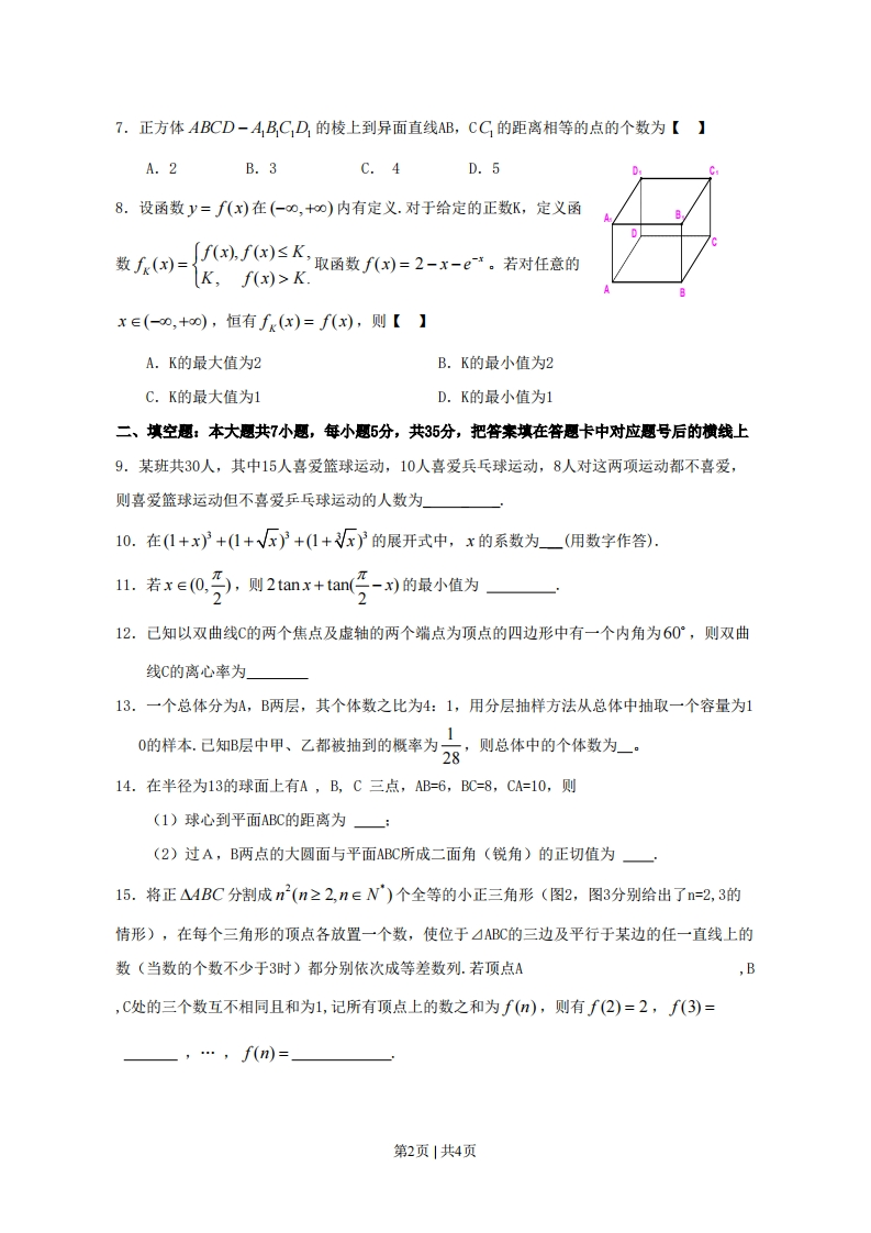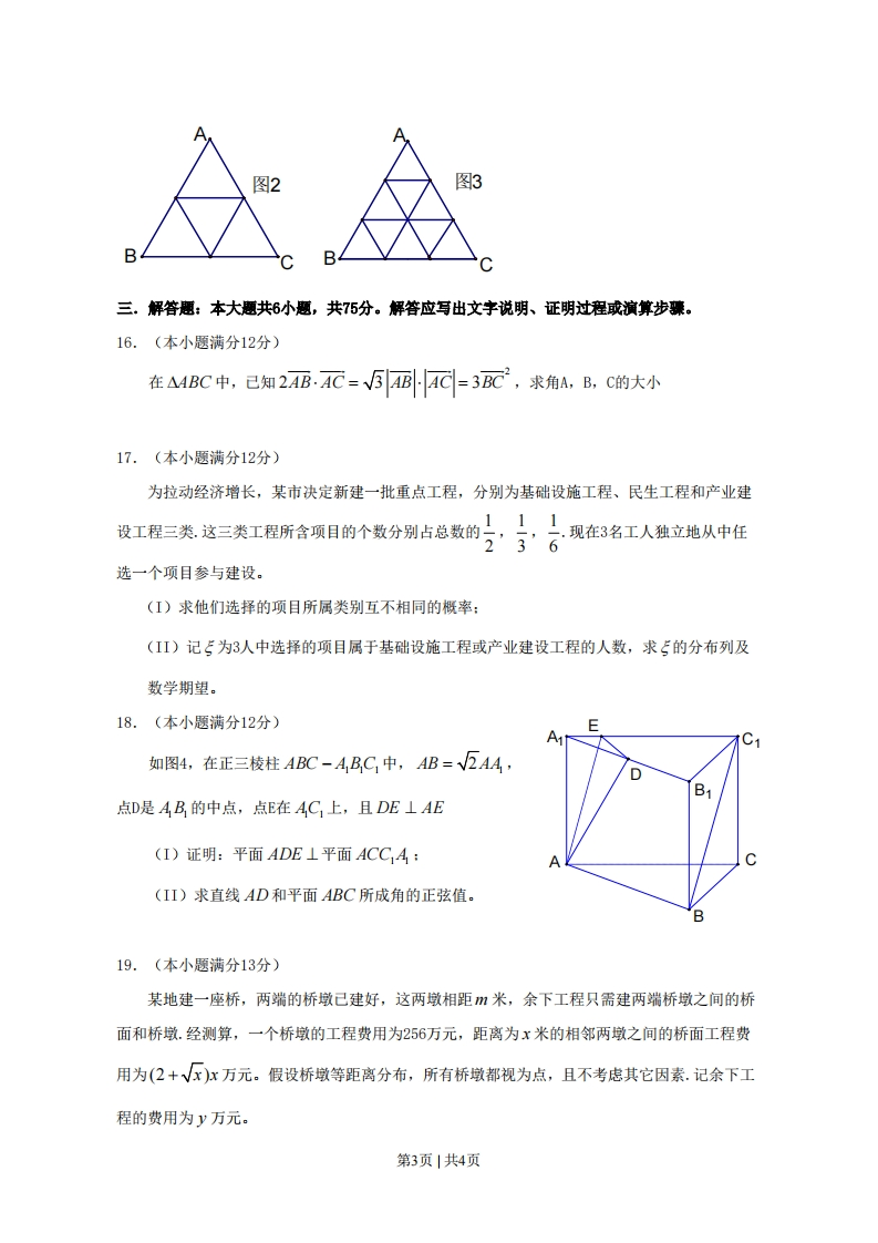 2009年高考数学试卷(理)(湖南)(空白卷)虎虎1个月前发布关注0.17MB4页289 第1页 / 共4页 第2页 / 共4页 第3页 / 共4页 第4页 / 共4页 已完成全部阅读,共4页 2009年高考数学试卷(理)(湖南)(空白卷)此内容为免费资源,请登录后查看¥0 登录查看免费资源THE END数学 文本预览 2009年普通高等学校招生全国统一考试(湖南卷)理科数学一、选舞题:本大题共8小题,每小题5分,共40分。在每小题给出的四个选项中,只有一项是符合题目要求的。1.若log2a<0,()>1,则【】A.a>1,b>0B.a>1,b<0C.00D.0K.x∈(-0,+o),恒有fx(x)=f(x),则【】A.K的最大值为2B.K的最小值为2C.K的最大值为1D.K的最小值为1二、填空题:本大思共7小题,每小题5分,共35分,把答案填在答题卡中对应题号后的横线上9.某班共30人,其中15人喜爱篮球运动,10人喜爱兵乓球运动,8人对这两项运动都不喜爱,则喜爱篮球运动但不喜爱乒乓球运动的人数为10.在(1+x)3+(1+√x)3+(1+x)3的展开式中,x的系数为(用数字作答).1.若xe0,空,则2amx+tam号-)的最小值为12.己知以双曲线C的两个焦点及虚轴的两个端点为顶点的四边形中有一个内角为60°,则双曲线C的离心率为13.一个总体分为A,B两层,其个体数之比为4:1,用分层抽样方法从总体中抽取一个容量为10的样本.己知B层中甲、乙都被抽到的概率为,则总体中的个体数为。2814.在半径为13的球面上有A,B,C三点,AB=6,BC=8,CA=10,则(1)球心到平面ABC的距离为:(2)过A,B两点的大圆面与平面ABC所成二面角(锐角)的正切值为一·15.将正△4BC分割成n(n≥2,n∈N)个全等的小正三角形(图2,图3分别给出了n=2,3的情形),在每个三角形的顶点各放置一个数,使位于△ABC的三边及平行于某边的任一直线上的数(当数的个数不少于3时)都分别依次成等差数列.若顶点A,B,C处的三个数互不相同且和为1,记所有顶点上的数之和为f(),则有f(2)=2,f(3)=_,…,f(n)=」第2页|共4页图2图3三.解答题:本大题共6小题,共75分。解答应写出文字说明、证明过程或演算步骤。16.(本小题满分12分)在△M4BC中,已知2AB.AC=V5AC=3BC,求角A,B,C的大小17.(本小题满分12分)为拉动经济增长,某市决定新建一批重点工程,分别为基础设施工程、民生工程和产业建2工程三类这三类工程所含项目的个数分别占总数的,},(现在3名工人独立地从中国选一个项目参与建设。(I)求他们选择的项目所属类别互不相同的概率:(I)记5为3人中选择的项目属于基础设施工程或产业建设工程的人数,求5的分布列及数学期望。18.(本小题满分12分)EA如图4,在正三棱柱ABC-AB,C,中,AB=V5A4,DB1点D是AB的中点,点E在AC1上,且DE⊥AE(I)证明:平面ADE⊥平面ACC,A:AC(II)求直线AD和平面ABC所成角的正弦值。B19.(本小题满分13分)某地建一座桥,两端的桥墩已建好,这两墩相距m米,余下工程只需建两端桥墩之间的桥面和桥墩.经测算,一个桥墩的工程费用为256万元,距离为x米的相邻两墩之间的桥面工程费用为(2+√x)x万元。假设桥墩等距离分布,所有桥墩都视为点,且不考虑其它因素.记余下工程的费用为y万元。第3页|共4页 查看更多 收起部分 喜欢就支持一下吧点赞9 分享QQ空间微博QQ好友海报分享复制链接收藏