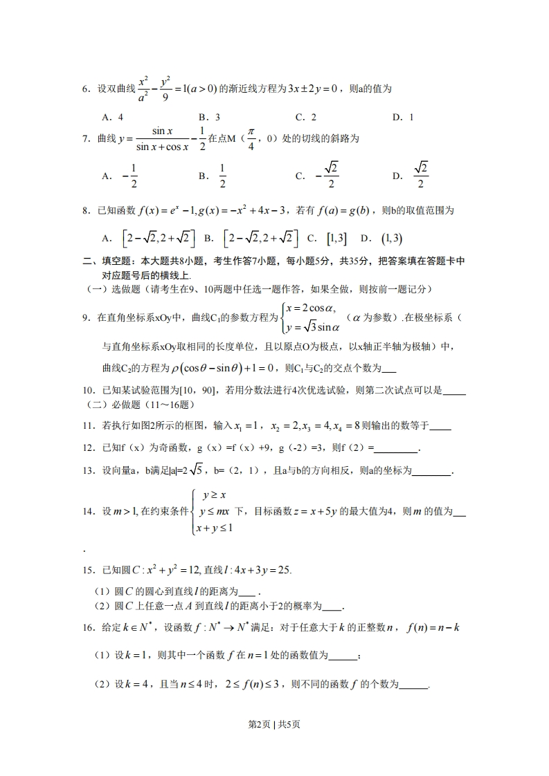2011年普通高等学校招生全国统一考试文科数学(湖南卷)参考公式(1)柱体体积公式V=Sh,其中S为底面面积,h为高.(2)球的体积公式V=πR,其中R为球的半径3一、选择题:本大题共8小题,每小题5分,共40分.在每小题给出的四个选项中,只有一项是符合题目要求的1.设全集U=MUN=(1,2,3,4,5),MnCN=(2,4),则N=A.{1,2,3}B.{1,3,5}C.{1,4,5}D.2,3,4}2.若a,b∈R,i为虚数单位,且(a+i)i=b+i则A.a=1,b=1B.a=-1,b=1C.a=1b=-1D.a=-1,b=-13.“x>1”是“x>1”的A,充分不必要条件B.必要不充分条件正视图侧视图C.充分必要条件D.既不充分又不必要条件4.设图1是某几何体的三视图,则该几何体的体积为A.9π+42B.36π+18c91+129D.3T+18俯视图5.通过随机询问110名性别不同的大学生是否爱好某项运动,得到如的列联表:男女总计爱好402060不爱好203050总计6050110由K2=n(ad-be)2算得,K2=110×(40×30-20×202≈7.8(a+d)(c+d)(a+c)(b+d)60×50×60×50附表:p(K2≥k)0.0500.0100.001k3.8416.63510.828参照附表,得到的正确结论是A.有99%以上的把握认为“爱好该项运动与性别有关”B.有99%以上的把握认为“爱好该项运动与性别无关”C.在犯错误的概率不超过0.1%的前提下,认为“爱好该项运动与性别有关”D.在犯错误的概率不超过0.1%的前提下,认为“爱好该项运动与性别无关”第1页|共5页6。设双曲线女少=1(a>0)的渐近线方程为3x±2y=0,则a的值为A.4B.3C.2D.1Sinxπ7.曲线y=sinx+cosx 2在点M(,0)处的切线的斜路为A.-2B.2D.迈C.28.己知函数f(x)=e-1,g(x)=-x2+4x-3,若有f(a)=g(b),则b的取值范围为A.2-V2,2+5B.2-V2,2+V2C.[1,3]D.(1,3)二、填空题:本大题共8小题,考生作答7小题,每小题5分,共35分,把答案填在答题卡中对应题号后的横线上,(一)选做题(请考生在9、10两题中任选一题作答,如果全做,则按前一题记分)9.在直角坐标系xOy中,曲线C1的参数方程为[=2cos2,(a为参数).在极坐标系(y=V3sina与直角坐标系xOy取相同的长度单位,且以原点O为极点,以x轴正半轴为极轴)中,曲线C2的方程为p(cos0-sin0)+1=0,则C1与C2的交点个数为10.已知某试验范围为[10,90],若用分数法进行4次优选试验,则第二次试点可以是(二)必做题(11~16题)11.若执行如图2所示的框图,输入x=1,x2=2,x3=4,x4=8则输出的数等于12.己知f(x)为奇函数,g(x)=f(x)+9,g(-2)=3,则f(2)=13.设向量a,b满足a=2√5,b=(2,1),且a与b的方向相反,则a的坐标为y≥x14.设m>1,在约束条件y≤x下,目标函数z=x+5y的最大值为4,则m的值为x+y≤115.已知圆C:x2+y2=12,直线1:4x+3y=25(1)圆C的圆心到直线1的距离为(2)圆C上任意一点A到直线1的距离小于2的概率为16.给定k∈N,设函数f:N°→N满足:对于任意大于k的正整数n,f(nm)=n-k(1)设k=1,则其中一个函数f在n=1处的函数值为:(2)设k=4,且当n≤4时,2≤f(n)≤3,则不同的函数f的个数为第2页|共5页三、解答题:本大题共6小题,共75分.解答应写出文字说明、证明过程或演算步骤17.(本小题满分12分)在△ABC中,角A,B,C所对的边分别为a,b,c,且满足c sinA=acosC.(I)求角C的大小:(I)求V3sinA-cos(B+)的最大值,并求取得最大值时角A、B的大小418.(本小题满分12分)某河流上的一座水力发电站,每年六月份的发电量Y(单位:万千瓦时)与该河上游在六月份是我降雨量X(单位:毫米)有关,据统计,当X=70时,Y=460:X每增加10,Y增加5.己知近20年X的值为:140,110,160,70,200,160,140,160,220,200,110,160,160,200,140,110,160,220,140,160.(I)完成如下的频率分布表近20年六月份降雨量频率分布表降雨量70110140160200220频率142202020(Ⅱ)假定今年六月份的降雨量与近20年六月份降雨量的分布规律相同,并将频率是为概率,求今年六月份该水力发电站的发电量低于490(万千瓦时)或超过530(万千瓦时)的概率.19.(本小题满分12分)如图3,在圆锥P0中,己知PO=√2,⊙0的直径AB=2,点C在AB上,且∠CB30,D为AC的中点(I)证明:AC⊥平面POD;(Ⅱ)求直线OC和平面PAC所成角的正弦值,2===二二二D6一“。、A图3第3页|共5页