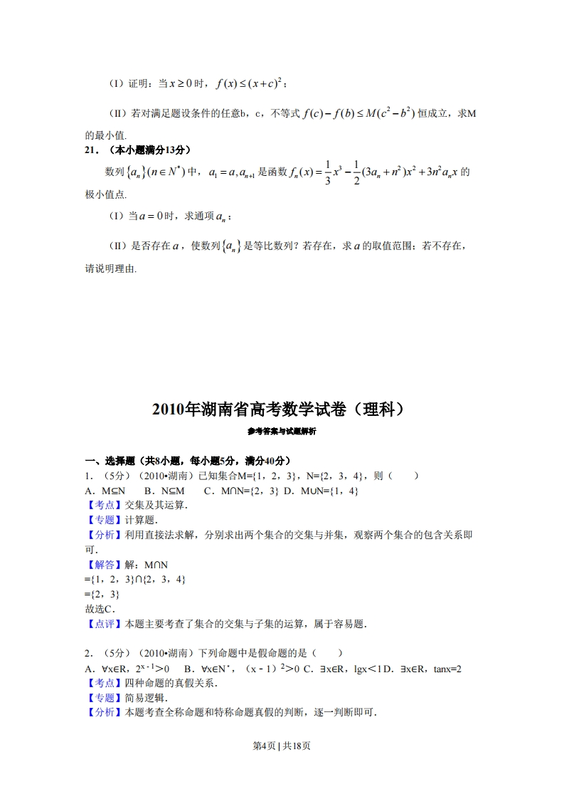 2010年普通高等学校招生全国统一考试(湖南卷)数学(理工农医类)一、选择题:本大题共8小题,每小题5分,共40分.在年小题给出的四个选项中,只有一项是符合题目要求的,1.己知集合M={1,2,3},N={2,3,4},则A.M∈N.B.N∈MC.M∩N={2,3}D.MUN={1,4}2.下列命题中的假命题是A.x∈R,2->0B.x∈N°,(x-l)2>0C.3r∈R,lgx<1D..3r∈R,tanx=2x=-1-t,3.极坐标方程p=c0s0和参数方程(t为参数)所表示的图形分别是y=2+3tA.圆、直线B.直线、圆C.圆、圆D.直线、直线4.在R△4BC中,∠C=90°,AC=4,则ABAC等于A.-16B.-8C.8D.16于A.-21n2B.21n2C.-In2.D.In26.在△4BC中,角A,B,C所对的边长分别为a,b,c.若∠C=120°,c=√2a,则A.a>bB.a