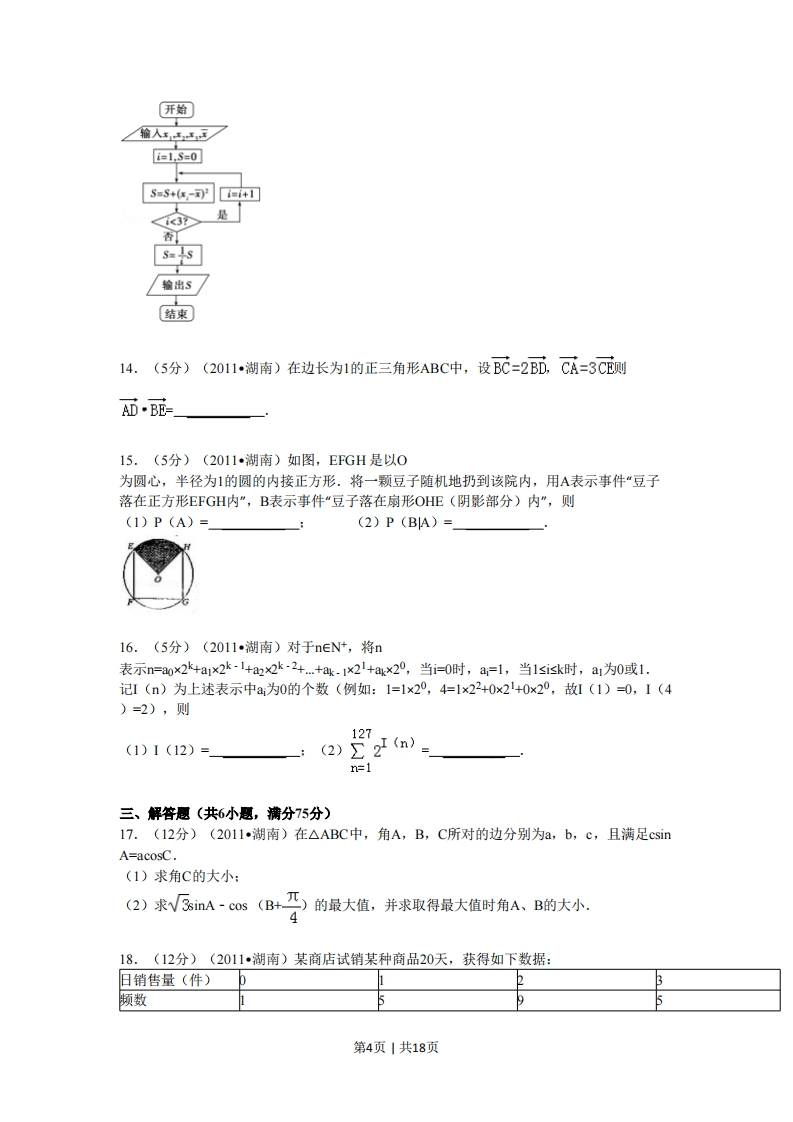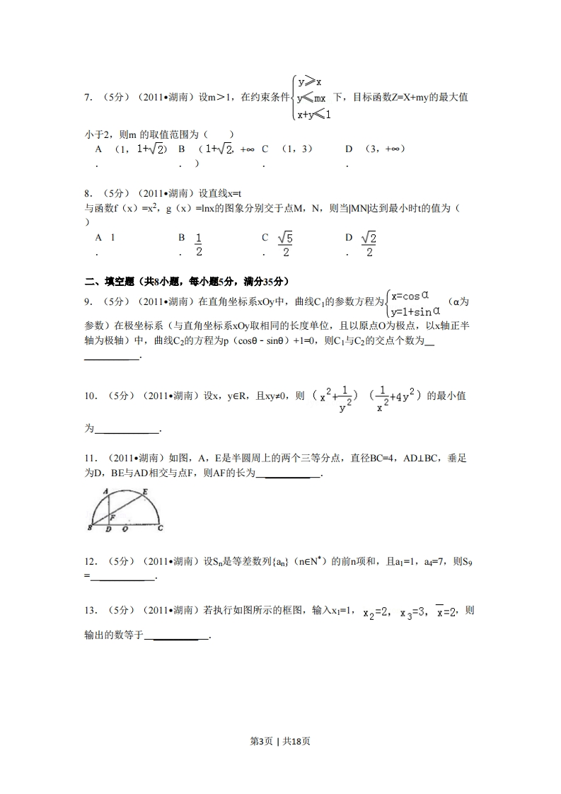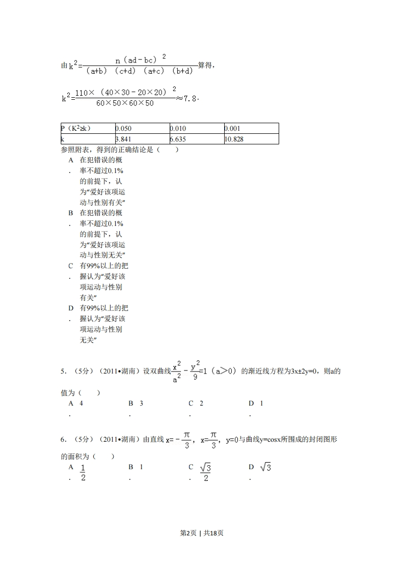 2011年普通高等学校招生全国统一考试(湖南卷)数学(理工农医类)参考公式:(1)P(BA)=PAB,其中4B为两个事件,且P(④>0,P(A)(2)柱体体积公式V=Sh,其中S为底面面积,h为高。(3)球的体积公式V=号xR,其中R为求的半径。一、选择题(共8小题,每小题5分,满分40分)1.(5分)(2011湖南)若a,beR,i为虚数单位,且(a+i)i=b+i则()Aa=1,b=1Ba=-1,b=1Ca=-1,b=-1Da=1,b=-12.(5分)(2011·湖南)设集合M={1,2},N={a2},则“a=1"是NcM的()A充分不必要条B必要不充分条·件件C充分必要条件D既不充分又不必要条件3.(5分)(2011·湖南)设如图是某几何体的三视图,则该几何体的体积为()正找图侧视图视捆A9m+42B36+18C2r+122D9元+184.(5分)(2011,湖南)通过随机询问110名性别不同的大学生是否爱好某项运动,得到如下的列联表:男女总计爱好402060不爱好20Bo50总计6050110第1页|共18页n (ad-bc)2由k2=atb)(c+a(atc)(b+d)算得,k2_110×(40×30-20×20)2≈7.860×50×60×50P(K2zk)p.050D.010p.001B.8415.63510.828参照附表,得到的正确结论是()A在犯错误的概率不超过0.1%的前提下,认为“爱好该项运动与性别有关”B在犯错误的概率不超过0.1%的前提下,认为“爱好该项运动与性别无关”C有99%以上的把握认为“爱好该项运动与性别有关”D有99%以上的把握认为“爱好该项运动与性别无关”5.(5分)(201,湖南)设双曲线之2-亏-Y。=1(a>0)的渐近线方程为3x±2y-0,则a的值为()A4B3C2D16.5分)(201,潮南)由直线x-子,X于,y0与曲线yo0所围成的封闭图形的面积为()A1B 1C 3DV3.22第2页|共18页7.(5分)(2011湖南)设m>1,在约束条件y