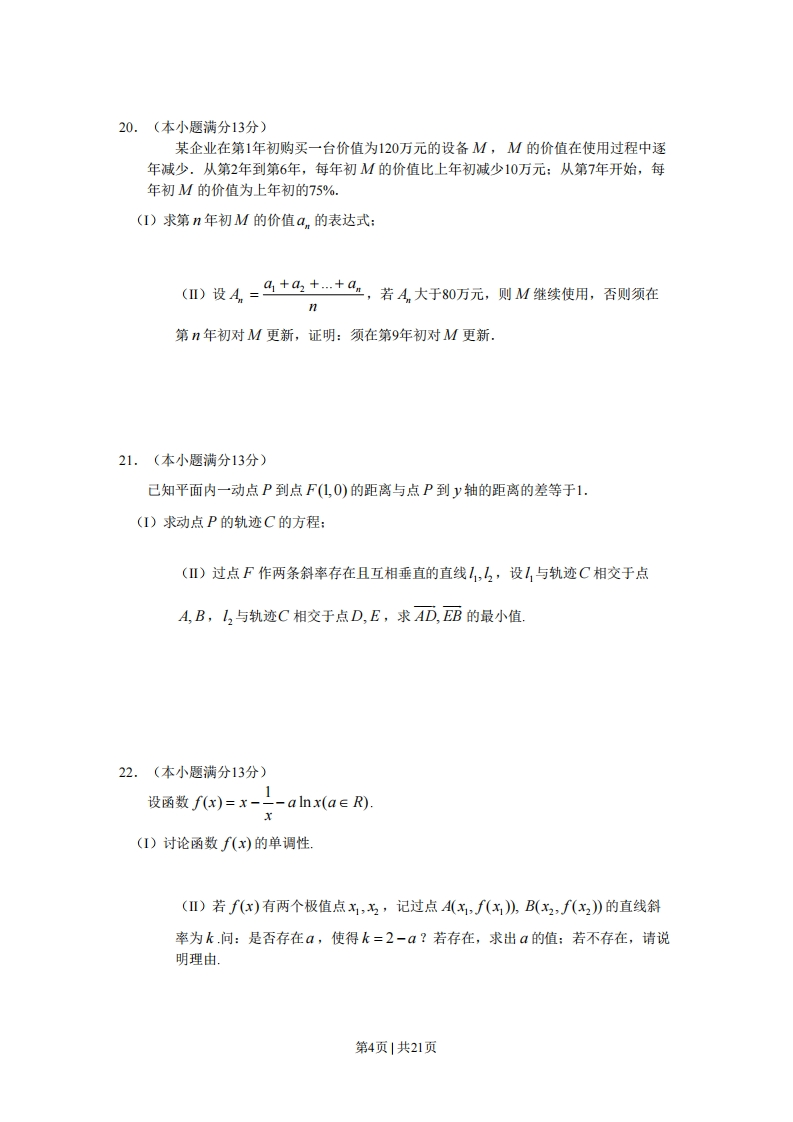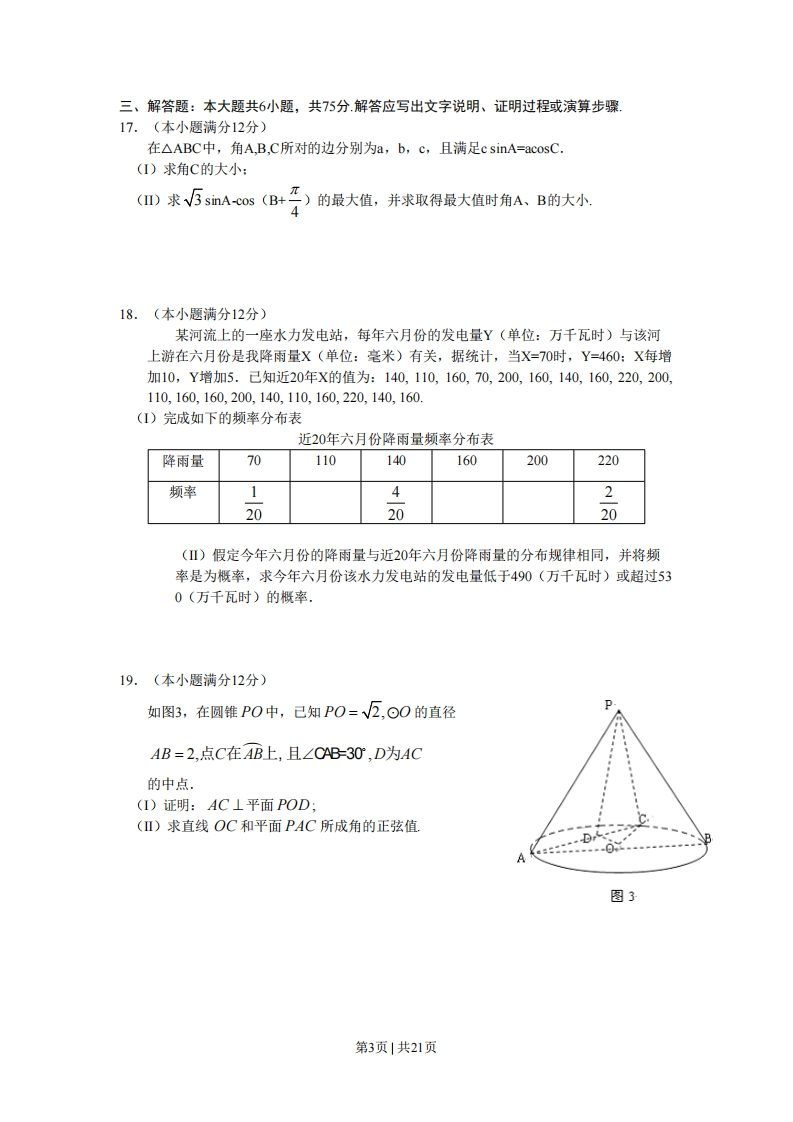 2011年普通高等学校招生全国统一考试文科数学(湖南卷)参考公式(1)柱体体积公式V=Sh,其中S为底面面积,h为高.(2)球的体积公式V=πR,其中R为球的半径3一、选择题:本大题共8小题,每小题5分,共40分.在每小题给出的四个选项中,只有一项是符合题目要求的1.设全集U=MUN=(1,2,3,4,5),MnCN=(2,4),则N=A.{1,2,3}B.{1,3,5}C.{1,4,5}D.2,3,4}2.若a,b∈R,i为虚数单位,且(a+i)i=b+i则A.a=1,b=1B.a=-1,b=1C.a=1b=-1D.a=-1,b=-13.“x>1”是“x>1”的A,充分不必要条件B.必要不充分条件正视图侧视图C.充分必要条件D.既不充分又不必要条件4.设图1是某几何体的三视图,则该几何体的体积为A.9π+42B.36π+18c91+129D.3T+18俯视图5.通过随机询问110名性别不同的大学生是否爱好某项运动,得到如的列联表:男女总计爱好402060不爱好203050总计6050110由K2=n(ad-be)2算得,K2=110×(40×30-20×202≈7.8(a+d)(c+d)(a+c)(b+d)60×50×60×50附表:p(K2≥k)0.0500.0100.001k3.8416.63510.828参照附表,得到的正确结论是A.有99%以上的把握认为“爱好该项运动与性别有关”B.有99%以上的把握认为“爱好该项运动与性别无关”C.在犯错误的概率不超过0.1%的前提下,认为“爱好该项运动与性别有关”D.在犯错误的概率不超过0.1%的前提下,认为“爱好该项运动与性别无关”第1页1共21页6。设双曲线女少=1(a>0)的渐近线方程为3x±2y=0,则a的值为A.4B.3C.2D.1Sinxπ7.曲线y=sinx+cosx 2在点M(,0)处的切线的斜路为A.-2B.2D.迈C.28.己知函数f(x)=e-1,g(x)=-x2+4x-3,若有f(a)=g(b),则b的取值范围为A.2-V2,2+5B.2-V2,2+V2C.[1,3]D.(1,3)二、填空题:本大题共8小题,考生作答7小题,每小题5分,共35分,把答案填在答题卡中对应题号后的横线上,(一)选做题(请考生在9、10两题中任选一题作答,如果全做,则按前一题记分)9.在直角坐标系xOy中,曲线C1的参数方程为[=2cos2,(a为参数).在极坐标系(y=V3sina与直角坐标系xOy取相同的长度单位,且以原点O为极点,以x轴正半轴为极轴)中,曲线C2的方程为p(cos0-sin0)+1=0,则C1与C2的交点个数为10.已知某试验范围为[10,90],若用分数法进行4次优选试验,则第二次试点可以是(二)必做题(11~16题)11.若执行如图2所示的框图,输入x=1,x2=2,x3=4,x4=8则输出的数等于12.己知f(x)为奇函数,g(x)=f(x)+9,g(-2)=3,则f(2)=13.设向量a,b满足a=2√5,b=(2,1),且a与b的方向相反,则a的坐标为y≥x14.设m>1,在约束条件y≤x下,目标函数z=x+5y的最大值为4,则m的值为x+y≤115.已知圆C:x2+y2=12,直线1:4x+3y=25(1)圆C的圆心到直线1的距离为(2)圆C上任意一点A到直线1的距离小于2的概率为16.给定k∈N,设函数f:N°→N满足:对于任意大于k的正整数n,f(nm)=n-k(1)设k=1,则其中一个函数f在n=1处的函数值为:(2)设k=4,且当n≤4时,2≤f(n)≤3,则不同的函数f的个数为第2页1共21页三、解答题:本大题共6小题,共75分.解答应写出文字说明、证明过程或演算步骤17.(本小题满分12分)在△ABC中,角A,B,C所对的边分别为a,b,c,且满足c sinA=acosC.(I)求角C的大小:(I)求V3sinA-cos(B+)的最大值,并求取得最大值时角A、B的大小418.(本小题满分12分)某河流上的一座水力发电站,每年六月份的发电量Y(单位:万千瓦时)与该河上游在六月份是我降雨量X(单位:毫米)有关,据统计,当X=70时,Y=460:X每增加10,Y增加5.己知近20年X的值为:140,110,160,70,200,160,140,160,220,200,110,160,160,200,140,110,160,220,140,160.(I)完成如下的频率分布表近20年六月份降雨量频率分布表降雨量70110140160200220频率142202020(Ⅱ)假定今年六月份的降雨量与近20年六月份降雨量的分布规律相同,并将频率是为概率,求今年六月份该水力发电站的发电量低于490(万千瓦时)或超过530(万千瓦时)的概率.19.(本小题满分12分)如图3,在圆锥PO中,己知PO=√2,⊙0的直径AB=2,点C在AB上,且∠CB30,D为AC的中点(I)证明:AC⊥平面POD;(Ⅱ)求直线OC和平面PAC所成角的正弦值,====二-D6一、A图3第3页|共21页